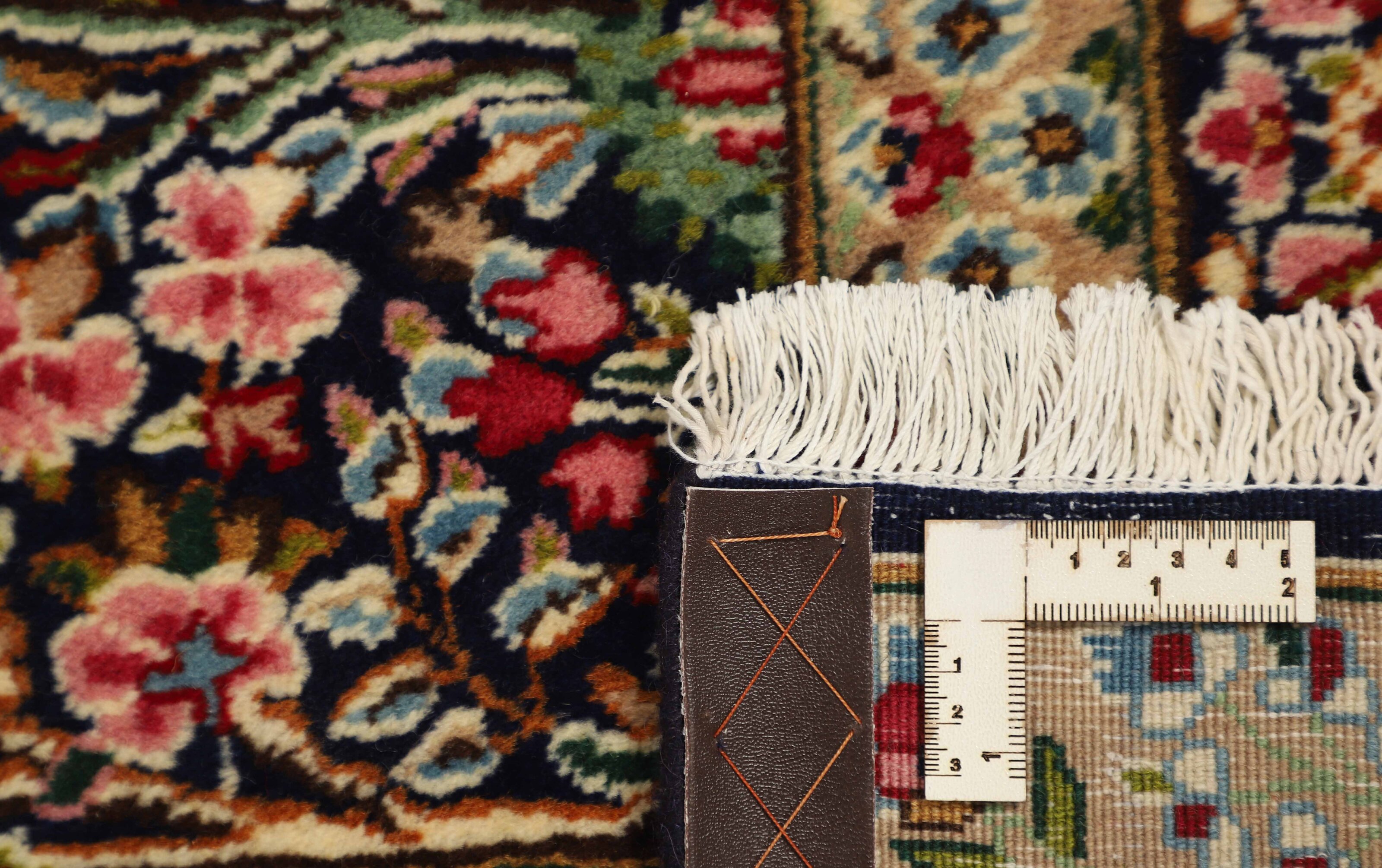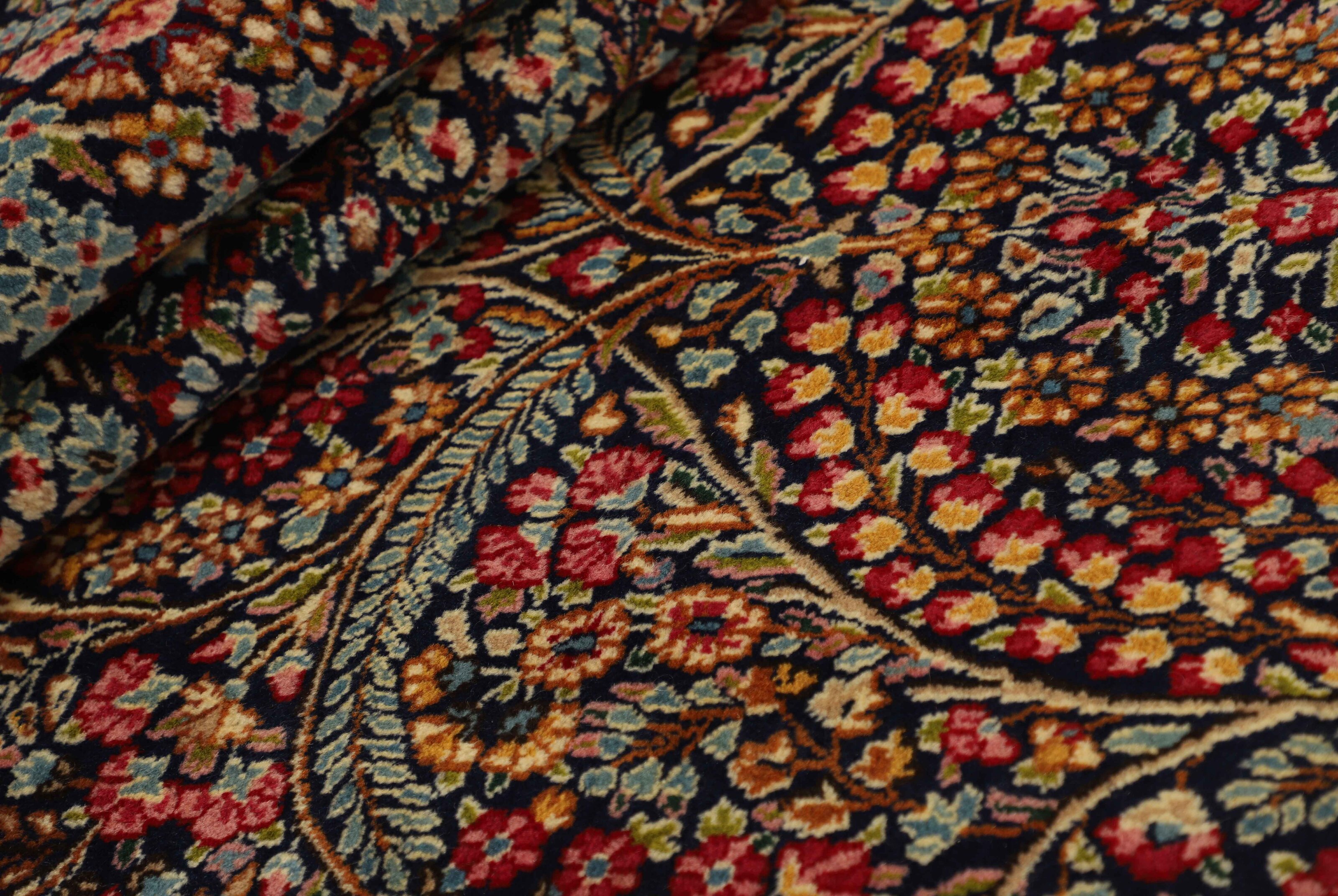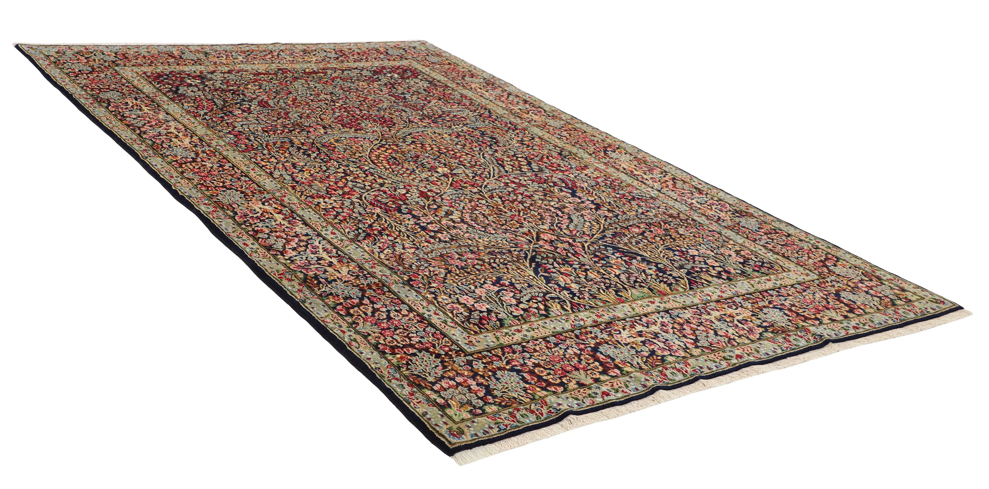 KermanItem no.: 1519722 Size: 200 cm x 290 cmThe city of Kerman lies in south-eastern Iran, on the edge of the Kavir-e-Lut Desert, and is the capitol of the Kerman province, which has about half a million inhabitants. Its geographical isolation has ensured the preservation of many monuments – there is said to be 90 mosques – and a 15th century mausoleum in nearby Mahan is said to be the most beautiful building in Iran. Like Yazd to the northwest, Kerman has a large population of Zoroastrians, who adhere to Iran’s ancient religion, which in other places has been replaced by Islam. The silhouette of Kerman is characterised by its wind towers – chimney like constructions used to catch every breeze and lead them down to the inner parts of the house. Kerman has an ancient textile tradition, and shawls were woven through large parts of the 19th century. When the demand for shawls fell, the weavers changed their looms for rug production. Initially, they used the same patterns they had used in the shawls, but they adapted them as fashion changed, although the Kerman rugs kept their delicate colours and patterns. All sizes are made. The largest rugs have unique colours and patterns, and are often knotted in the northern towns of Lavar or Ravar. Apart from the shawl patterns, Kerman often has adaptations of the Boteh- motif with natural bouquets of flowers, or adaptations of classical rug patterns. A wide range of delicate colours is used. The pile is normally soft, velvet like wool, while warp and weft are always cotton.
