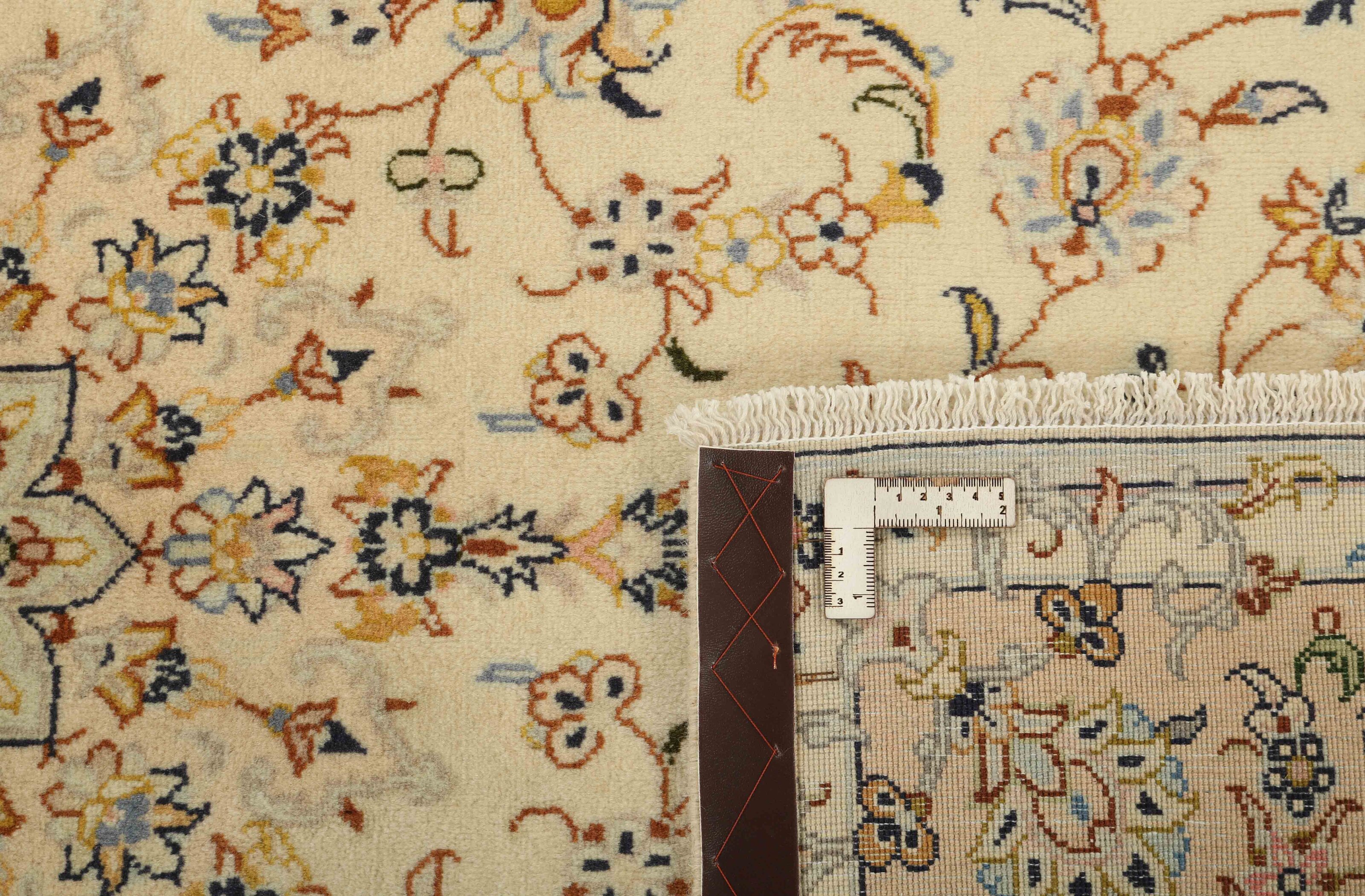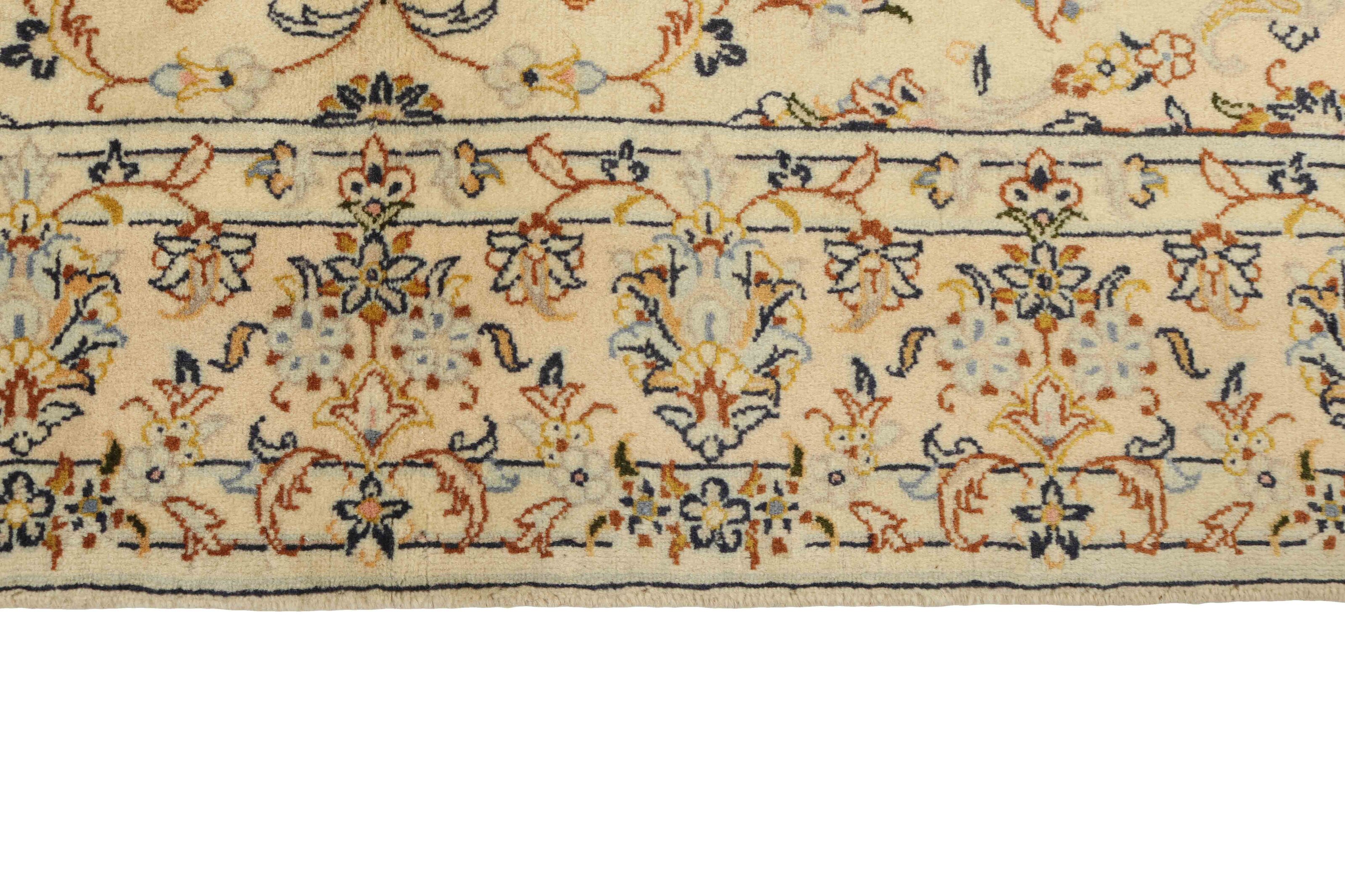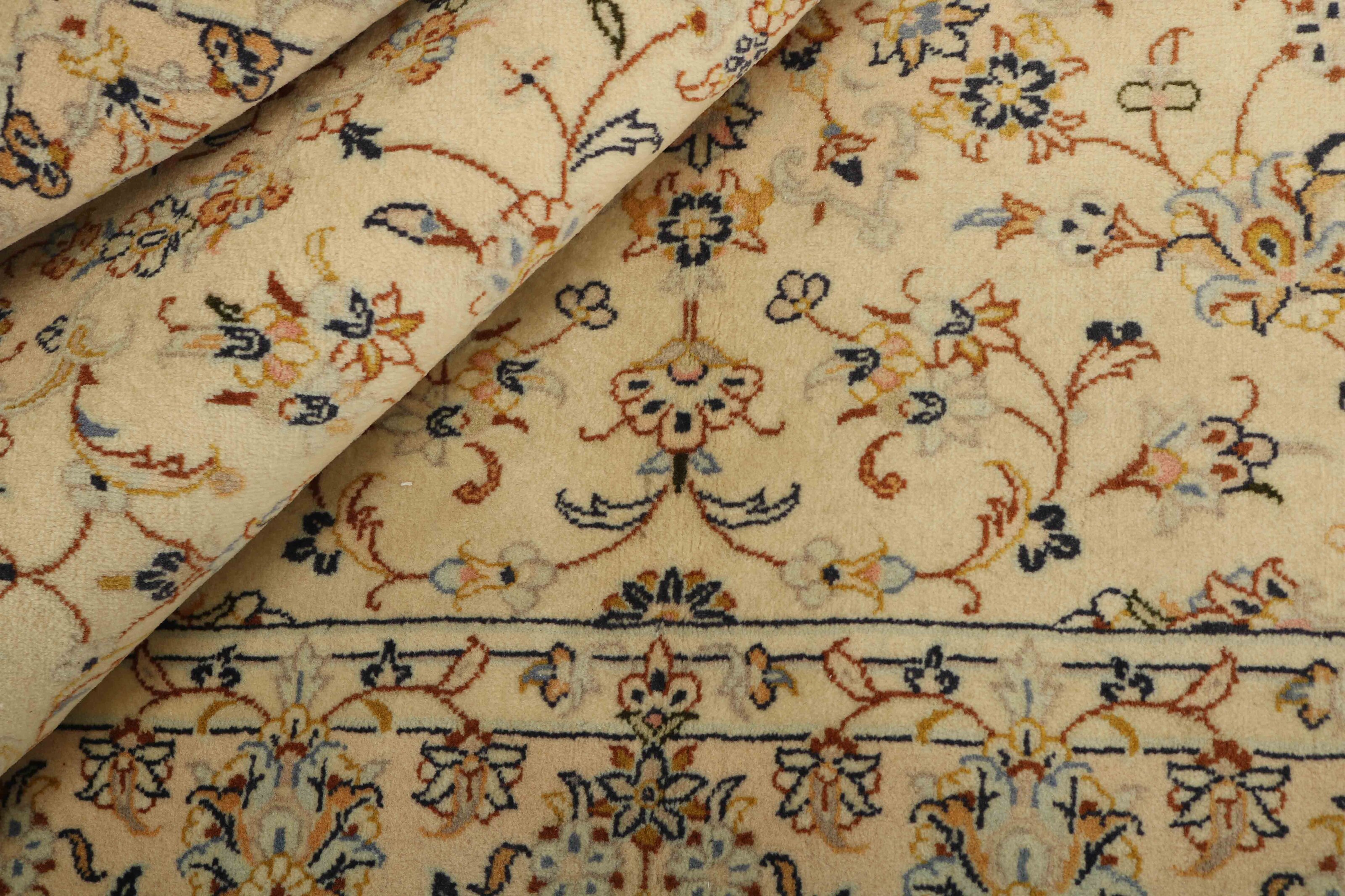 Keshan has always been famed for its handicrafts. The villages lie on the main road between Ghom and Isfahan in central Iran. To the East, the region borders Iran's largest desert. Despite the decline of this particular handicraft during the 20th century, many beautiful Keshan rugs are still being produced in accordance with the traditions of the old masters, e.g. decorated with the beautiful medallion patterns or tapestry featuring human and animal motifs. The patterns are most commonly woven around a medallion in the centre of the rug, some of which are repeated in the corners. The other fields are densely decorated with realistic flowers and vines. The main border often features the "Herati" motif (an arched leaf), while the secondary borders feature rosettes. Brick red and dark blue are the most common base colours. Keshan is a city of about 300.000 people, situated in the Isfahan province in central Iran. It is rather low lying, and it gets very hot in summer. Traditionally, people have sought to alleviate this by building the houses into the ground. Keshan produces both wool and silk rugs. The first have a cotton warp and weft, the weft being blue. Several qualities are produced, but most Keshan rugs are very finely knotted and all covering. The shape of a Keshan medallion is quite special; it is made by alternating curved lines and right angles. The most common colours are a red field and a blue medallion, with secondary details in other colours. The trimmings of a Keshan rug are also special; the main trimming is normally surrounded by stripes that form a geometrical pattern, usually small blue and red triangles. Keshan rugs come in all sizes. The south-eastern city of Natanez has laid name to image rugs done in the same knotting as Keshans.