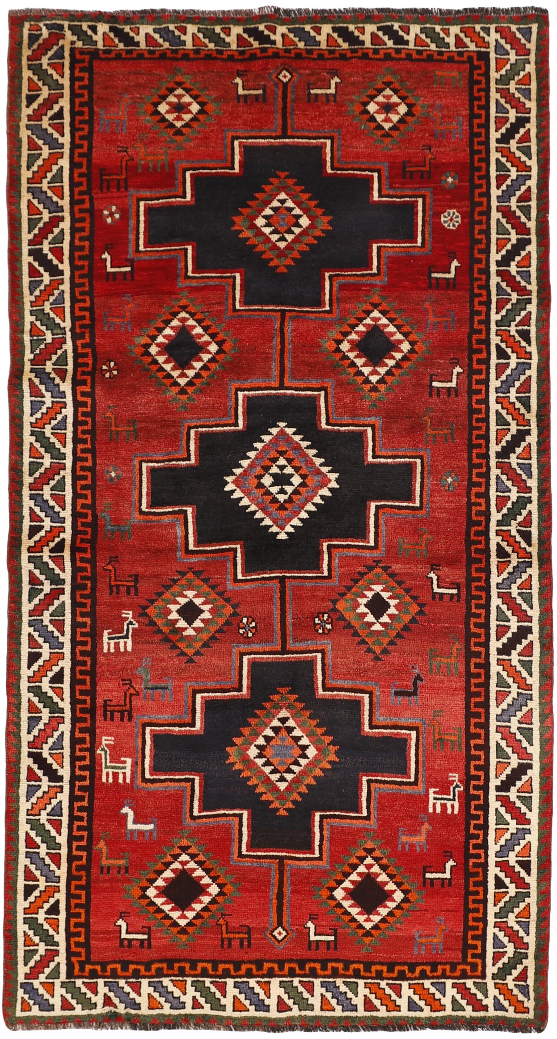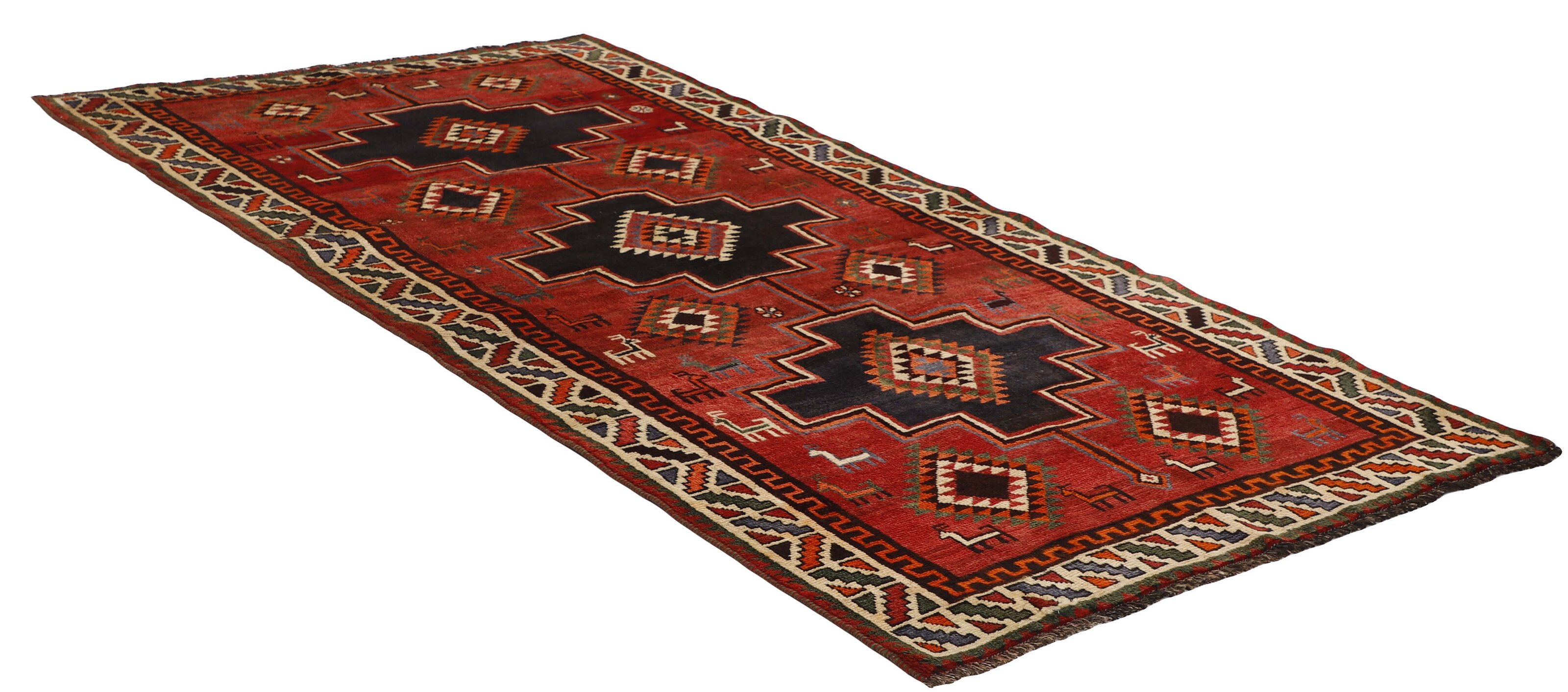 The Lori Tribe is one of the most important nomadic tribes in Iran, and inhabit the southern and western parts of the country. Several of the Lori areas used to belong to the Kashghai. As opposed to the Kashghai, who speak Turkish, the Loris are originally Iranian, and their language is similar to Persian. Pressure from different sides in this century has forced many Loris to give up their nomadic lives and settle in villages. Two main types of Lori rugs are marketed. The nomadic rugs, produced in the southern area, are called “normal Lori Behbehan”. They resemble the Kashghai rugs and are made entirely of wool but they have a different series of motifs, and a generous use of clear, contrasted colours; a strong red is particularly prevalent. The other type of Lori rugs is marketed in the city of Khorramabad. These are squarer and colours are used more cautiously. The patterns show a great deal of variation, with a hole pattern being dominant. The fringes are often beautifully weaved. The city and the district of Hamadan is an important centre for the rug trade, as well as the most productive rug production area of Iran. Hamadan is a major city with hundreds of thousands of people. Like Ekbatan, it was a main city of the Achemenian kings. It has an indigenous Jewish population and numerous monuments, of which the most important are the tombs of Esther and Mordicai (central to Jewish pilgrims), and the tomb at Avicenna. Hamadan is a provincial capitol. Two types of rugs are knotted. One is the so-called “city rug”, also known as the Shahrbaff. The production is modern and largely state controlled. The village production, however, is much more important; Hamadan is a market city for many rug producing villages that each has its own pattern. Most prominent are Borchalu, Tuserkman, Memraban, Khamseh, Begardeh, Enjilas, Hosseinabad, and Zandjan. There is a wide range of patterns but the quality is very consistent. The colours are strong, and often plant colours. The patterns are daring, although random, and Hosseinabad and Enjilas in particular are known for through going patterns. The rugs are usually not much bigger than 3 by 2 metres.