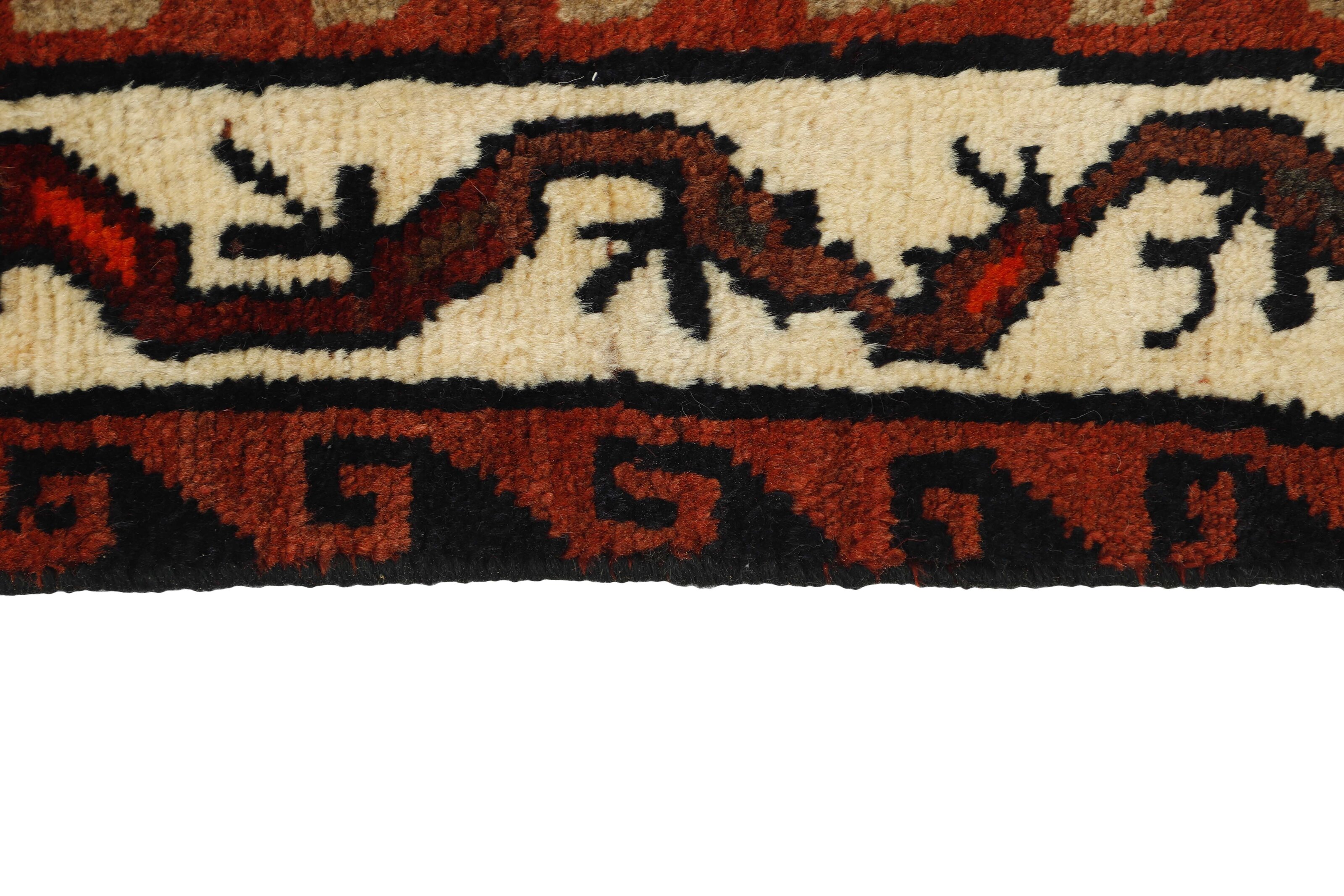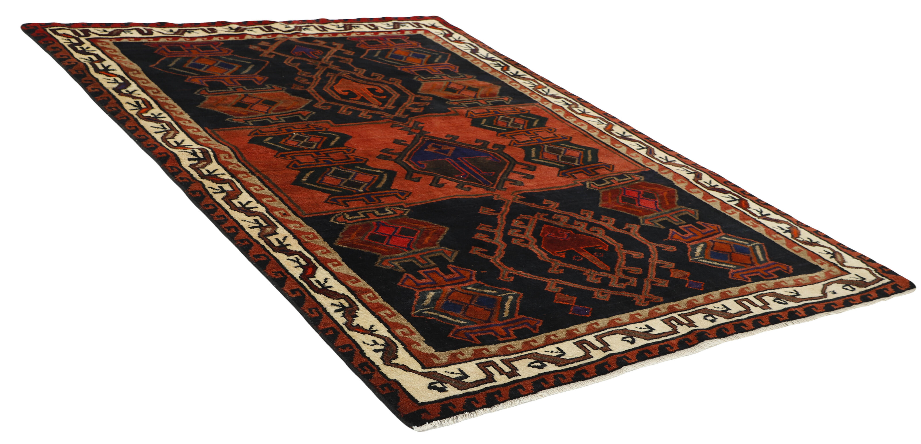 The Lori Tribe is one of the most important nomadic tribes in Iran, and inhabit the southern and western parts of the country. Several of the Lori areas used to belong to the Kashghai. As opposed to the Kashghai, who speak Turkish, the Loris are originally Iranian, and their language is similar to Persian. Pressure from different sides in this century has forced many Loris to give up their nomadic lives and settle in villages. Two main types of Lori rugs are marketed. The nomadic rugs, produced in the southern area, are called “normal Lori Behbehan”. They resemble the Kashghai rugs and are made entirely of wool but they have a different series of motifs, and a generous use of clear, contrasted colours; a strong red is particularly prevalent. The other type of Lori rugs is marketed in the city of Khorramabad. These are squarer and colours are used more cautiously. The patterns show a great deal of variation, with a hole pattern being dominant. The fringes are often beautifully weaved. The city and the district of Hamadan is an important centre for the rug trade, as well as the most productive rug production area of Iran. Hamadan is a major city with hundreds of thousands of people. Like Ekbatan, it was a main city of the Achemenian kings. It has an indigenous Jewish population and numerous monuments, of which the most important are the tombs of Esther and Mordicai (central to Jewish pilgrims), and the tomb at Avicenna. Hamadan is a provincial capitol. Two types of rugs are knotted. One is the so-called “city rug”, also known as the Shahrbaff. The production is modern and largely state controlled. The village production, however, is much more important; Hamadan is a market city for many rug producing villages that each has its own pattern. Most prominent are Borchalu, Tuserkman, Memraban, Khamseh, Begardeh, Enjilas, Hosseinabad, and Zandjan. There is a wide range of patterns but the quality is very consistent. The colours are strong, and often plant colours. The patterns are daring, although random, and Hosseinabad and Enjilas in particular are known for through going patterns. The rugs are usually not much bigger than 3 by 2 metres.