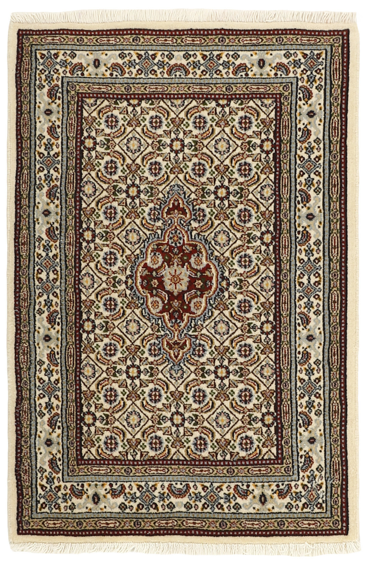 Moud MahiItem no.: 1420838 Size: 61 cm x 90 cmMoud is a small town south of Mashad, in the Khorrasan Province. Rugs from this area are characterised by homogeneity in patterns and quality. Warp and weft are cotton and the pile is wool. The trimmings are a version of the traditional Persian turtle trimming. The rugs are produced in all sizes. Moud rugs are often copied in India, because of their remarkable homogeneity. The characteristic Moud designs are among the most uniform, evenly knotted, and easily recognisable designs of the Khorrasan Province. Moud Mahi are made in a beige, light red, or blue tone, with all-over Mahi patterns or with a star shaped medallion. Mahi means fish, and the Mahi pattern is the most commonly used pattern in genuine Persian rugs. When looking at it closely, you can see a pond encircled by four fish.