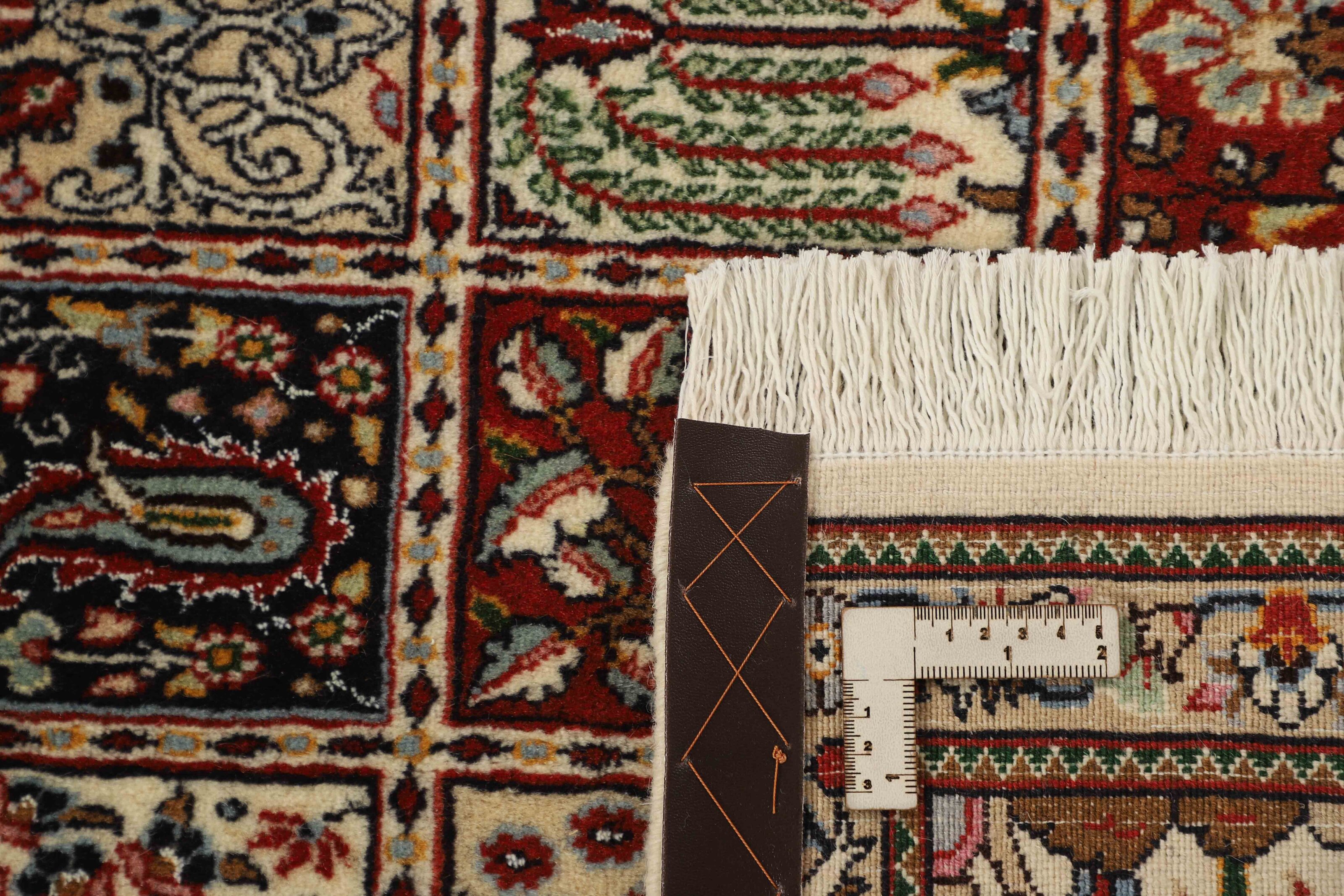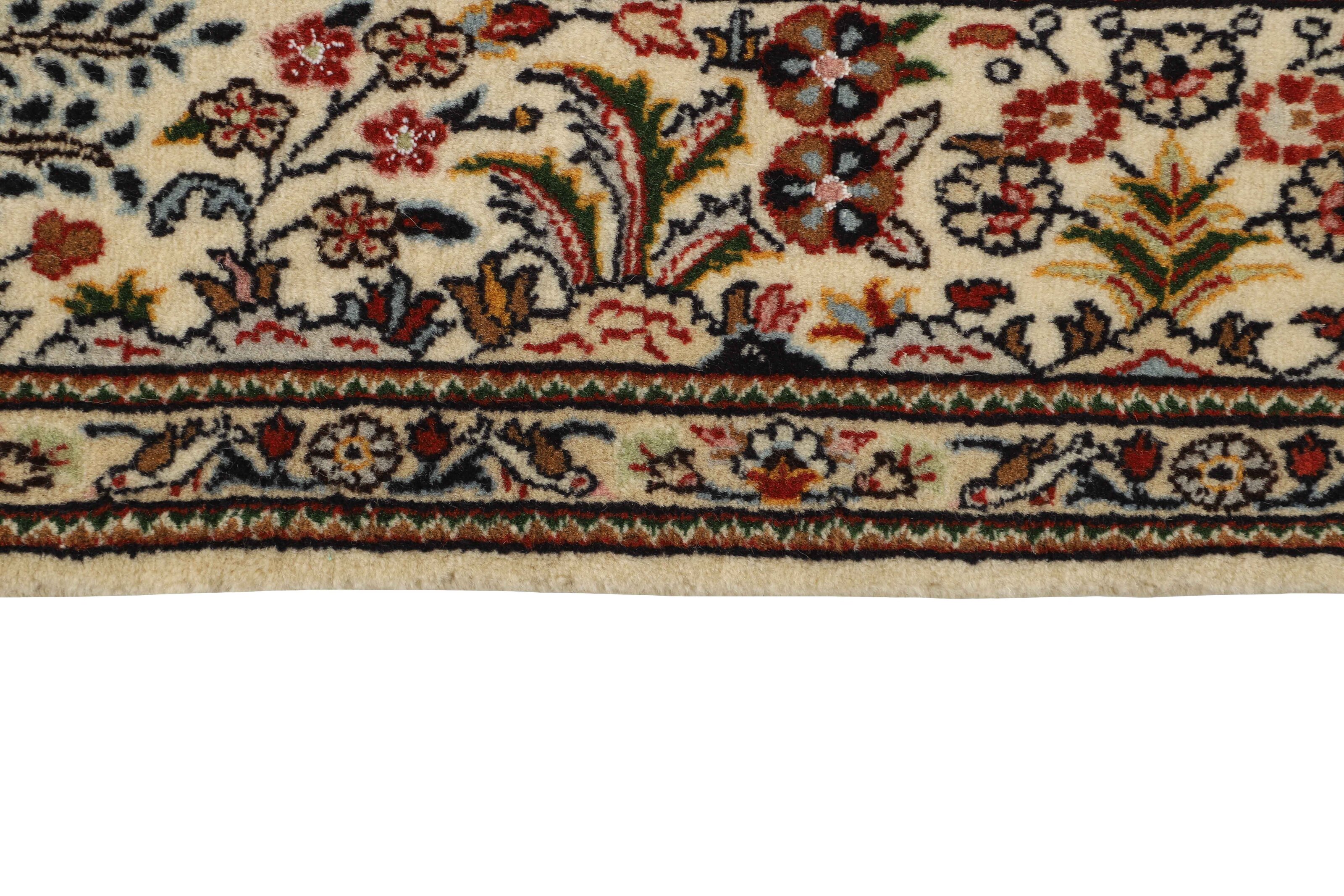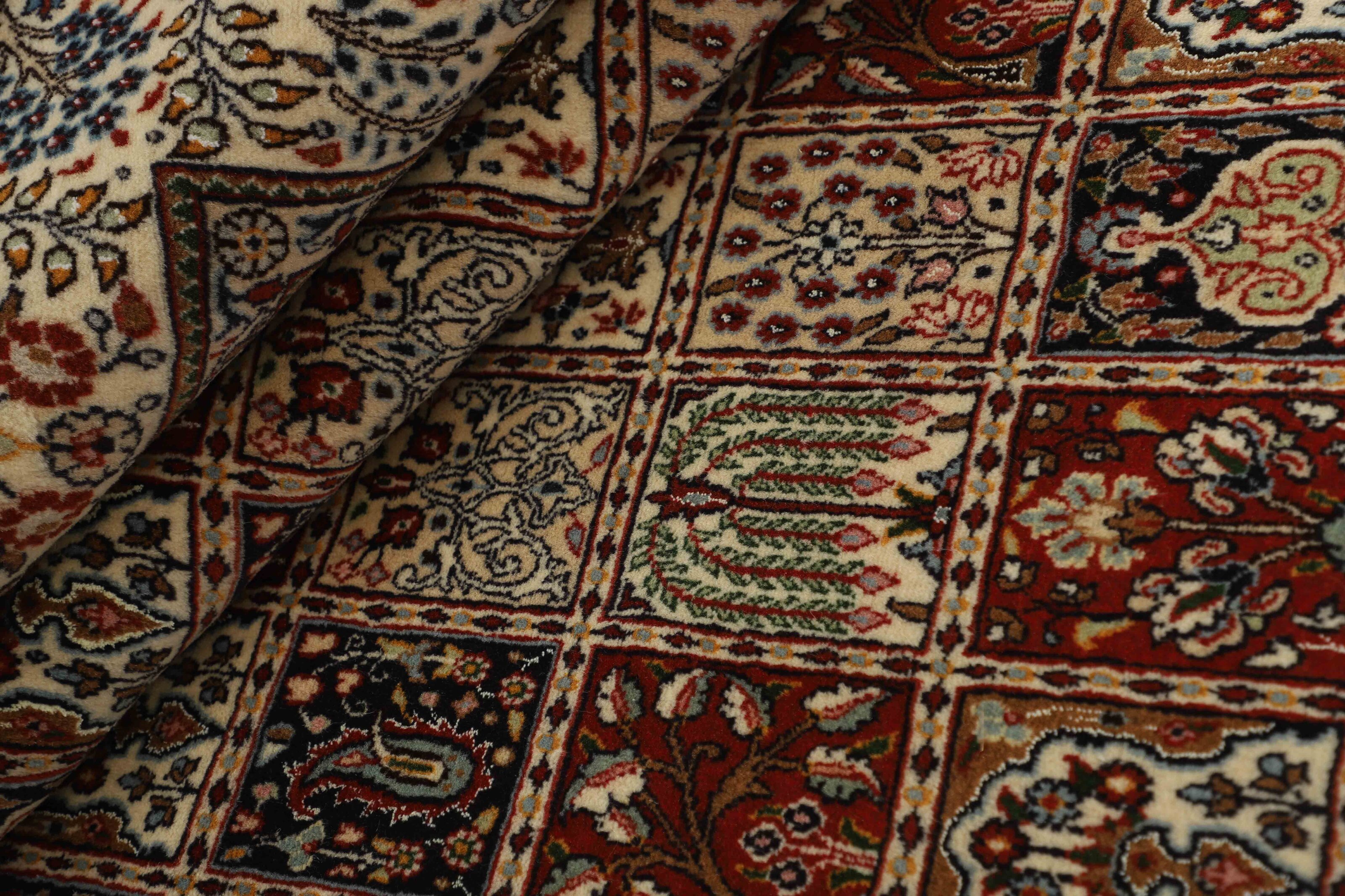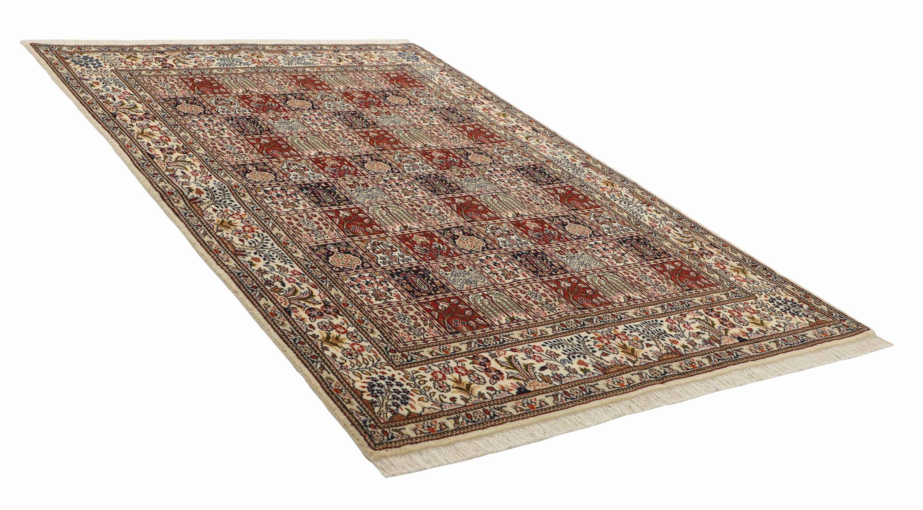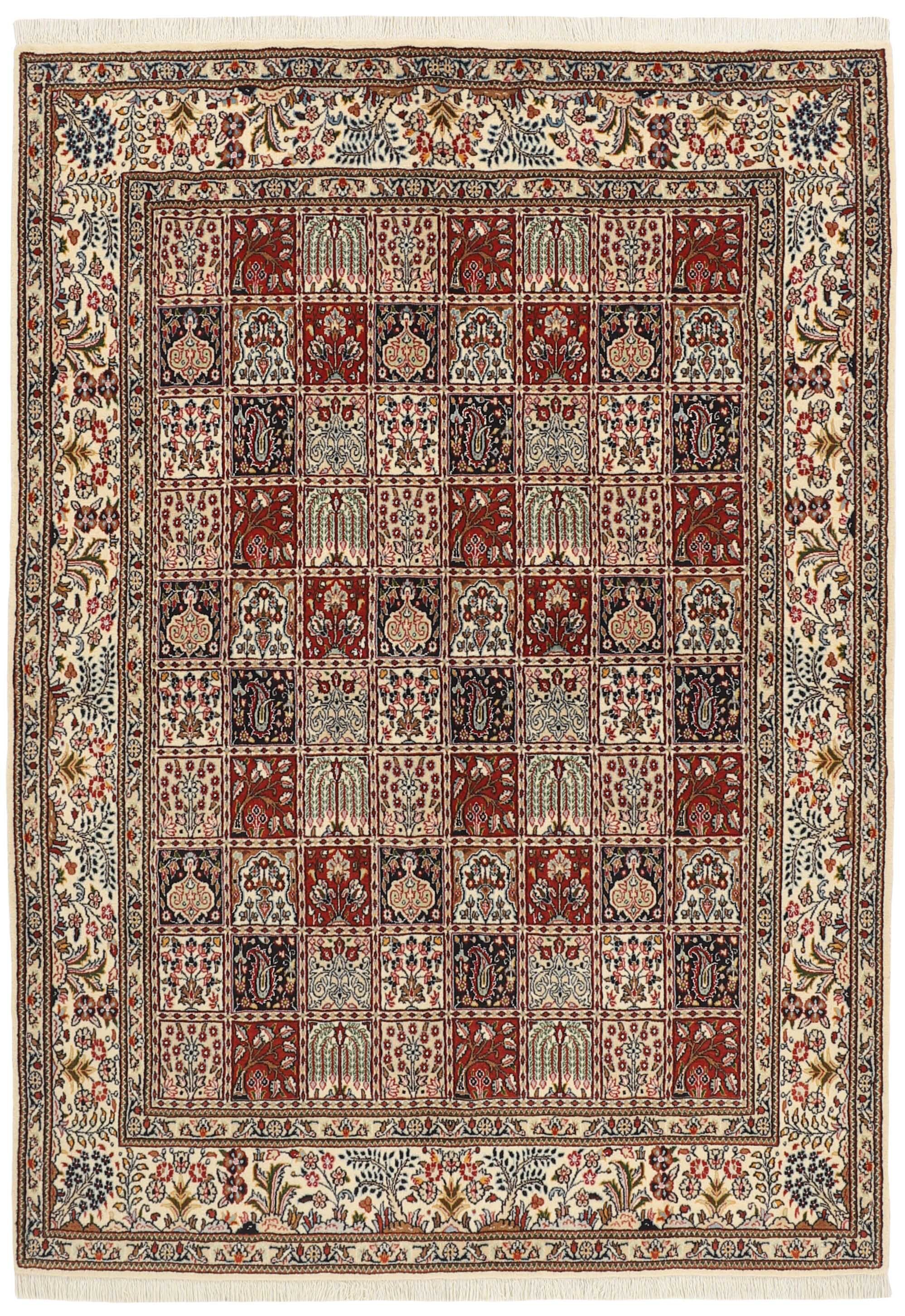Moud GardenItem no.: 1519683 Size: 162 cm x 237 cmMoud is a small town south of Mashad, in the Khorrasan Province. Rugs from this area are characterised by homogeneity in patterns and quality. They always have a Mahi or Herati pattern base on a cream coloured background, sometimes with a round medallion and corners. The most common colours are ivory, blue, and brown. The warp and weft are cotton and the pile is wool. The trimmings are a version of the traditional Persian turtle trimming. The rugs are produced in all sizes. Moud rugs are often copied in India, because of their remarkable homogeneity. The characteristic Moud designs are among the most uniform, evenly knotted, and easily recognisable designs of the Khorrasan Province. The Moud Garden pattern, known from Bakhtiary designs, illustrates a stylised garden seen from above.