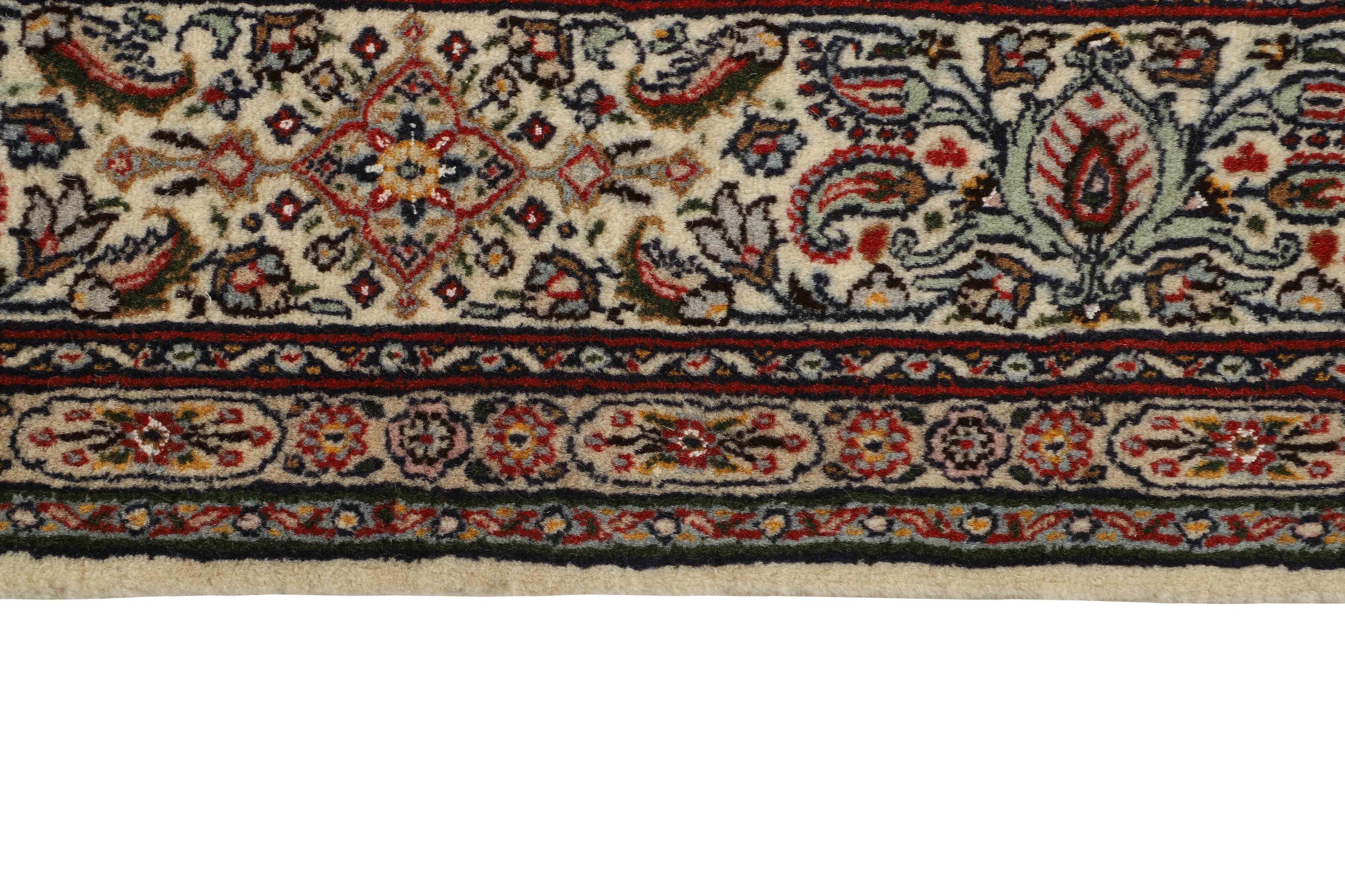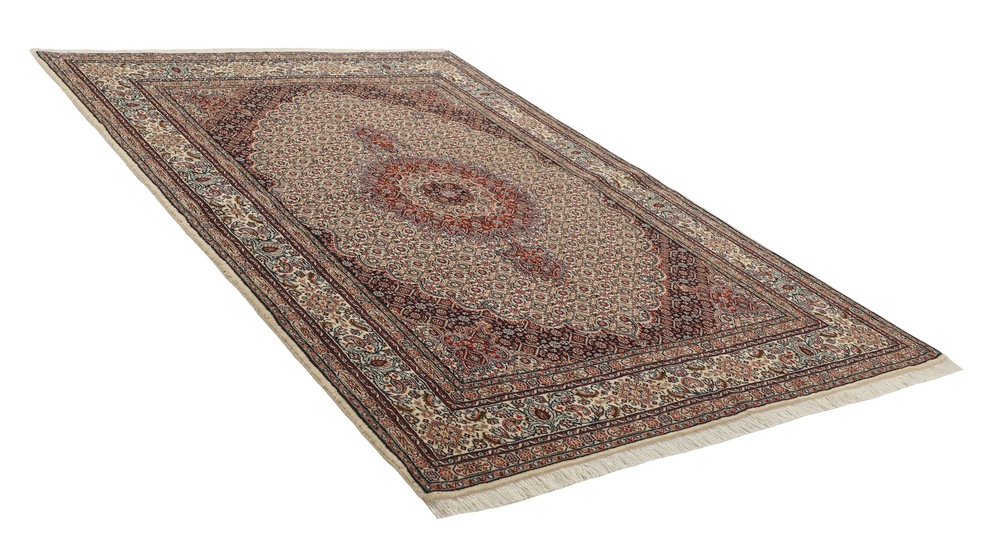 Moud MahiItem no.: 1519684 Size: 167 cm x 235 cmMoud is a small town south of Mashad, in the Khorrasan Province. Rugs from this area are characterised by homogeneity in patterns and quality. Warp and weft are cotton and the pile is wool. The trimmings are a version of the traditional Persian turtle trimming. The rugs are produced in all sizes. Moud rugs are often copied in India, because of their remarkable homogeneity. The characteristic Moud designs are among the most uniform, evenly knotted, and easily recognisable designs of the Khorrasan Province. Moud Mahi are made in a beige, light red, or blue tone, with all-over Mahi patterns or with a star shaped medallion. Mahi means fish, and the Mahi pattern is the most commonly used pattern in genuine Persian rugs. When looking at it closely, you can see a pond encircled by four fish.