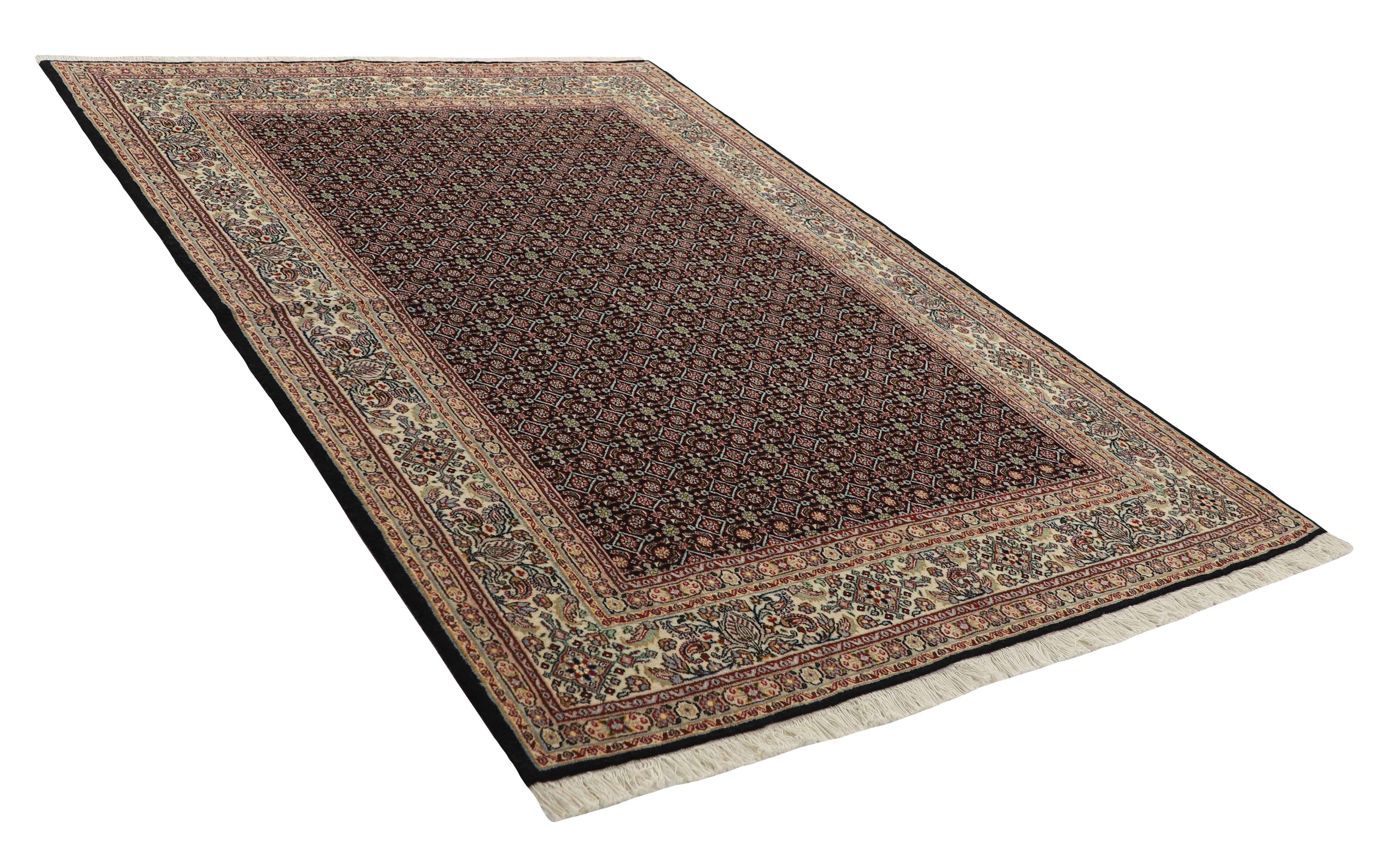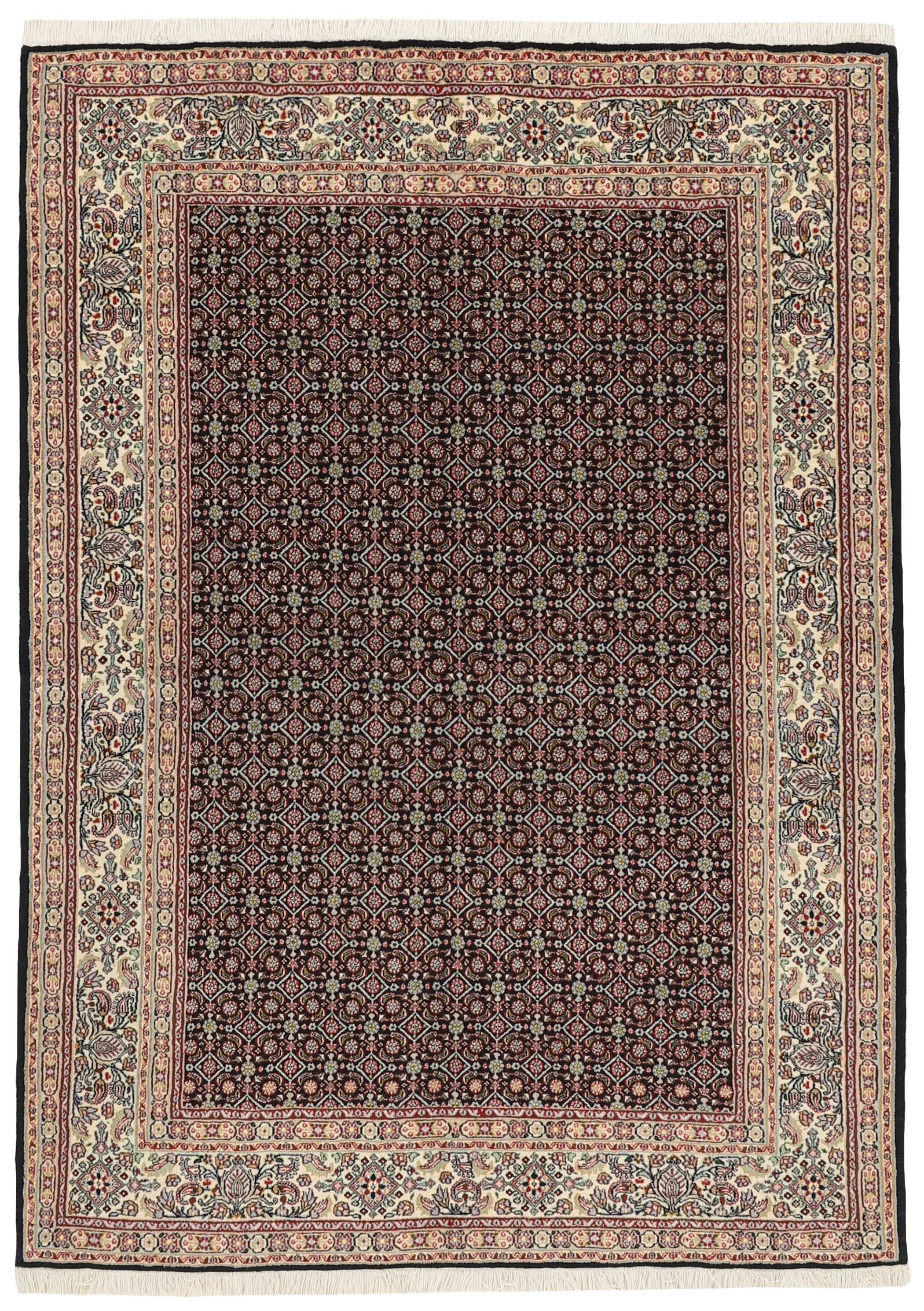 Moud MahiItem no.: 1519690 Size: 168 cm x 236 cmMoud is a small town south of Mashad, in the Khorrasan Province. Rugs from this area are characterised by homogeneity in patterns and quality. Warp and weft are cotton and the pile is wool. The trimmings are a version of the traditional Persian turtle trimming. The rugs are produced in all sizes. Moud rugs are often copied in India, because of their remarkable homogeneity. The characteristic Moud designs are among the most uniform, evenly knotted, and easily recognisable designs of the Khorrasan Province. Moud Mahi are made in a beige, light red, or blue tone, with all-over Mahi patterns or with a star shaped medallion. Mahi means fish, and the Mahi pattern is the most commonly used pattern in genuine Persian rugs. When looking at it closely, you can see a pond encircled by four fish.