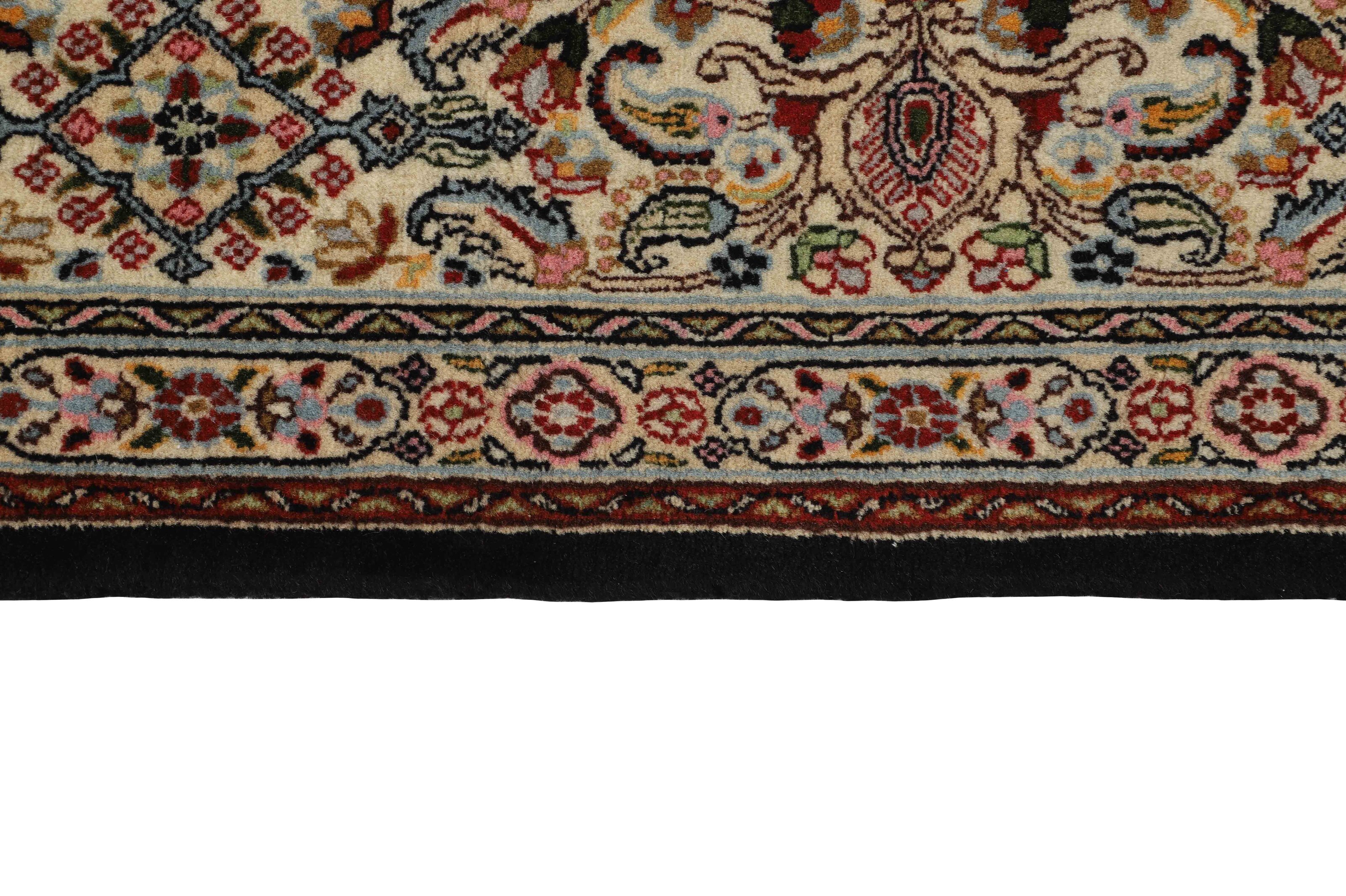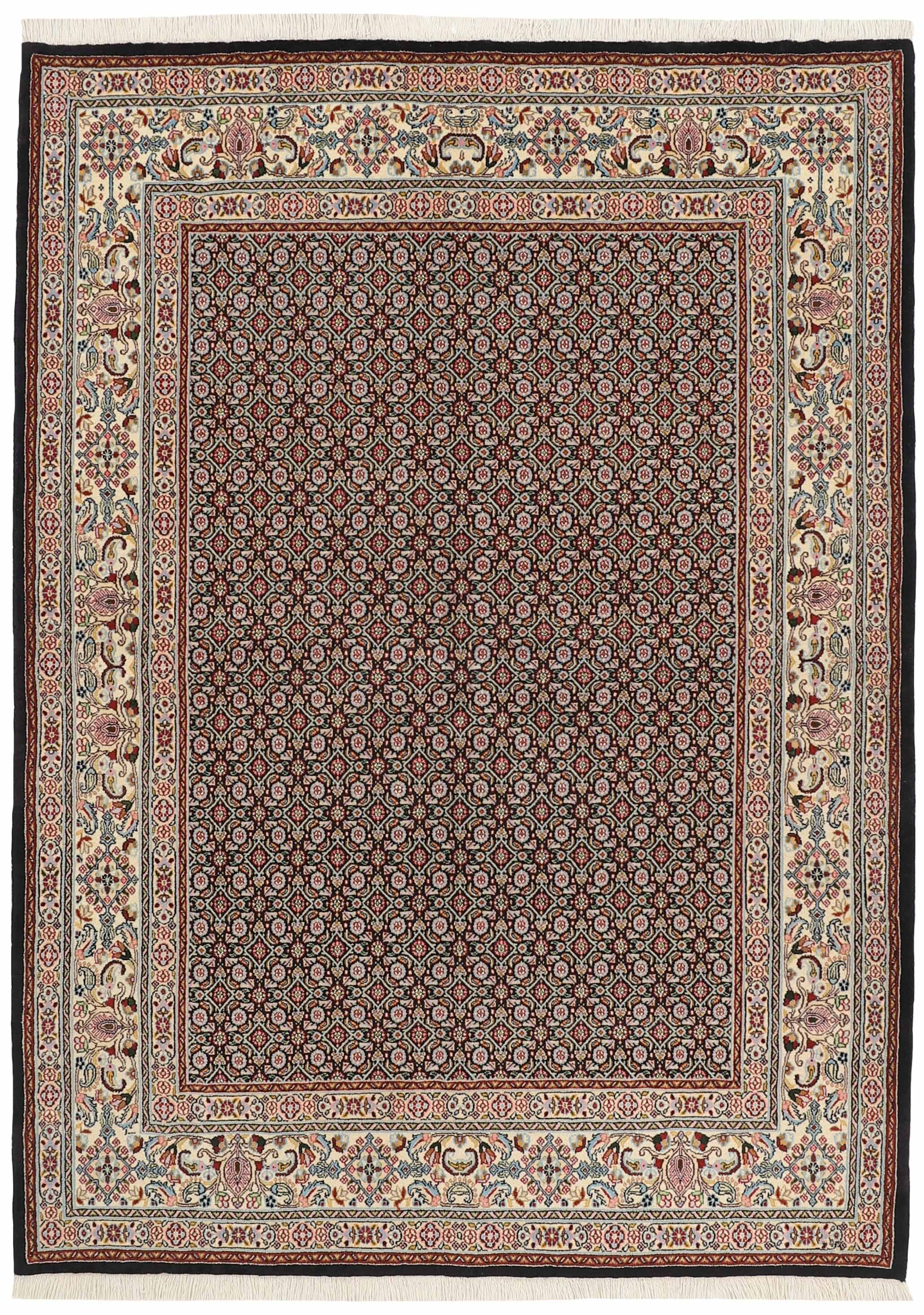 Moud MahiItem no.: 1519696 Size: 168 cm x 237 cmMoud is a small town south of Mashad, in the Khorrasan Province. Rugs from this area are characterised by homogeneity in patterns and quality. Warp and weft are cotton and the pile is wool. The trimmings are a version of the traditional Persian turtle trimming. The rugs are produced in all sizes. Moud rugs are often copied in India, because of their remarkable homogeneity. The characteristic Moud designs are among the most uniform, evenly knotted, and easily recognisable designs of the Khorrasan Province. Moud Mahi are made in a beige, light red, or blue tone, with all-over Mahi patterns or with a star shaped medallion. Mahi means fish, and the Mahi pattern is the most commonly used pattern in genuine Persian rugs. When looking at it closely, you can see a pond encircled by four fish.