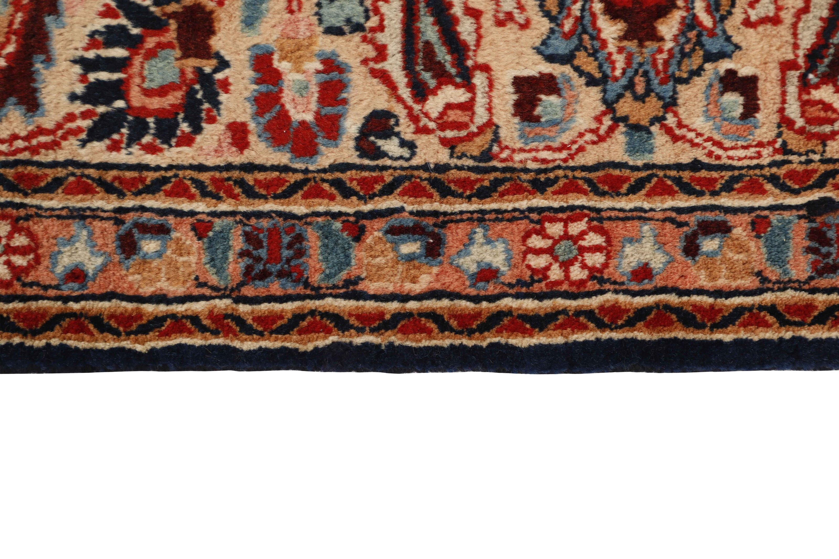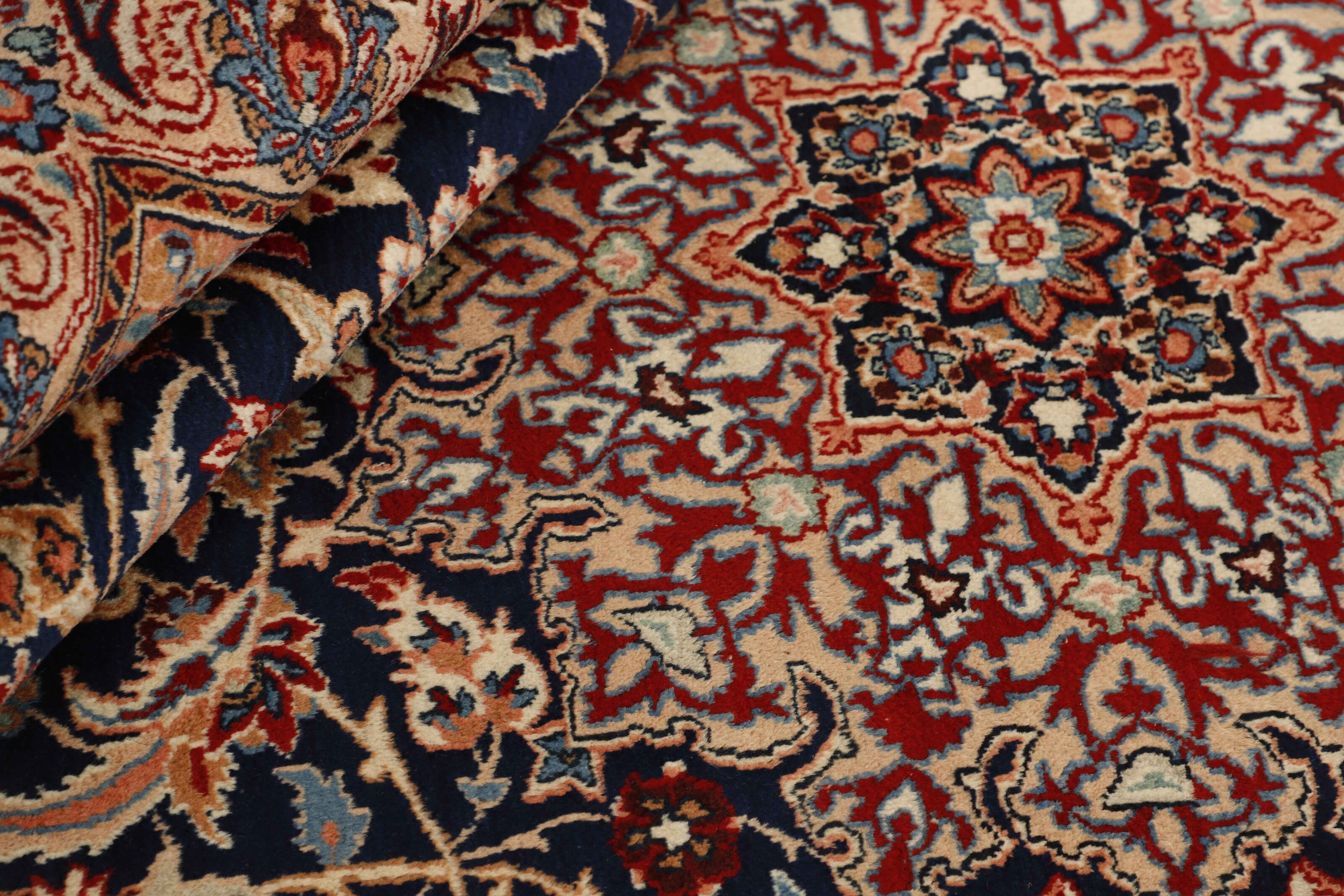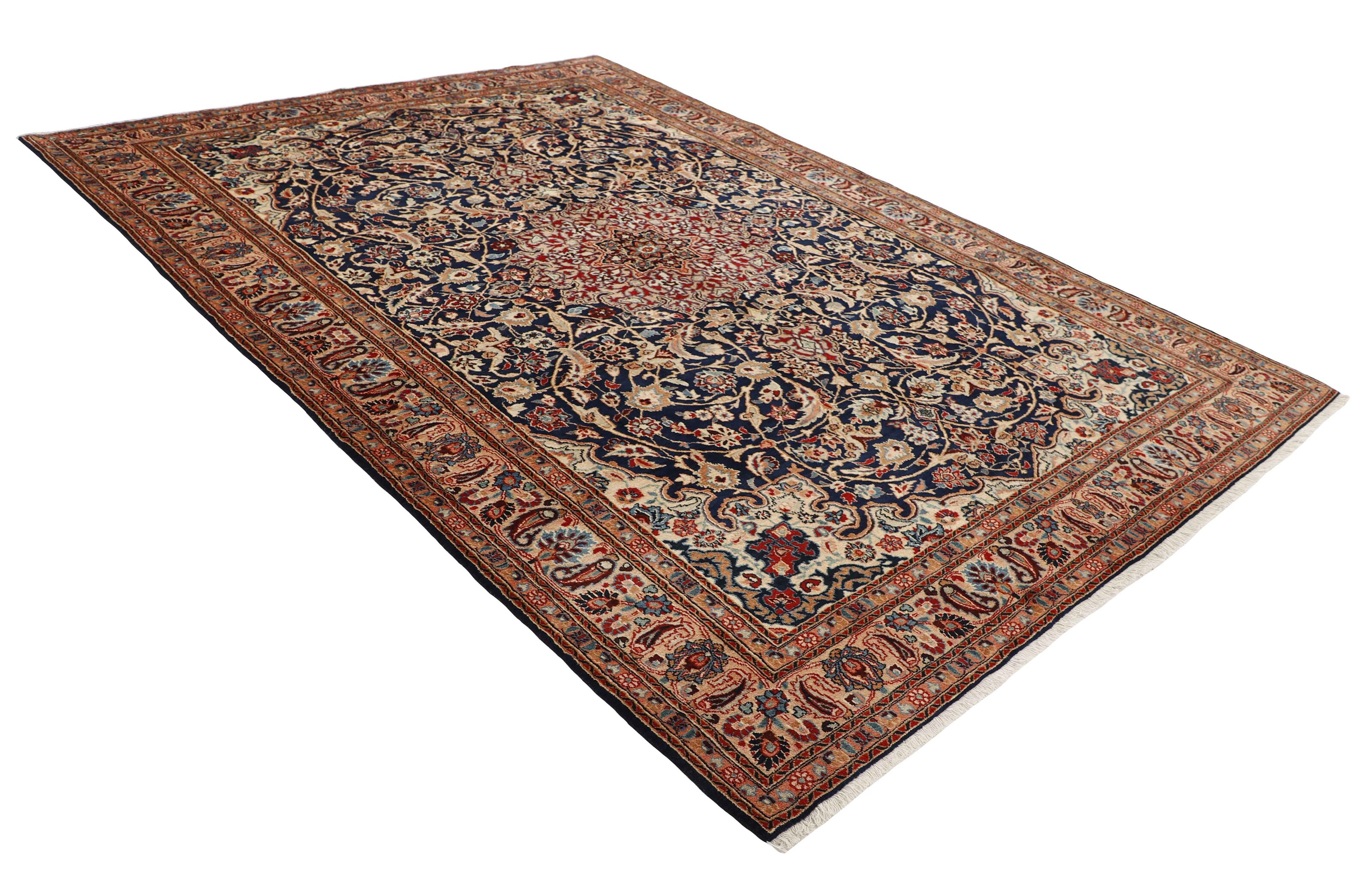Moud MahiItem no.: 1519716 Size: 205 cm x 309 cmMoud is a small town south of Mashad, in the Khorrasan Province. Rugs from this area are characterised by homogeneity in patterns and quality. Warp and weft are cotton and the pile is wool. The trimmings are a version of the traditional Persian turtle trimming. The rugs are produced in all sizes. Moud rugs are often copied in India, because of their remarkable homogeneity. The characteristic Moud designs are among the most uniform, evenly knotted, and easily recognisable designs of the Khorrasan Province. Moud Mahi are made in a beige, light red, or blue tone, with all-over Mahi patterns or with a star shaped medallion. Mahi means fish, and the Mahi pattern is the most commonly used pattern in genuine Persian rugs. When looking at it closely, you can see a pond encircled by four fish.