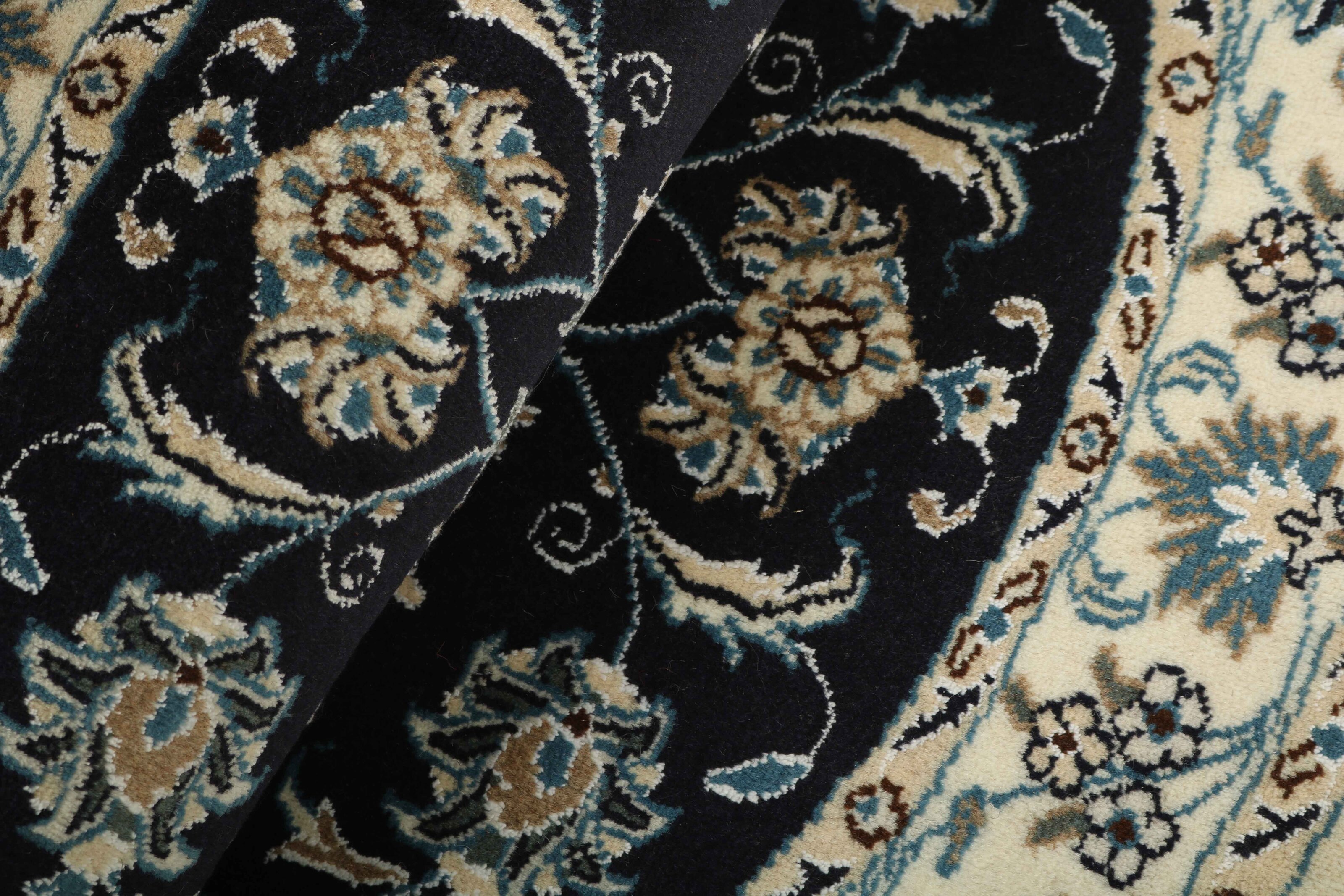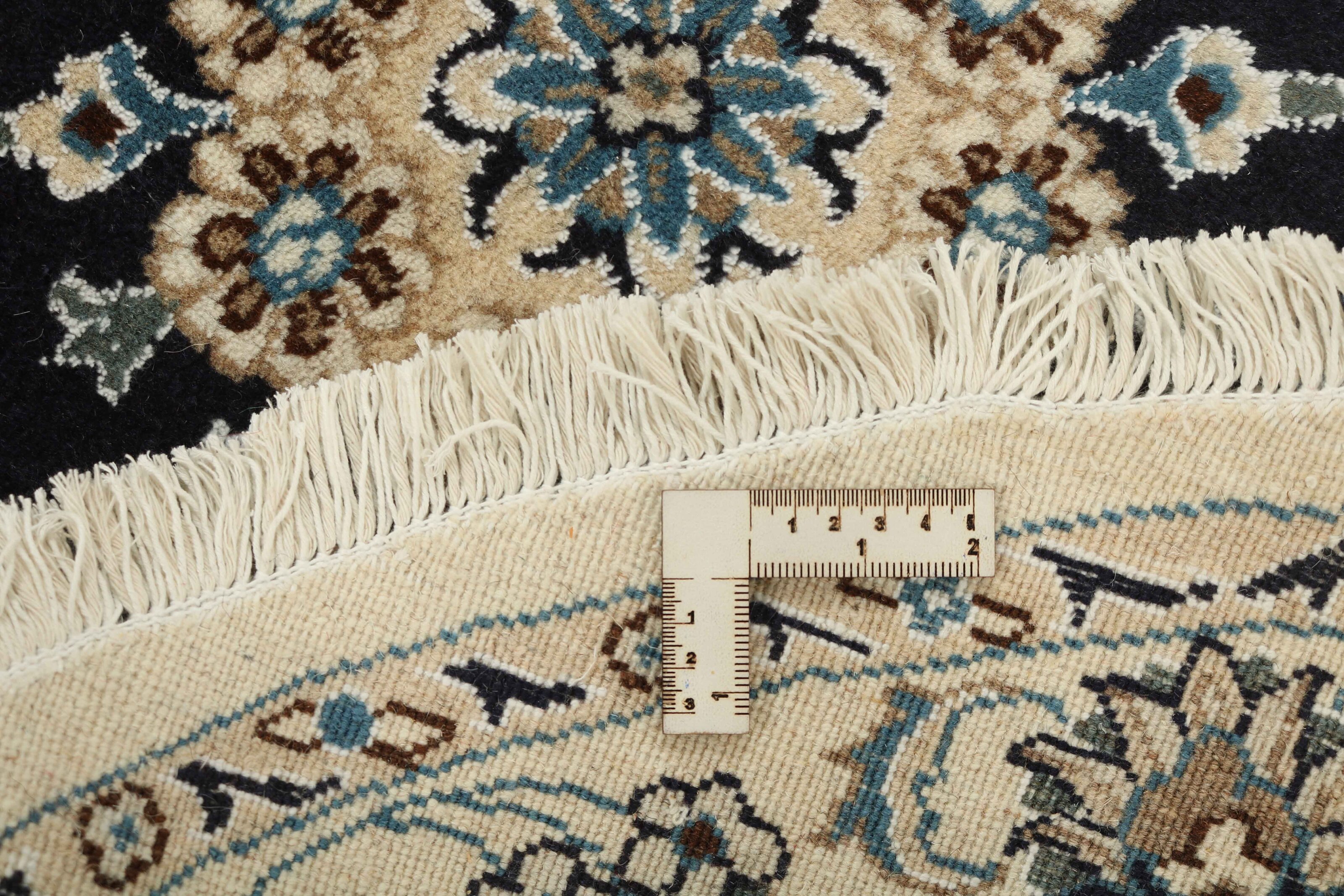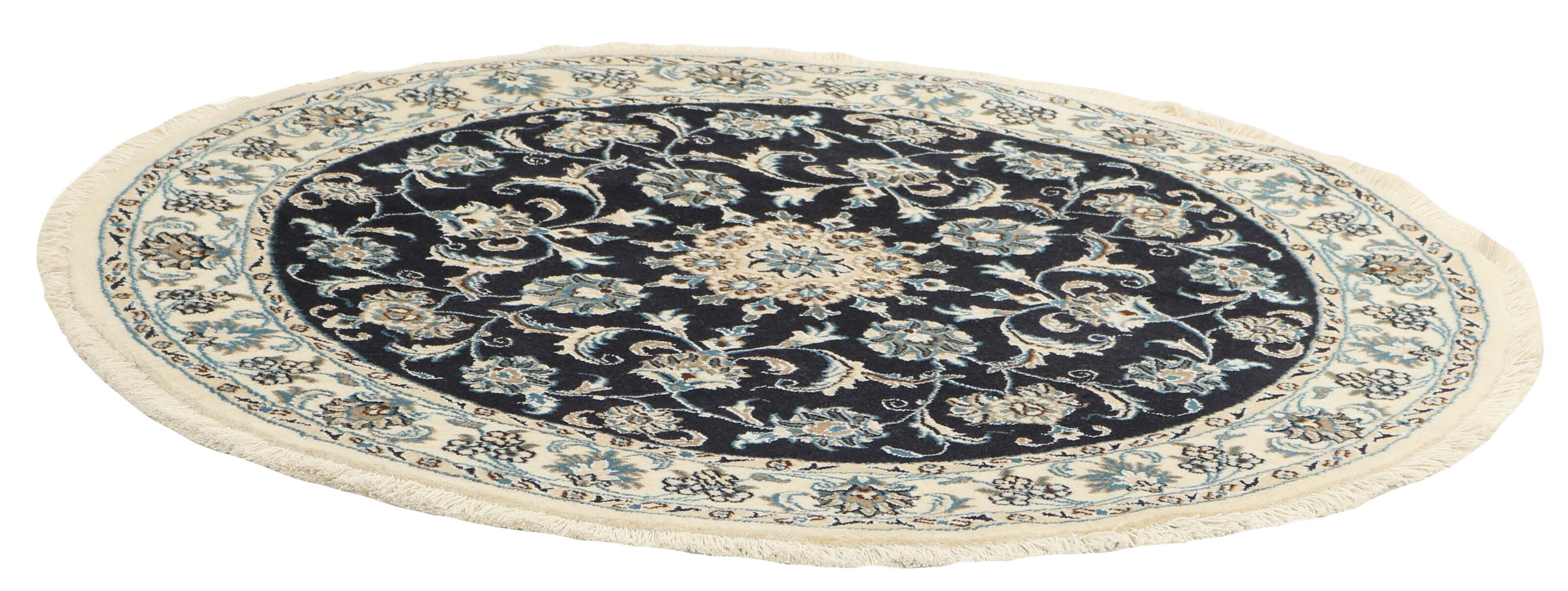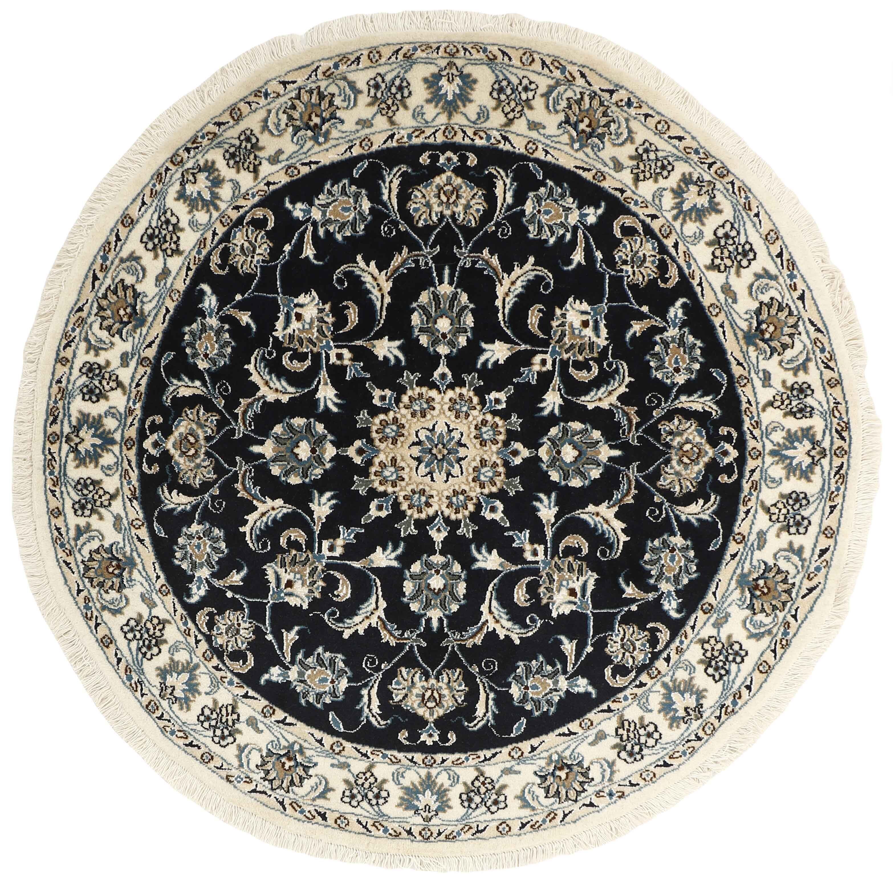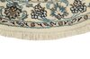 Nain KashmarItem no.: 1434198 Size: 140 cm x 140 cmNain is a city of about 50.000 people, located in the Isfahan Province. It has historic significance, since it was the last stop on caravan routes before Kavir-a-Lut, one of the deserts that stretch through the centre of Iran. The Nain Mosque is one of Iran’s oldest, and is built far better than the later and more famous mosques of Isfahan. The industry in Nain was traditionally focused on the production of wool garments, but the weavers switched to rug production when the demand fell. Their new products soon became famous, as the weavers were skilled and used good quality materials. The warp and weft are cotton, with a wool pile and contours of silk. Sometimes, silk is used more in the base. The colours are refined; nuances of ivory and cream, with small areas of red, green, and blue. As with the rugs from Isfahan, the patterns of the Nain rugs are also classical. The Nain rugs are made in all sizes, including the very large of up to 60m2, and some of these have a pure silk pile. The largest Nain rug produced was 20 by 20 metres.