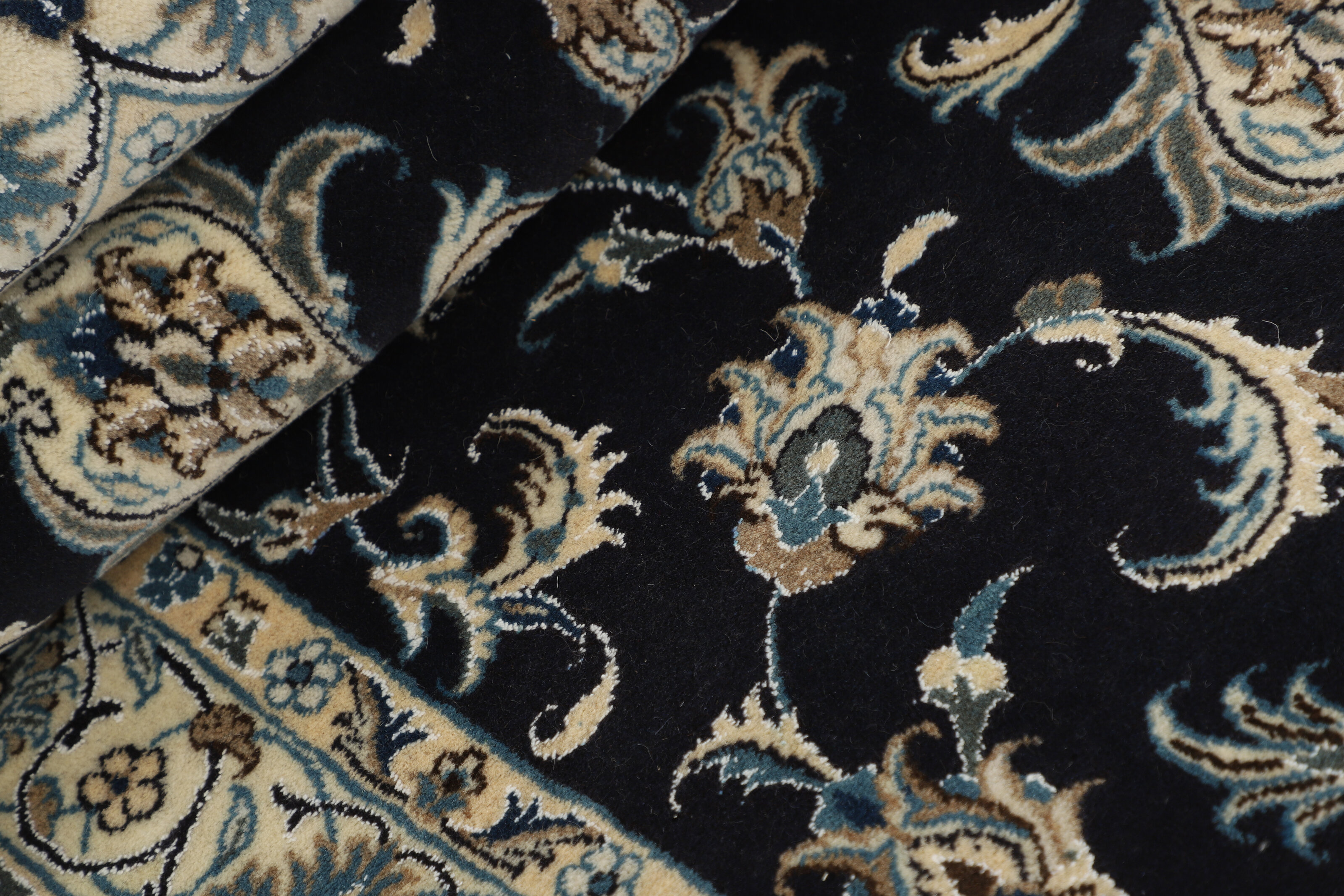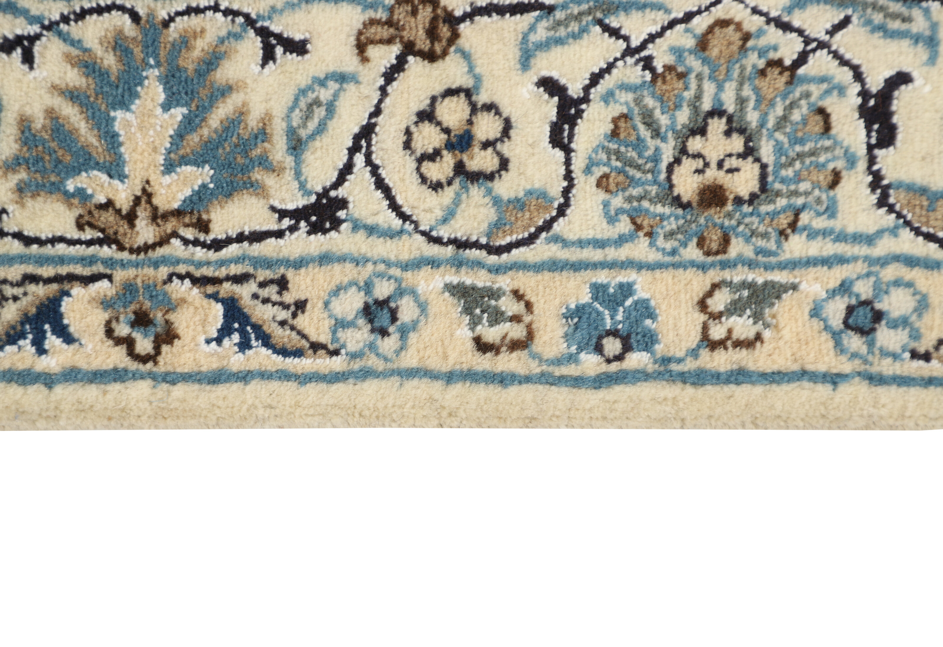 Nain KashmarItem no.: 1519802 Size: 117 cm x 205 cmNain is a city of about 50.000 people, located in the Isfahan Province. It has historic significance, since it was the last stop on caravan routes before Kavir-a-Lut, one of the deserts that stretch through the centre of Iran. The Nain Mosque is one of Iran’s oldest, and is built far better than the later and more famous mosques of Isfahan. The industry in Nain was traditionally focused on the production of wool garments, but the weavers switched to rug production when the demand fell. Their new products soon became famous, as the weavers were skilled and used good quality materials. The warp and weft are cotton, with a wool pile and contours of silk. Sometimes, silk is used more in the base. The colours are refined; nuances of ivory and cream, with small areas of red, green, and blue. As with the rugs from Isfahan, the patterns of the Nain rugs are also classical. The Nain rugs are made in all sizes, including the very large of up to 60m2, and some of these have a pure silk pile. The largest Nain rug produced was 20 by 20 metres.