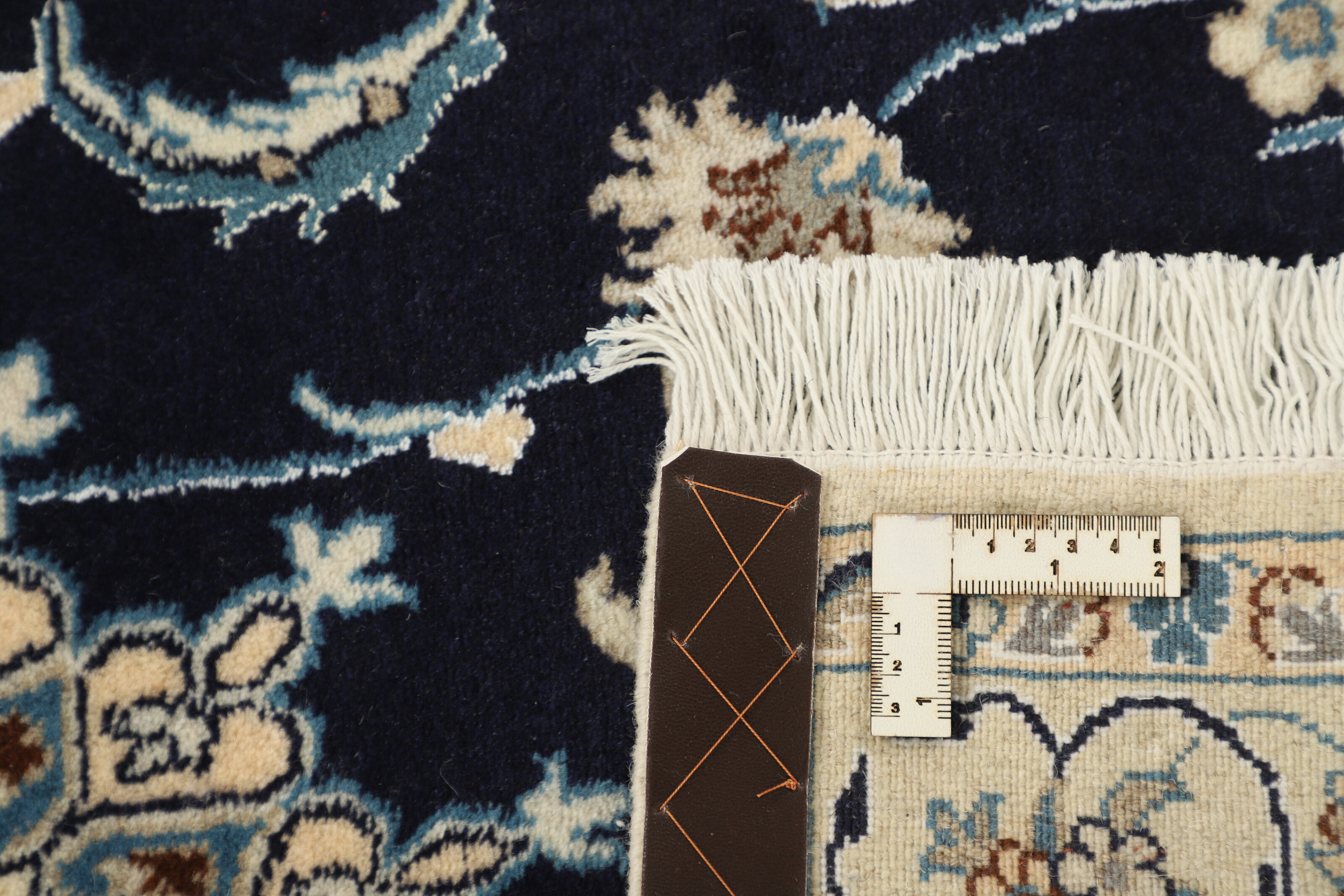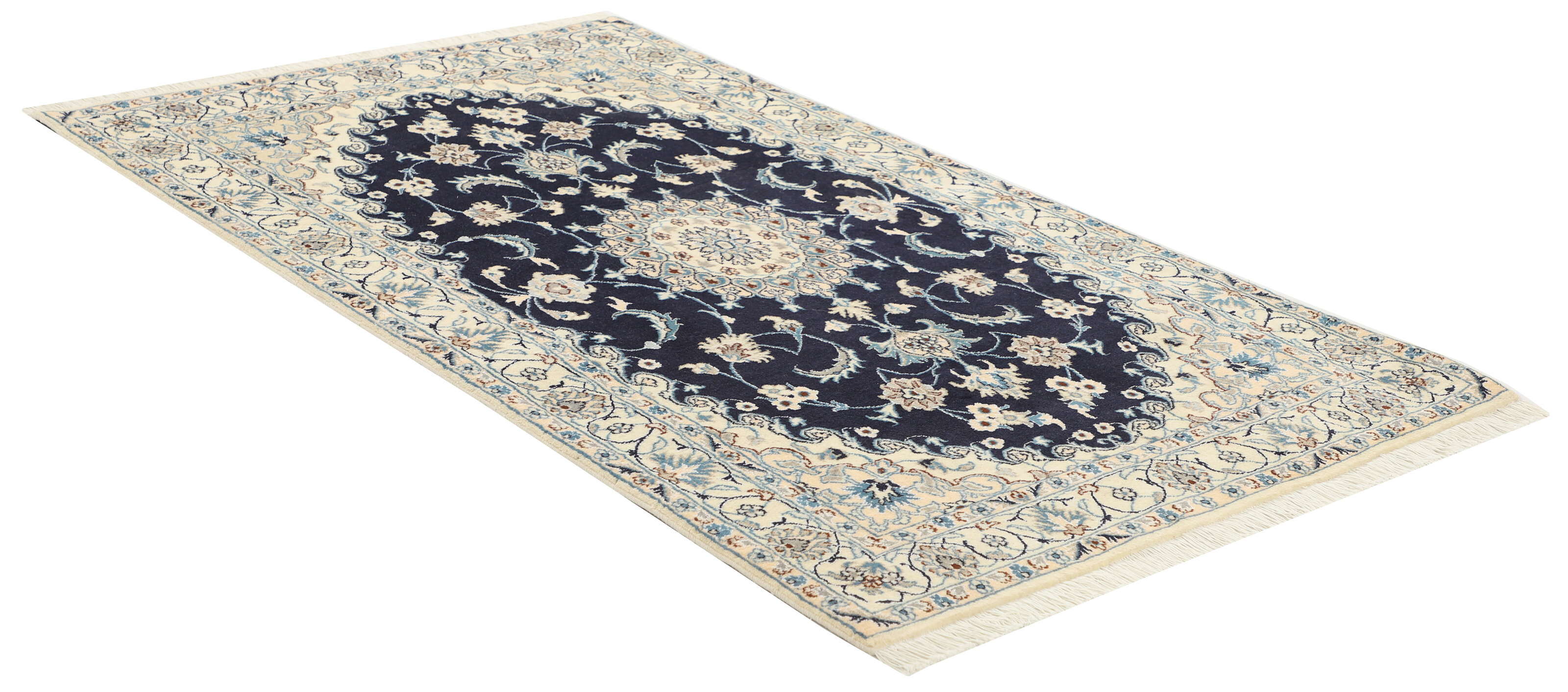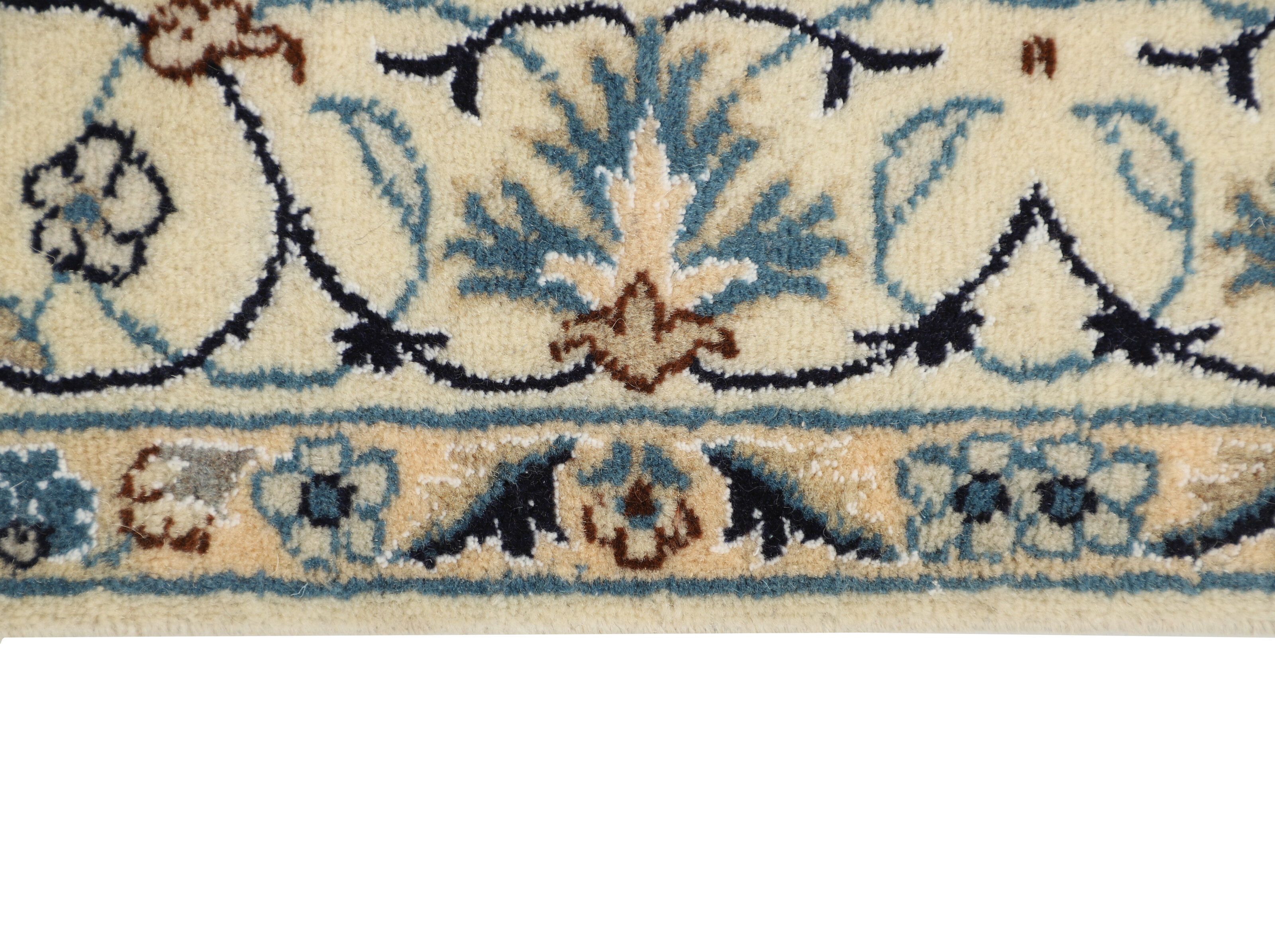 Nain KashmarItem no.: 1519810 Size: 120 cm x 207 cmNain is a city of about 50.000 people, located in the Isfahan Province. It has historic significance, since it was the last stop on caravan routes before Kavir-a-Lut, one of the deserts that stretch through the centre of Iran. The Nain Mosque is one of Iran’s oldest, and is built far better than the later and more famous mosques of Isfahan. The industry in Nain was traditionally focused on the production of wool garments, but the weavers switched to rug production when the demand fell. Their new products soon became famous, as the weavers were skilled and used good quality materials. The warp and weft are cotton, with a wool pile and contours of silk. Sometimes, silk is used more in the base. The colours are refined; nuances of ivory and cream, with small areas of red, green, and blue. As with the rugs from Isfahan, the patterns of the Nain rugs are also classical. The Nain rugs are made in all sizes, including the very large of up to 60m2, and some of these have a pure silk pile. The largest Nain rug produced was 20 by 20 metres.