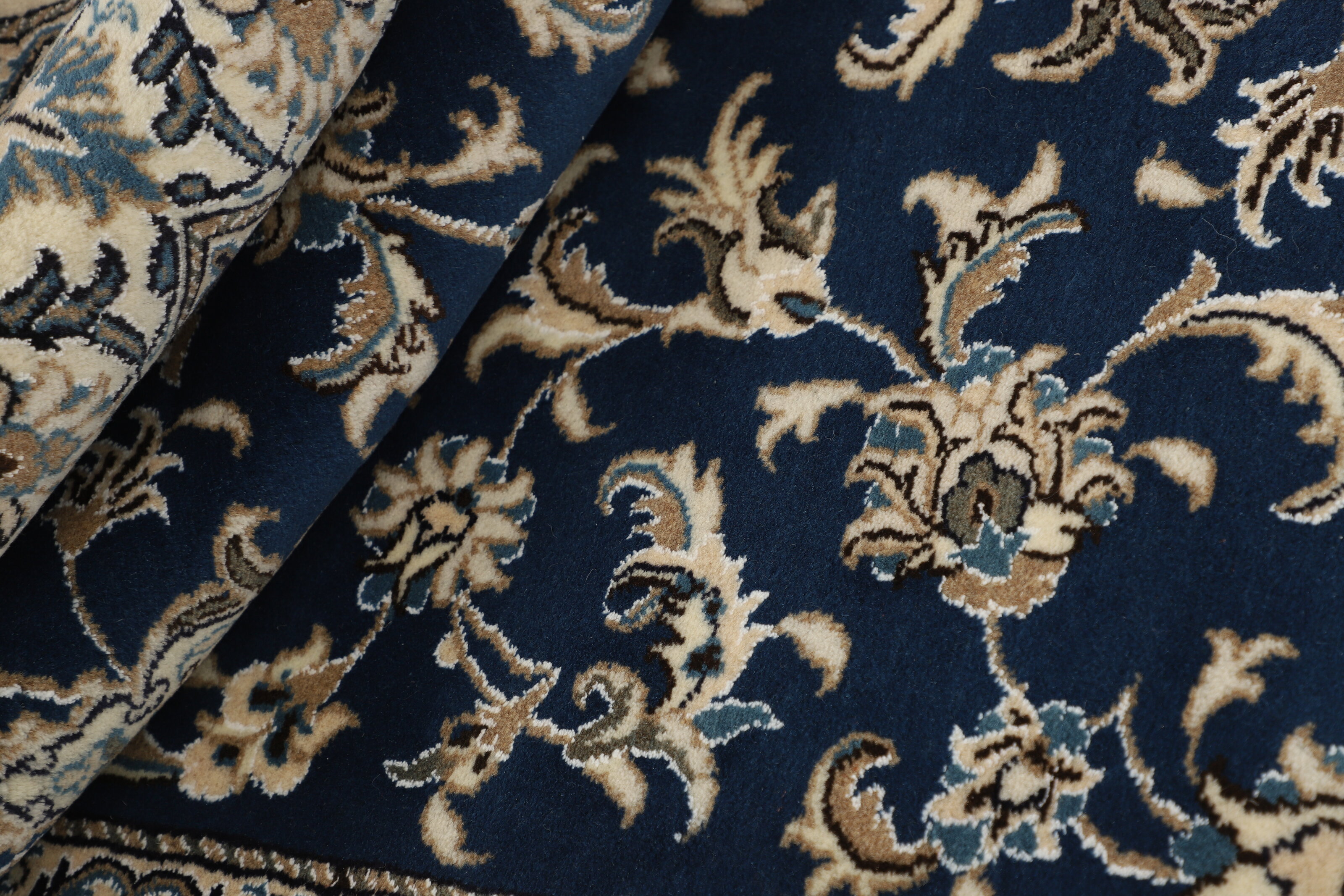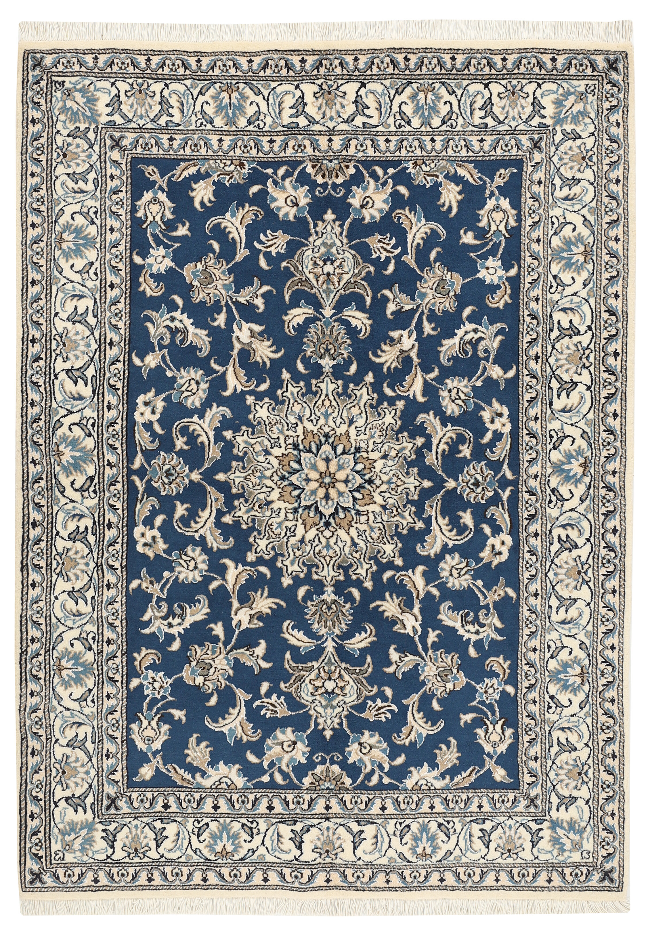 Nain KashmarItem no.: 1519820 Size: 142 cm x 195 cmNain is a city of about 50.000 people, located in the Isfahan Province. It has historic significance, since it was the last stop on caravan routes before Kavir-a-Lut, one of the deserts that stretch through the centre of Iran. The Nain Mosque is one of Iran’s oldest, and is built far better than the later and more famous mosques of Isfahan. The industry in Nain was traditionally focused on the production of wool garments, but the weavers switched to rug production when the demand fell. Their new products soon became famous, as the weavers were skilled and used good quality materials. The warp and weft are cotton, with a wool pile and contours of silk. Sometimes, silk is used more in the base. The colours are refined; nuances of ivory and cream, with small areas of red, green, and blue. As with the rugs from Isfahan, the patterns of the Nain rugs are also classical. The Nain rugs are made in all sizes, including the very large of up to 60m2, and some of these have a pure silk pile. The largest Nain rug produced was 20 by 20 metres.