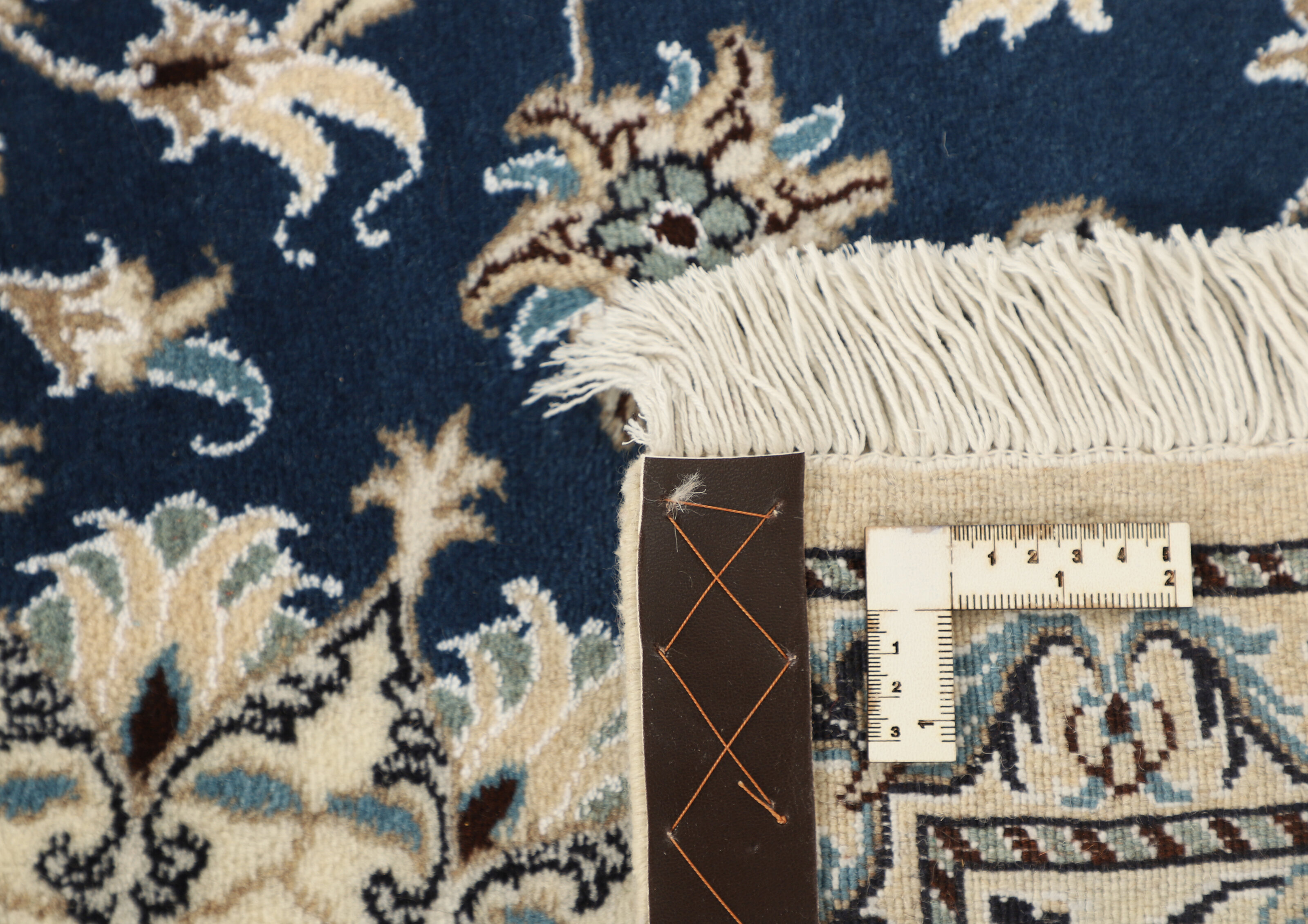 Nain KashmarItem no.: 1519823 Size: 160 cm x 240 cmNain is a city of about 50.000 people, located in the Isfahan Province. It has historic significance, since it was the last stop on caravan routes before Kavir-a-Lut, one of the deserts that stretch through the centre of Iran. The Nain Mosque is one of Iran’s oldest, and is built far better than the later and more famous mosques of Isfahan. The industry in Nain was traditionally focused on the production of wool garments, but the weavers switched to rug production when the demand fell. Their new products soon became famous, as the weavers were skilled and used good quality materials. The warp and weft are cotton, with a wool pile and contours of silk. Sometimes, silk is used more in the base. The colours are refined; nuances of ivory and cream, with small areas of red, green, and blue. As with the rugs from Isfahan, the patterns of the Nain rugs are also classical. The Nain rugs are made in all sizes, including the very large of up to 60m2, and some of these have a pure silk pile. The largest Nain rug produced was 20 by 20 metres.