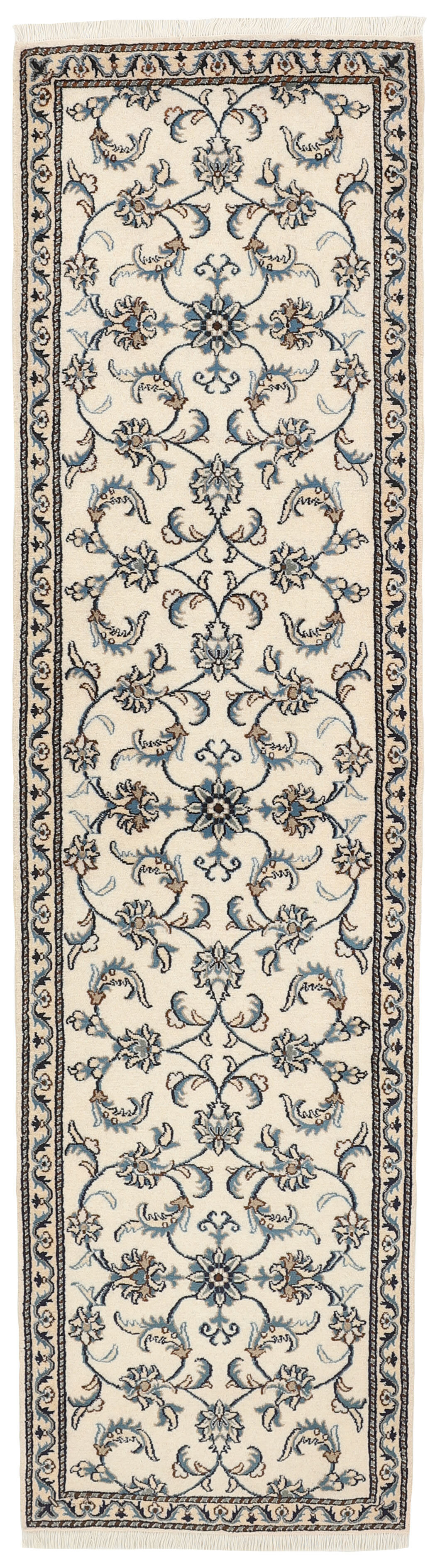 Nain KashmarItem no.: 1519890 Size: 76 cm x 293 cmNain is a city of about 50.000 people, located in the Isfahan Province. It has historic significance, since it was the last stop on caravan routes before Kavir-a-Lut, one of the deserts that stretch through the centre of Iran. The Nain Mosque is one of Iran’s oldest, and is built far better than the later and more famous mosques of Isfahan. The industry in Nain was traditionally focused on the production of wool garments, but the weavers switched to rug production when the demand fell. Their new products soon became famous, as the weavers were skilled and used good quality materials. The warp and weft are cotton, with a wool pile and contours of silk. Sometimes, silk is used more in the base. The colours are refined; nuances of ivory and cream, with small areas of red, green, and blue. As with the rugs from Isfahan, the patterns of the Nain rugs are also classical. The Nain rugs are made in all sizes, including the very large of up to 60m2, and some of these have a pure silk pile. The largest Nain rug produced was 20 by 20 metres.