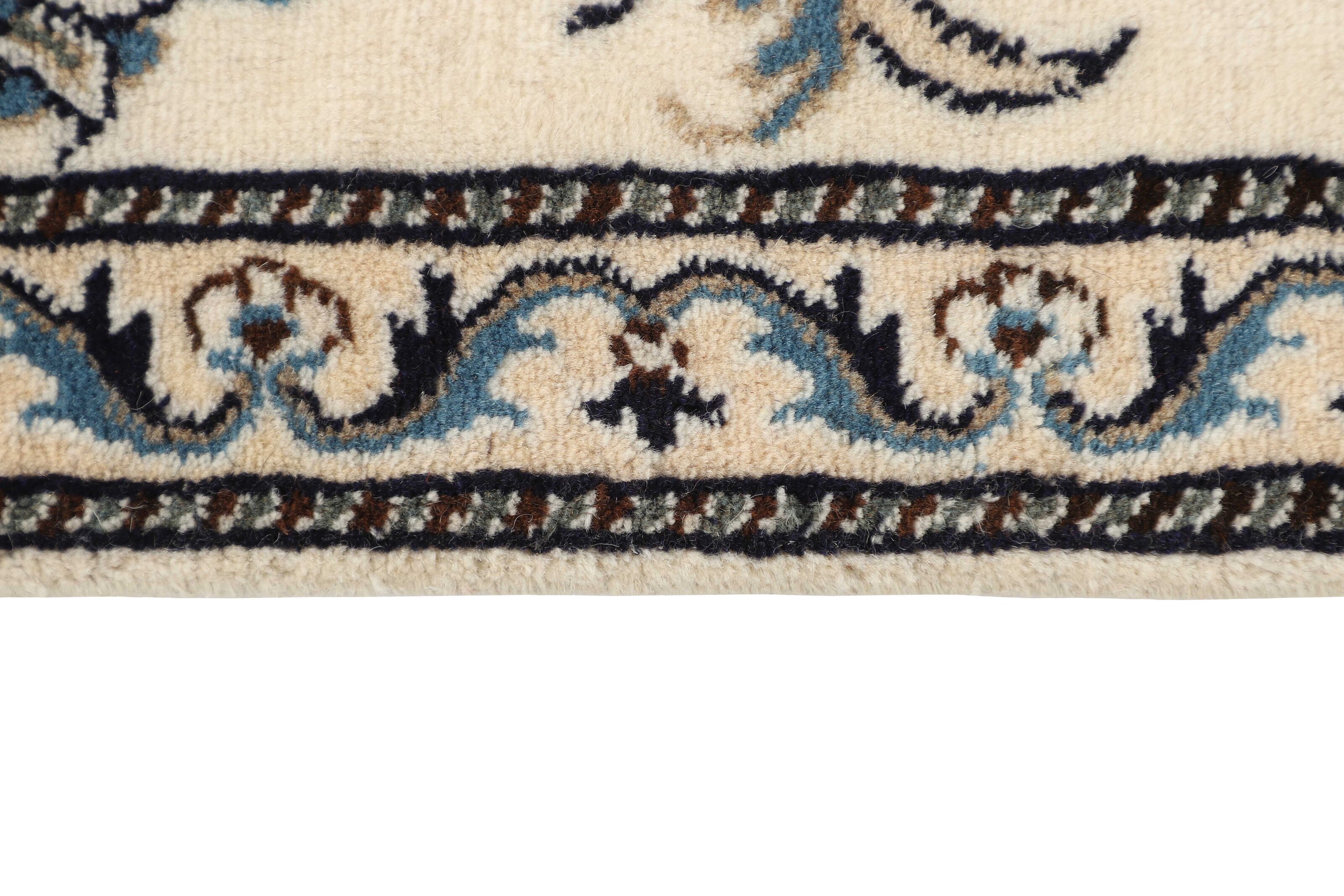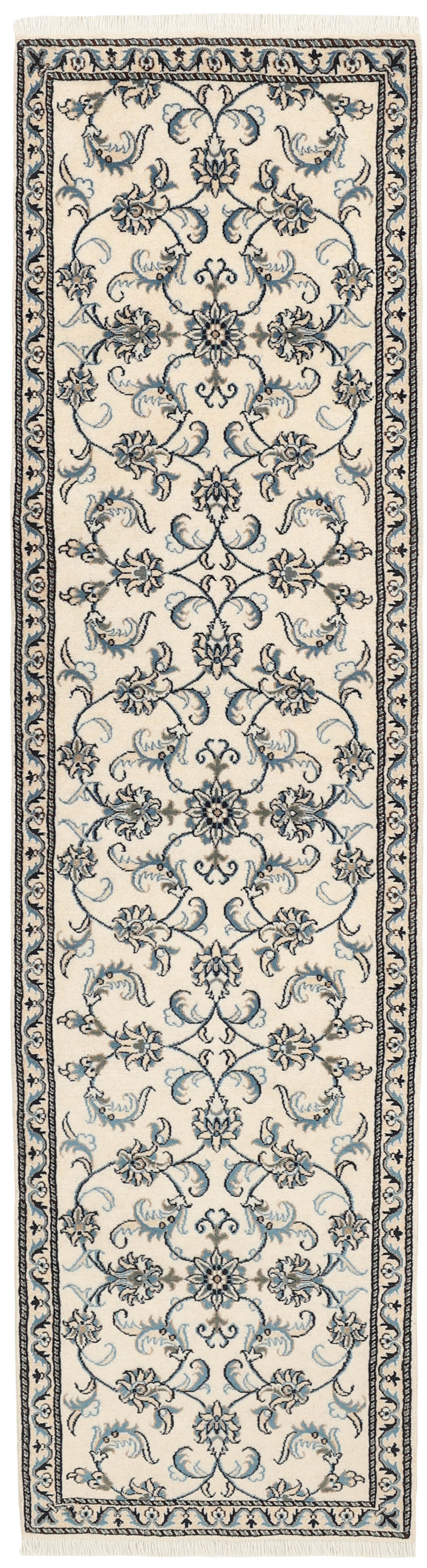 Nain KashmarItem no.: 1519891 Size: 79 cm x 298 cmNain is a city of about 50.000 people, located in the Isfahan Province. It has historic significance, since it was the last stop on caravan routes before Kavir-a-Lut, one of the deserts that stretch through the centre of Iran. The Nain Mosque is one of Iran’s oldest, and is built far better than the later and more famous mosques of Isfahan. The industry in Nain was traditionally focused on the production of wool garments, but the weavers switched to rug production when the demand fell. Their new products soon became famous, as the weavers were skilled and used good quality materials. The warp and weft are cotton, with a wool pile and contours of silk. Sometimes, silk is used more in the base. The colours are refined; nuances of ivory and cream, with small areas of red, green, and blue. As with the rugs from Isfahan, the patterns of the Nain rugs are also classical. The Nain rugs are made in all sizes, including the very large of up to 60m2, and some of these have a pure silk pile. The largest Nain rug produced was 20 by 20 metres.