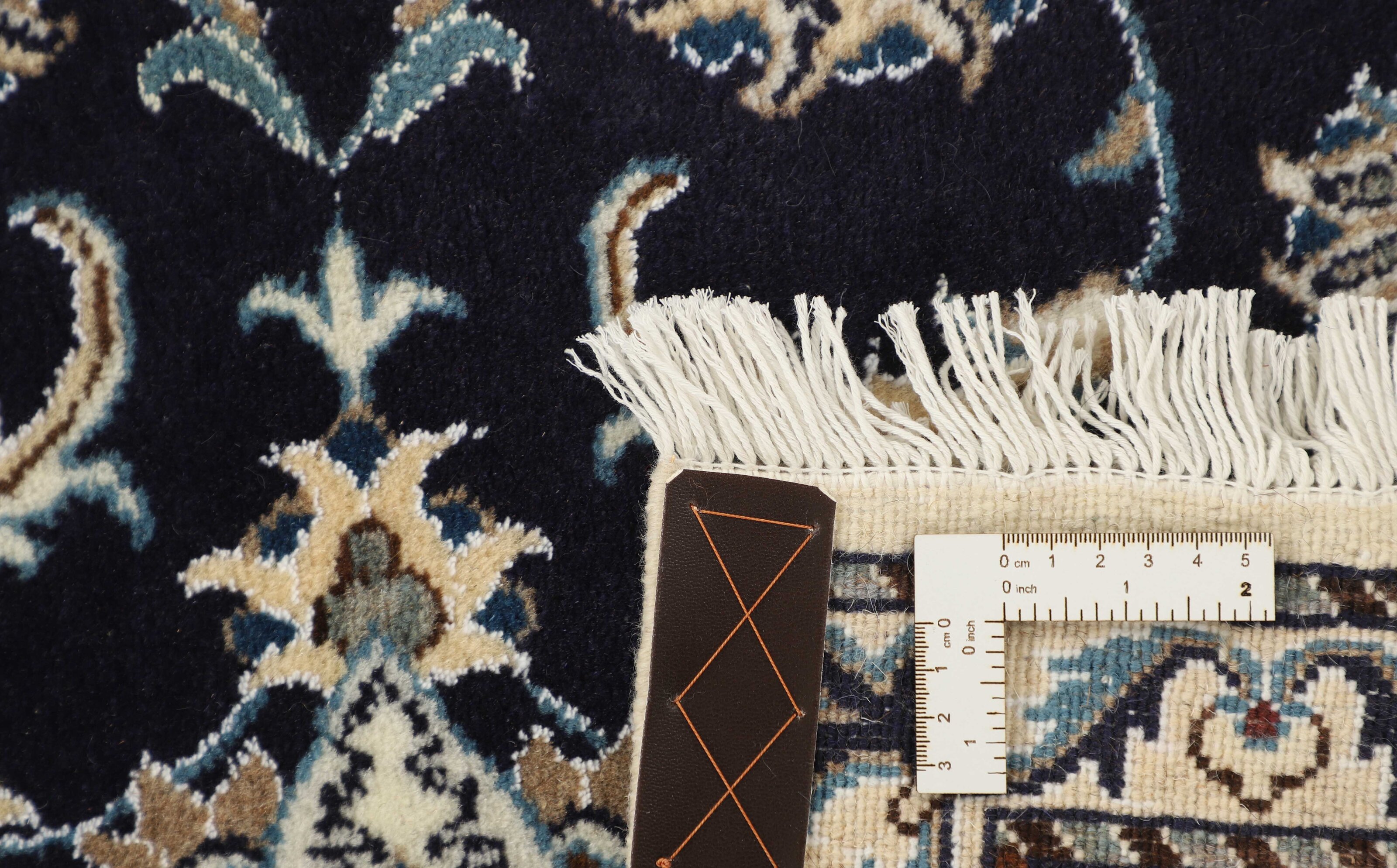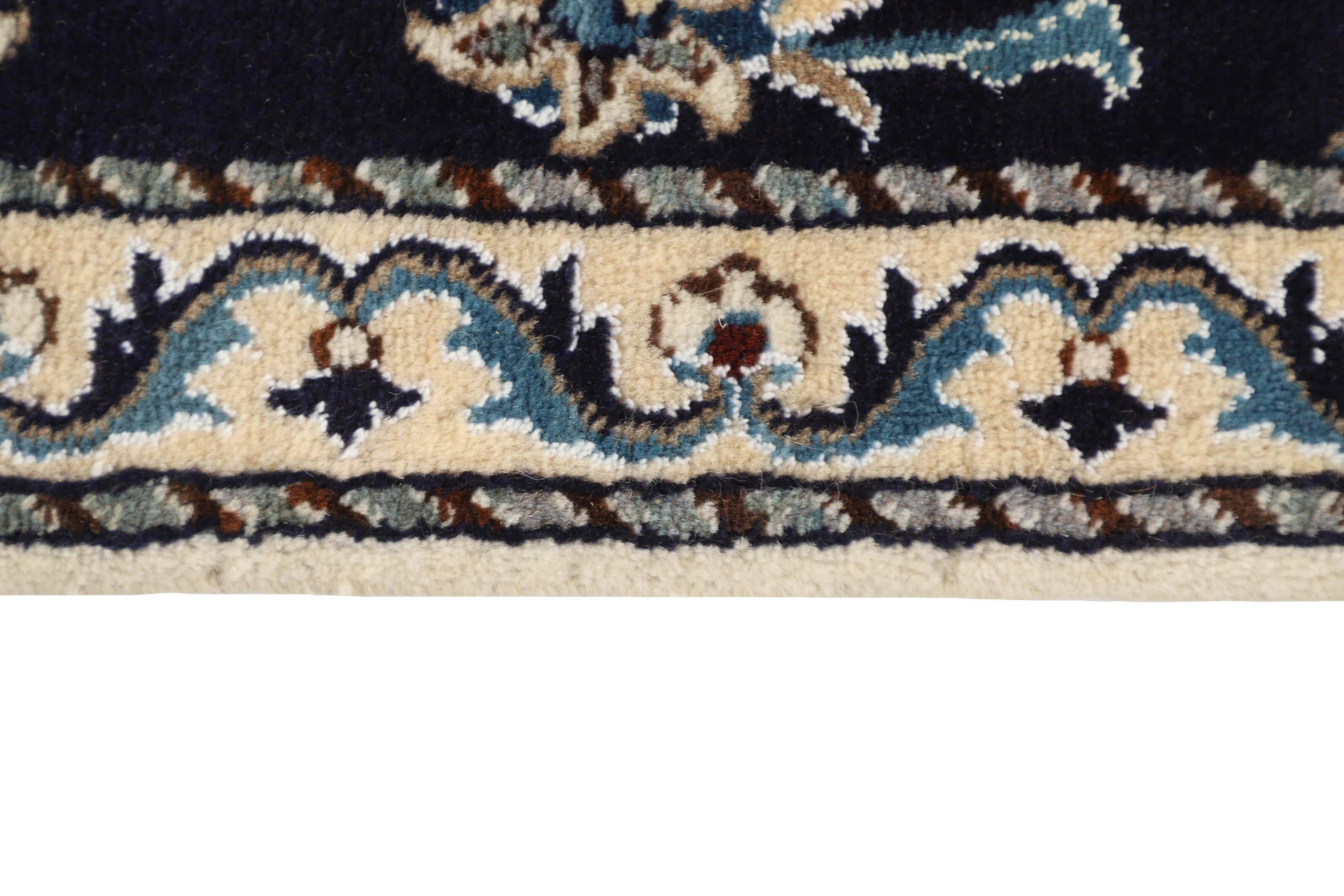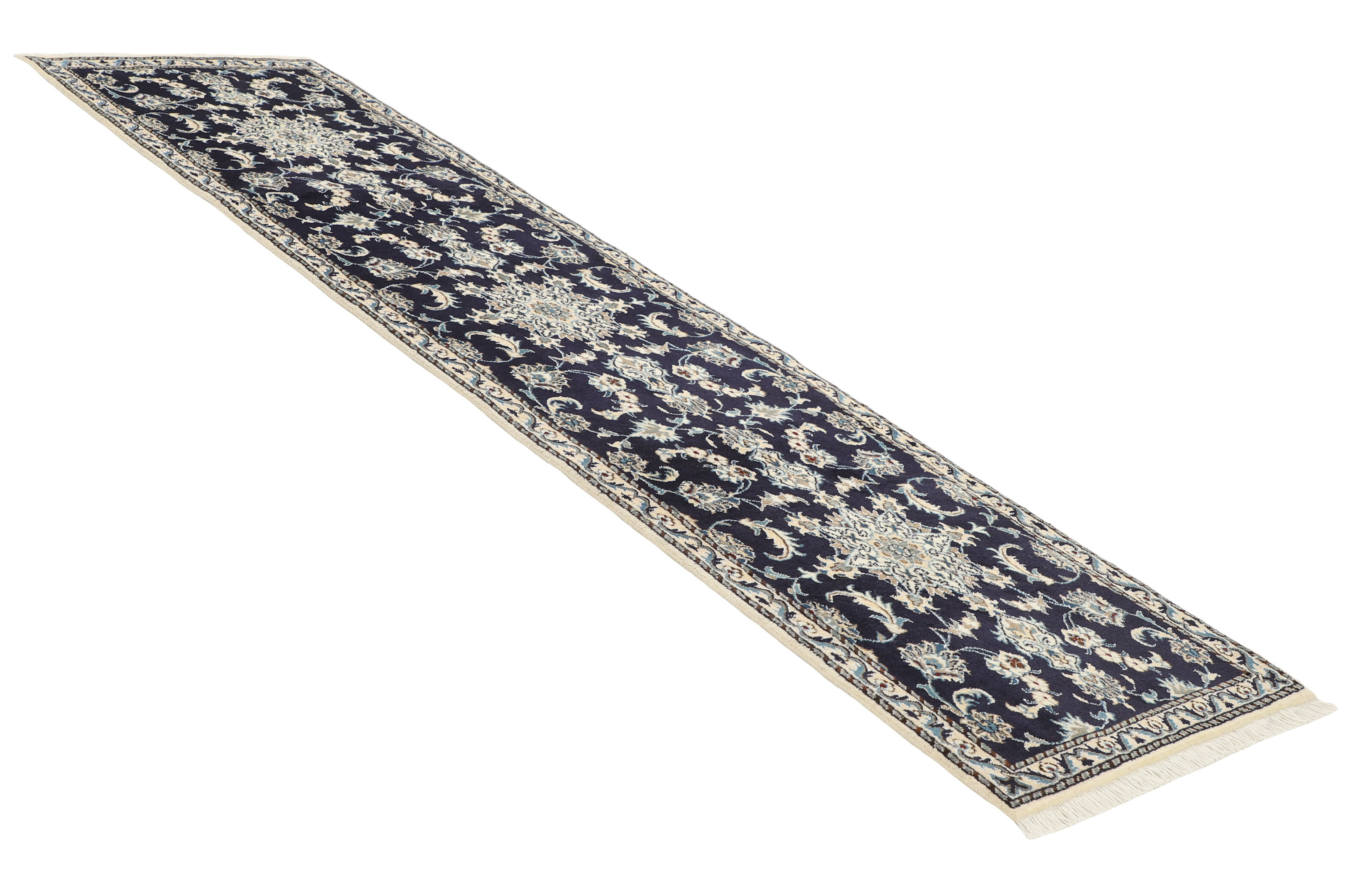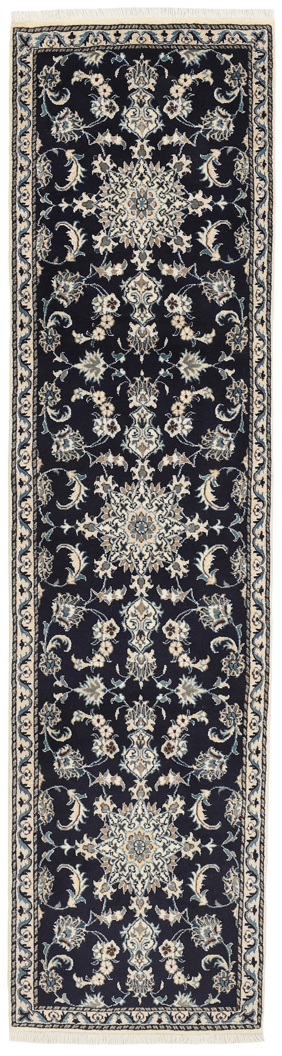 Nain KashmarItem no.: 1519893 Size: 75 cm x 292 cmNain is a city of about 50.000 people, located in the Isfahan Province. It has historic significance, since it was the last stop on caravan routes before Kavir-a-Lut, one of the deserts that stretch through the centre of Iran. The Nain Mosque is one of Iran’s oldest, and is built far better than the later and more famous mosques of Isfahan. The industry in Nain was traditionally focused on the production of wool garments, but the weavers switched to rug production when the demand fell. Their new products soon became famous, as the weavers were skilled and used good quality materials. The warp and weft are cotton, with a wool pile and contours of silk. Sometimes, silk is used more in the base. The colours are refined; nuances of ivory and cream, with small areas of red, green, and blue. As with the rugs from Isfahan, the patterns of the Nain rugs are also classical. The Nain rugs are made in all sizes, including the very large of up to 60m2, and some of these have a pure silk pile. The largest Nain rug produced was 20 by 20 metres.