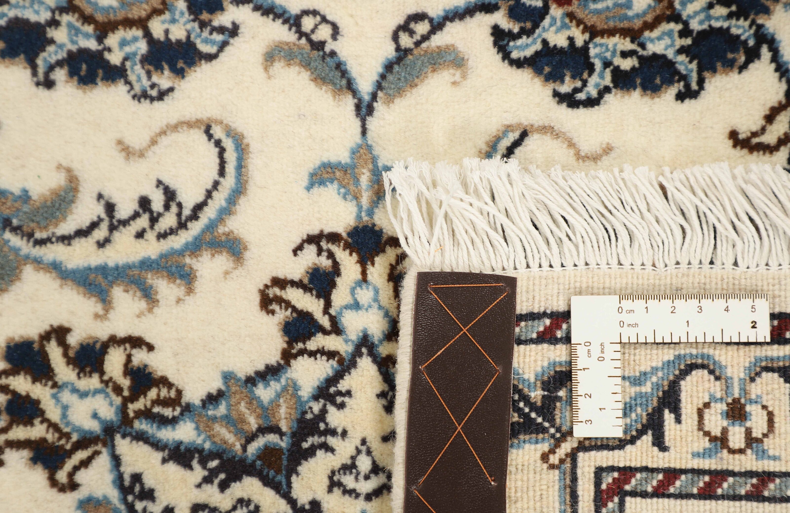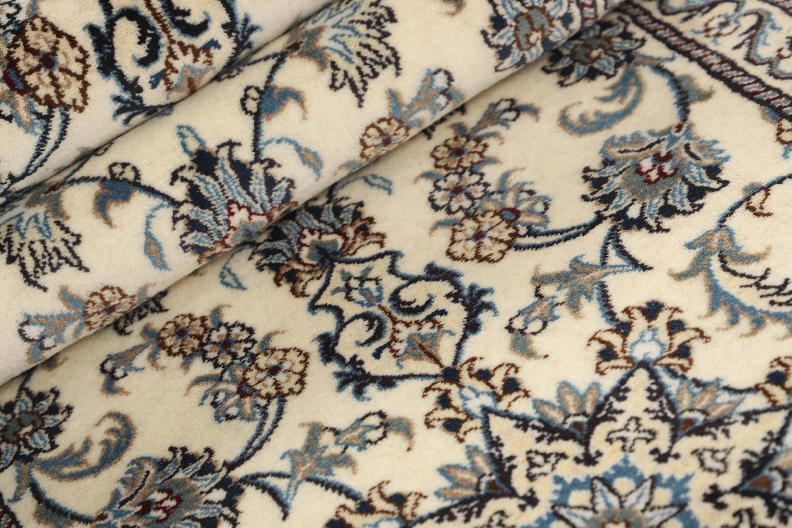 Nain KashmarItem no.: 1519896 Size: 71 cm x 389 cmNain is a city of about 50.000 people, located in the Isfahan Province. It has historic significance, since it was the last stop on caravan routes before Kavir-a-Lut, one of the deserts that stretch through the centre of Iran. The Nain Mosque is one of Iran’s oldest, and is built far better than the later and more famous mosques of Isfahan. The industry in Nain was traditionally focused on the production of wool garments, but the weavers switched to rug production when the demand fell. Their new products soon became famous, as the weavers were skilled and used good quality materials. The warp and weft are cotton, with a wool pile and contours of silk. Sometimes, silk is used more in the base. The colours are refined; nuances of ivory and cream, with small areas of red, green, and blue. As with the rugs from Isfahan, the patterns of the Nain rugs are also classical. The Nain rugs are made in all sizes, including the very large of up to 60m2, and some of these have a pure silk pile. The largest Nain rug produced was 20 by 20 metres.