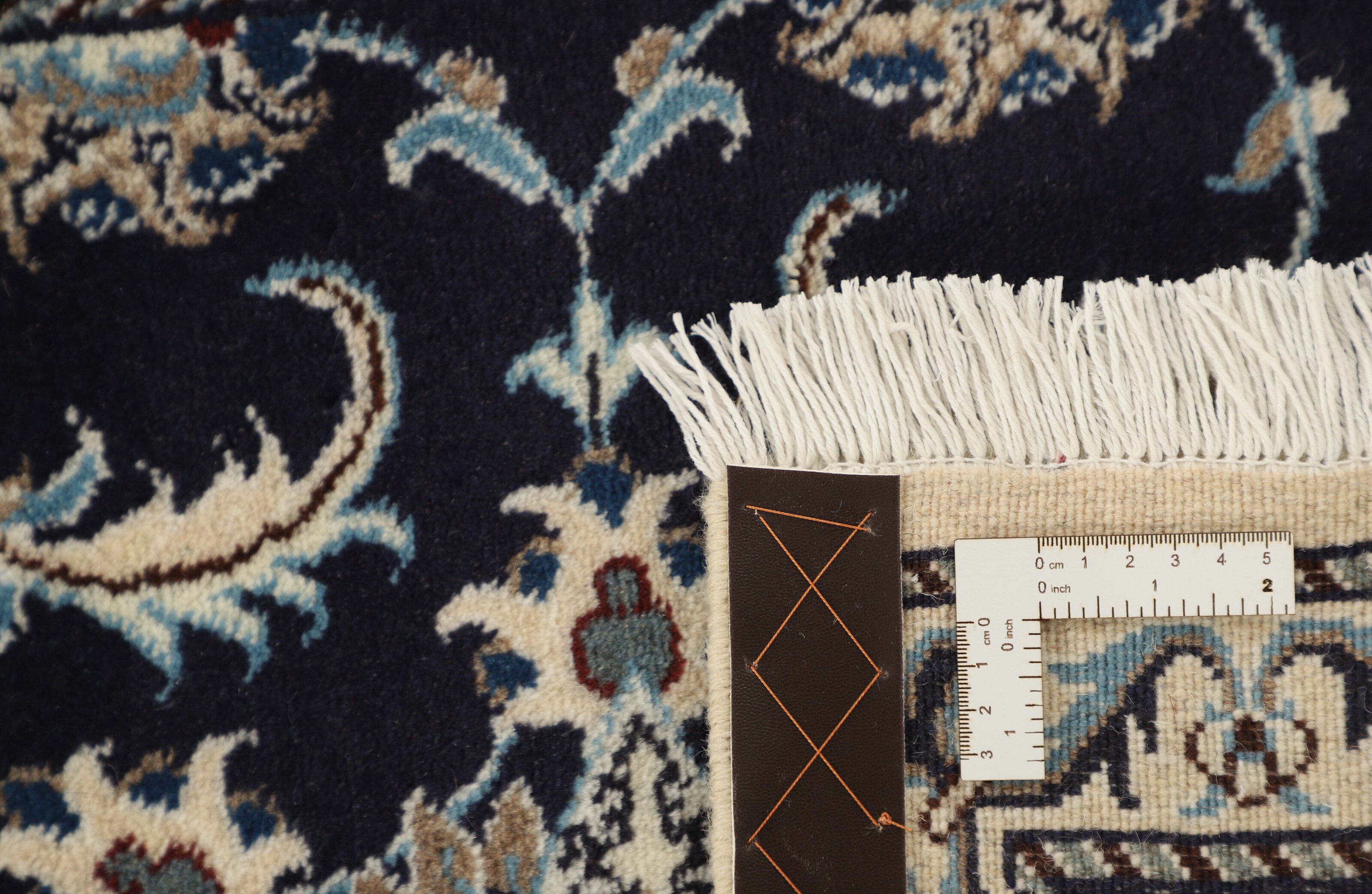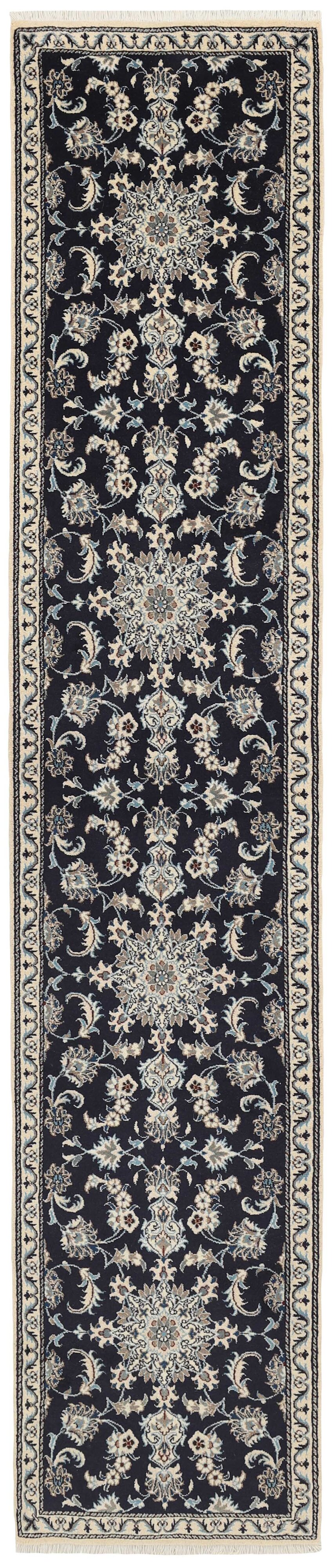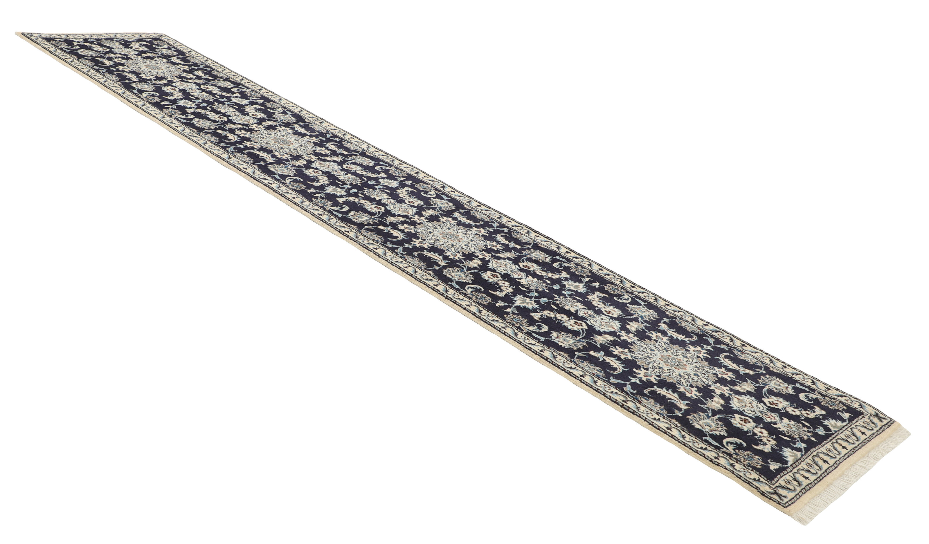 Nain KashmarItem no.: 1519904 Size: 78 cm x 387 cmNain is a city of about 50.000 people, located in the Isfahan Province. It has historic significance, since it was the last stop on caravan routes before Kavir-a-Lut, one of the deserts that stretch through the centre of Iran. The Nain Mosque is one of Iran’s oldest, and is built far better than the later and more famous mosques of Isfahan. The industry in Nain was traditionally focused on the production of wool garments, but the weavers switched to rug production when the demand fell. Their new products soon became famous, as the weavers were skilled and used good quality materials. The warp and weft are cotton, with a wool pile and contours of silk. Sometimes, silk is used more in the base. The colours are refined; nuances of ivory and cream, with small areas of red, green, and blue. As with the rugs from Isfahan, the patterns of the Nain rugs are also classical. The Nain rugs are made in all sizes, including the very large of up to 60m2, and some of these have a pure silk pile. The largest Nain rug produced was 20 by 20 metres.
