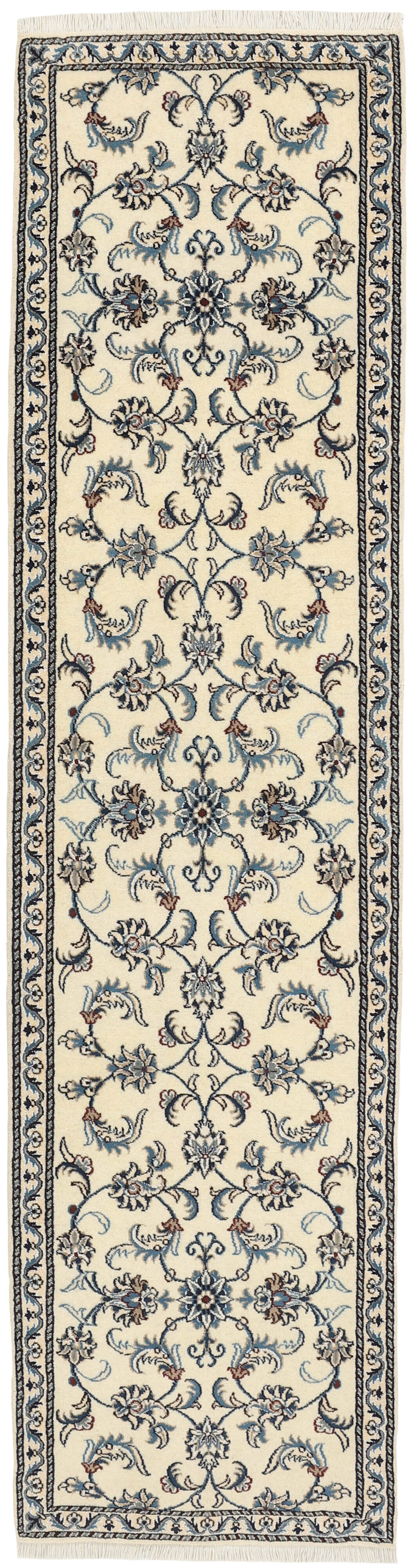 Nain KashmarItem no.: 1519905 Size: 77 cm x 300 cmNain is a city of about 50.000 people, located in the Isfahan Province. It has historic significance, since it was the last stop on caravan routes before Kavir-a-Lut, one of the deserts that stretch through the centre of Iran. The Nain Mosque is one of Iran’s oldest, and is built far better than the later and more famous mosques of Isfahan. The industry in Nain was traditionally focused on the production of wool garments, but the weavers switched to rug production when the demand fell. Their new products soon became famous, as the weavers were skilled and used good quality materials. The warp and weft are cotton, with a wool pile and contours of silk. Sometimes, silk is used more in the base. The colours are refined; nuances of ivory and cream, with small areas of red, green, and blue. As with the rugs from Isfahan, the patterns of the Nain rugs are also classical. The Nain rugs are made in all sizes, including the very large of up to 60m2, and some of these have a pure silk pile. The largest Nain rug produced was 20 by 20 metres.