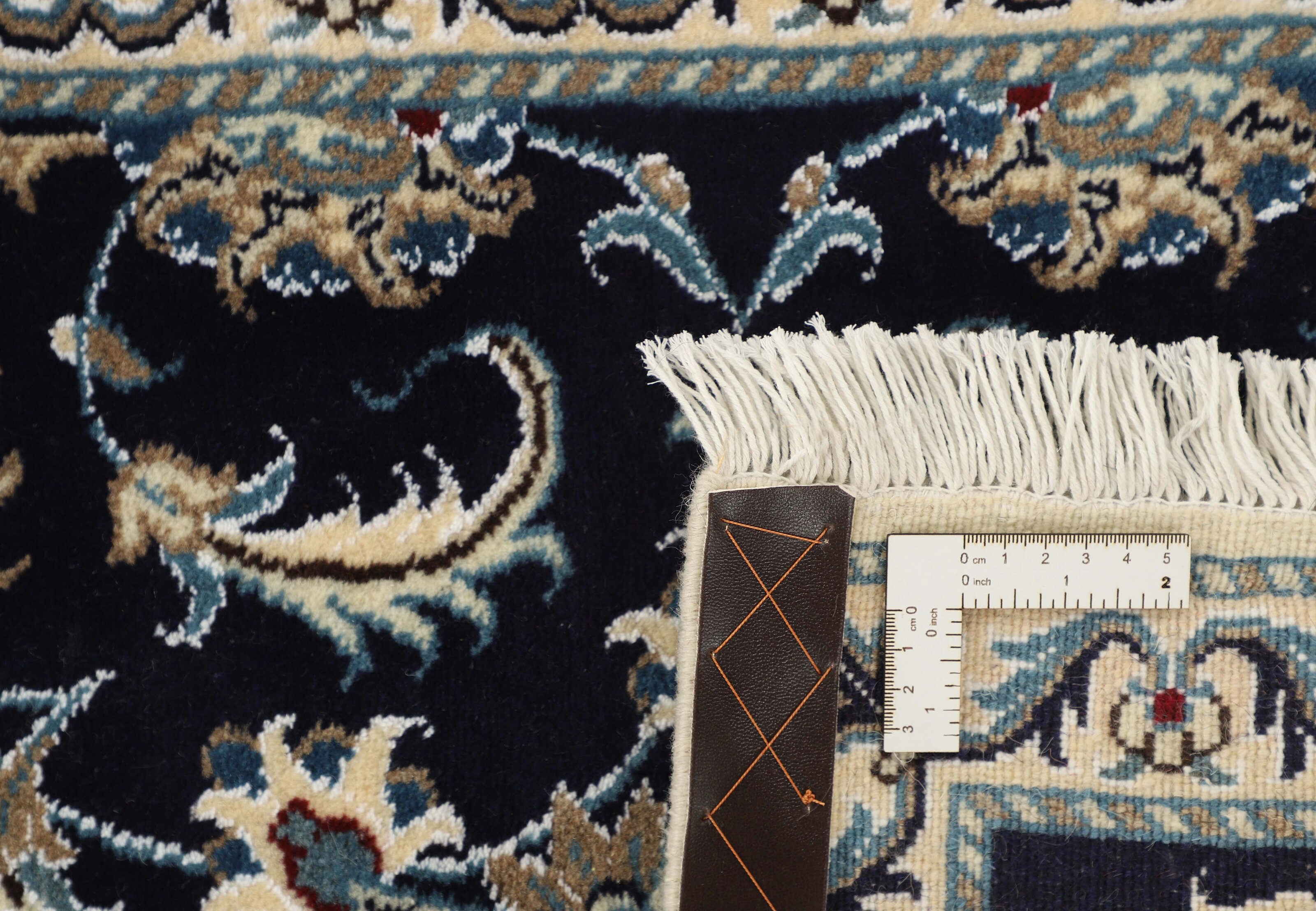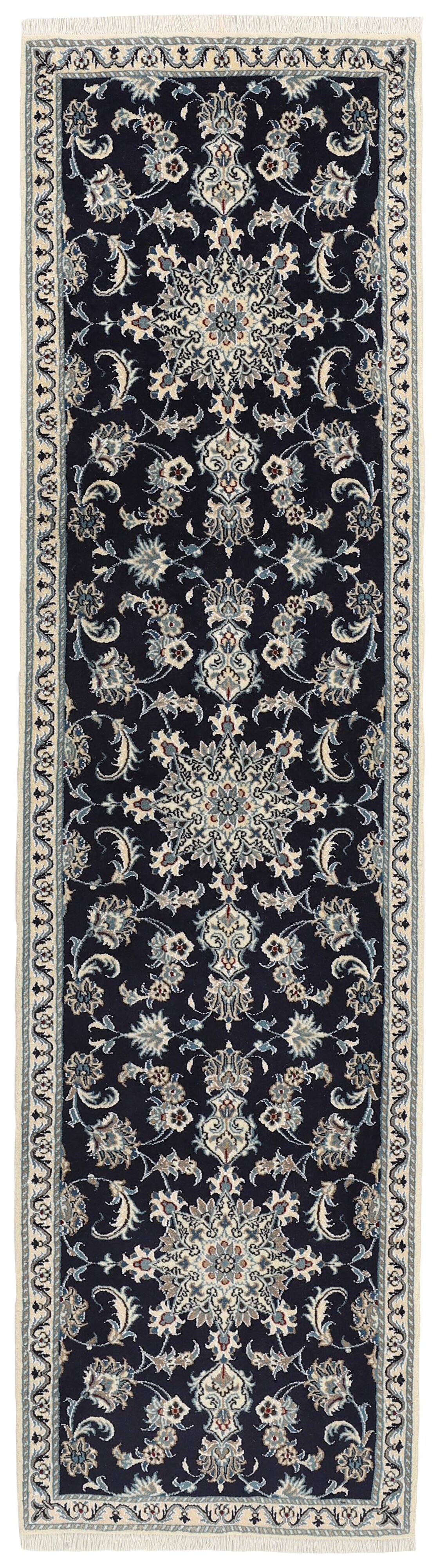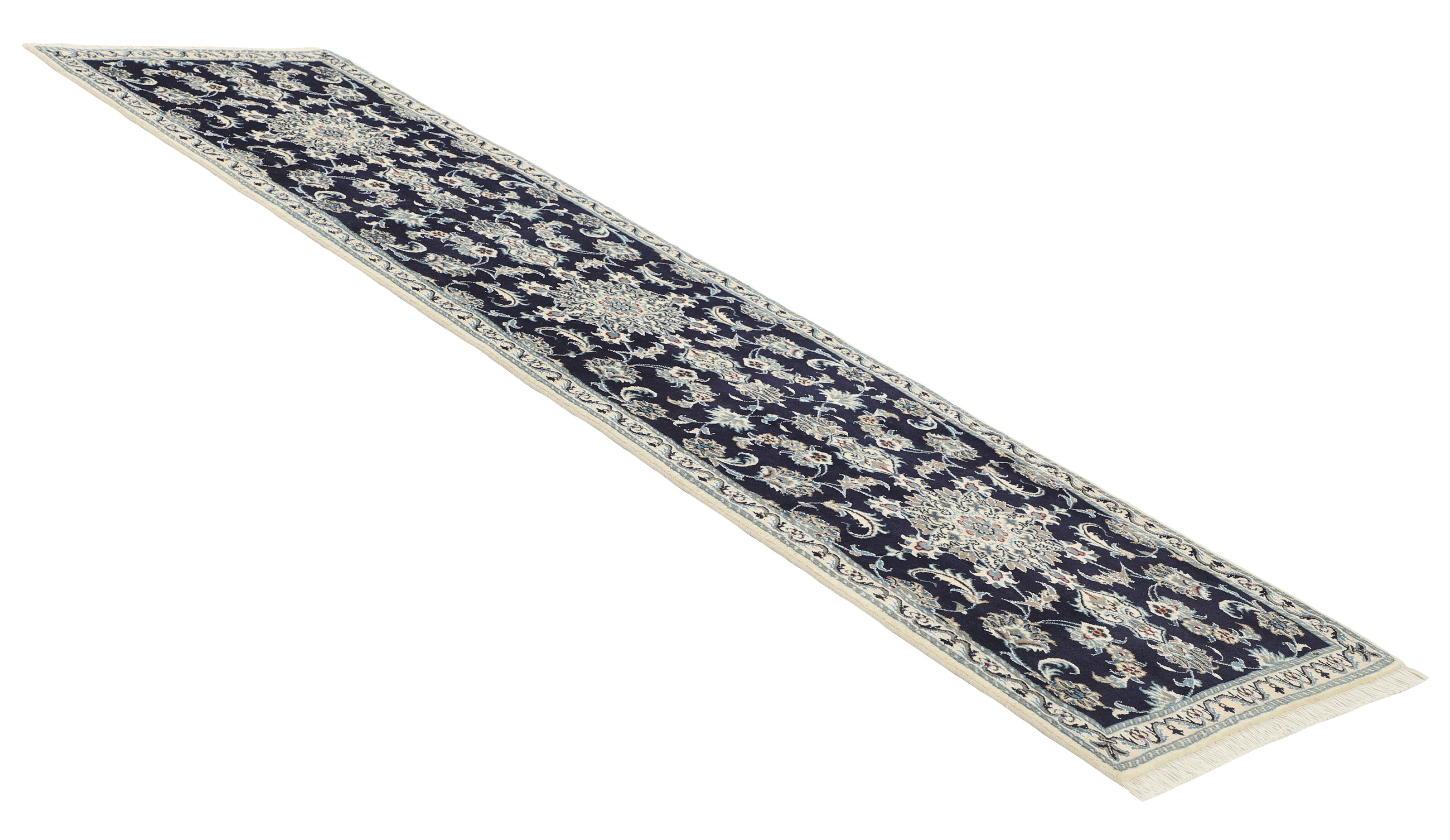 Nain KashmarItem no.: 1519908 Size: 79 cm x 292 cmNain is a city of about 50.000 people, located in the Isfahan Province. It has historic significance, since it was the last stop on caravan routes before Kavir-a-Lut, one of the deserts that stretch through the centre of Iran. The Nain Mosque is one of Iran’s oldest, and is built far better than the later and more famous mosques of Isfahan. The industry in Nain was traditionally focused on the production of wool garments, but the weavers switched to rug production when the demand fell. Their new products soon became famous, as the weavers were skilled and used good quality materials. The warp and weft are cotton, with a wool pile and contours of silk. Sometimes, silk is used more in the base. The colours are refined; nuances of ivory and cream, with small areas of red, green, and blue. As with the rugs from Isfahan, the patterns of the Nain rugs are also classical. The Nain rugs are made in all sizes, including the very large of up to 60m2, and some of these have a pure silk pile. The largest Nain rug produced was 20 by 20 metres.