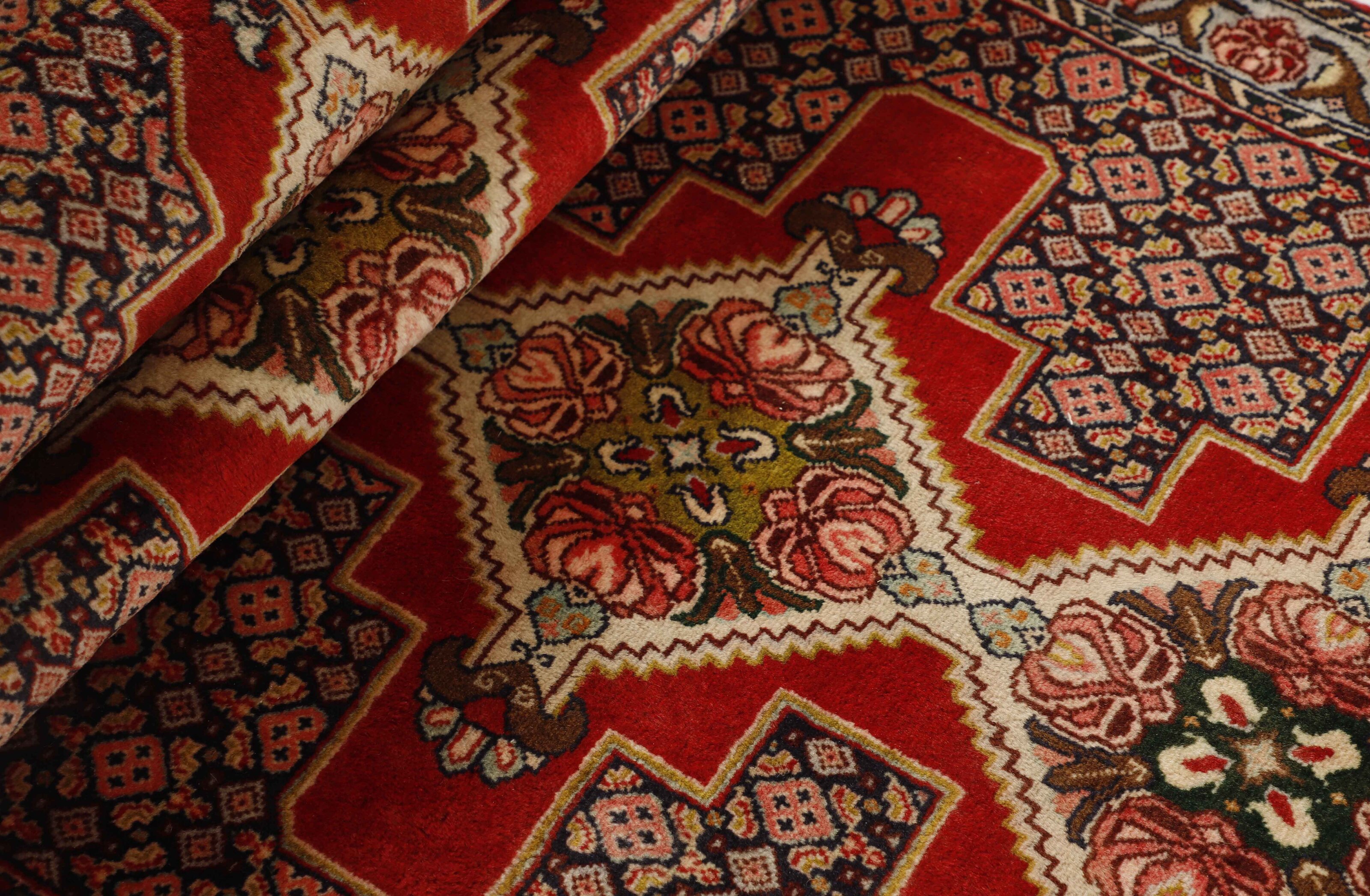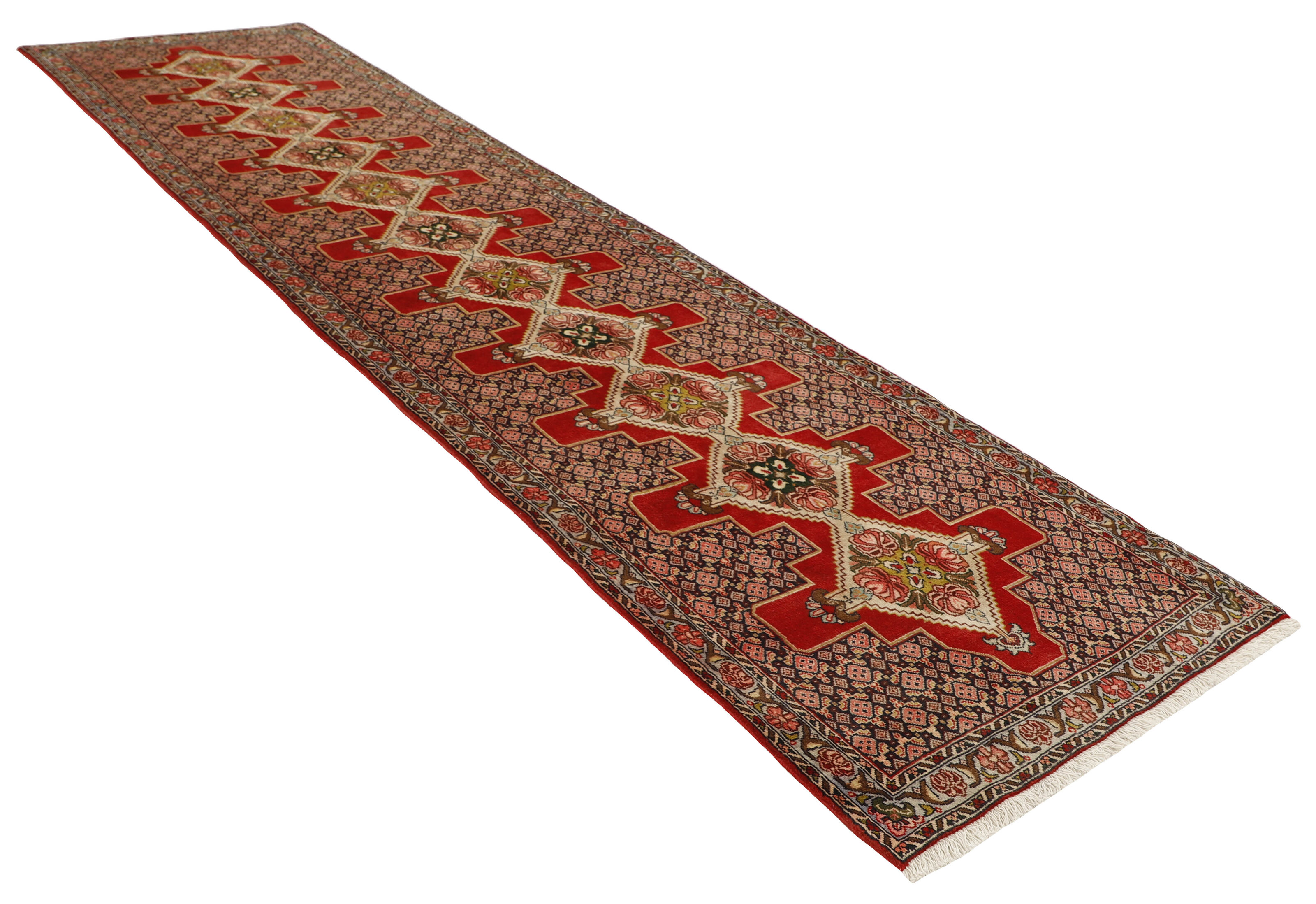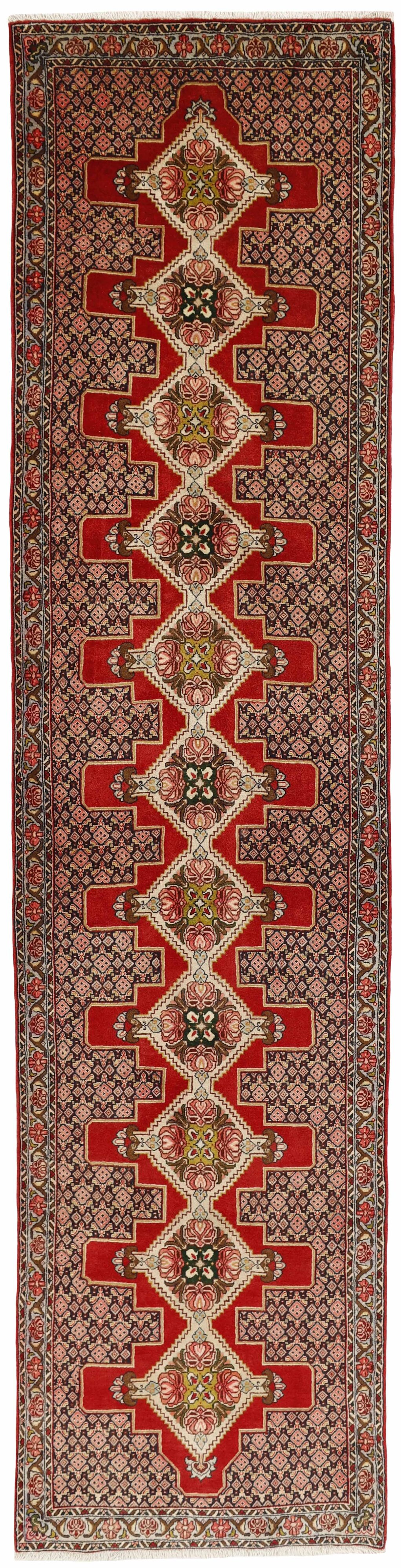 SenehItem no.: 1514464 Size: 93 cm x 386 cmSeneh in Sanadaj is the capitol of the Kurdistan province of north-western Iran, and has about 300.000 inhabitants, most of them Kurds from the Gurani Tribe. Seneh rugs are easily recognisable by their knotting method, as well as the pattern colours and wool used. They usually have a simple weft, and the back of the rugs is often coarse and grainy, as the wool is spun tightly by hand before the knotting. Sometimes, a firm Bidjar-like knotting can be seen. Characteristically, the colours are deep blue, green, dark red, and white. Seneh wool is among the best qualities of wool in Iran: firm and durable, with a deep glow, a result of the high altitude, the sparse vegetation, and extremes in temperature. The tribal knotters in the area use the same type of wool. In the 19th century, Seneh rugs were famous for their fineness and the variation in patterns, while the modern production is less fine and not as varied. The Ghiordis knot is usually used, but you will also encounter rugs from Seneh with the Seneh knot. The typical Seneh rug has a Herati pattern field, with a series of geometrical medallions, one inside the other, each repeating the pattern with a different ground colour. Sometimes, the older, more uniform patterns are seen: Boteh, Vekili, Gol-Farang (naturalistic, European style bundles of flowers) or Gol-i-Bulbul (birds and flowers).