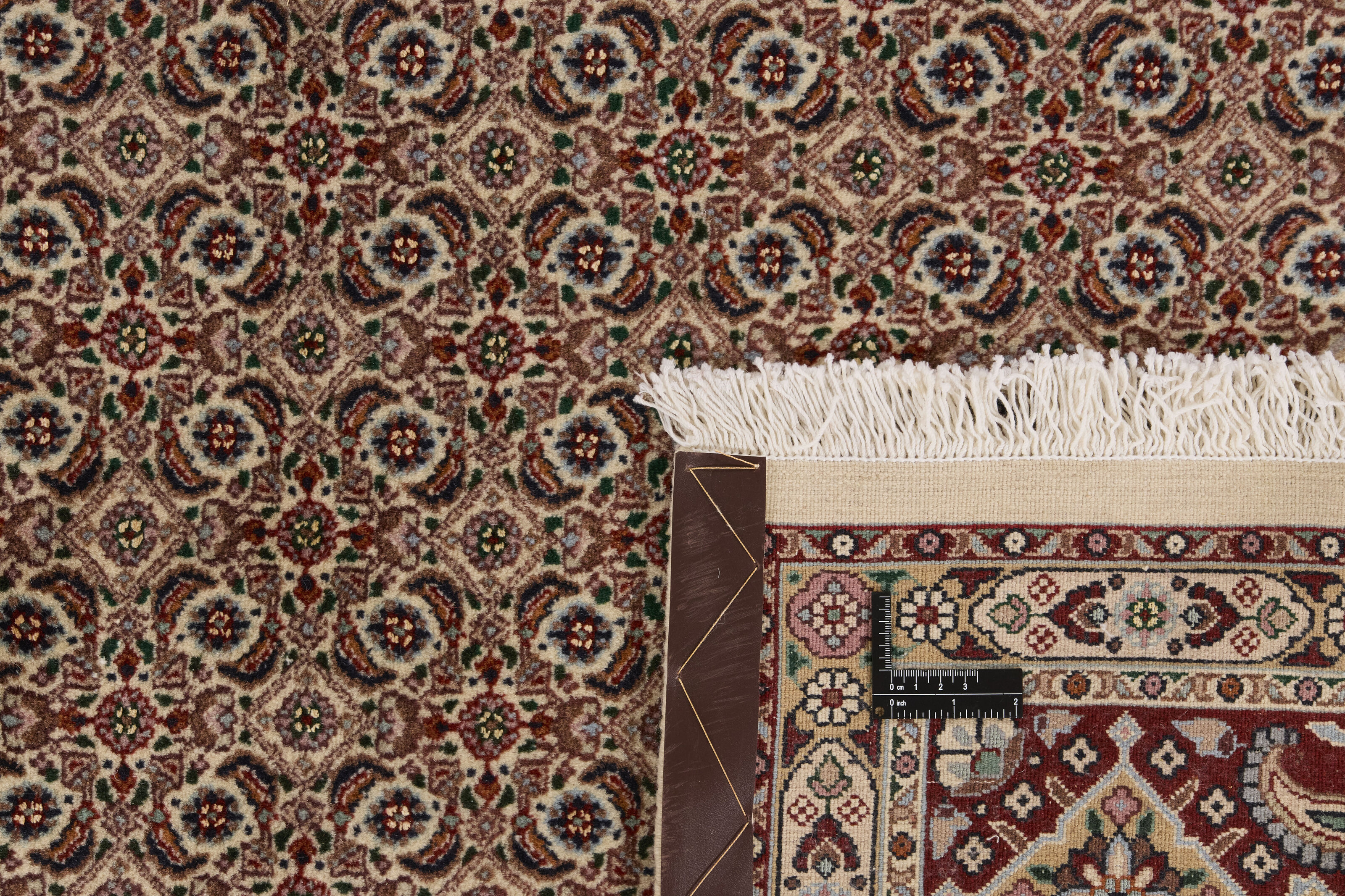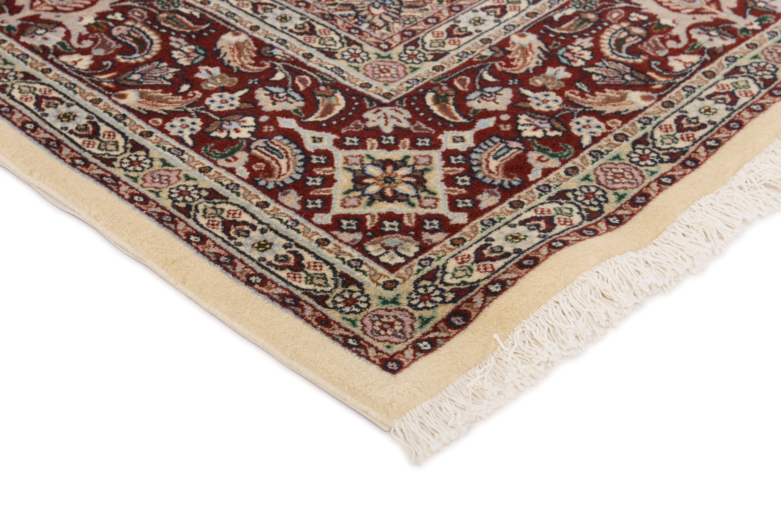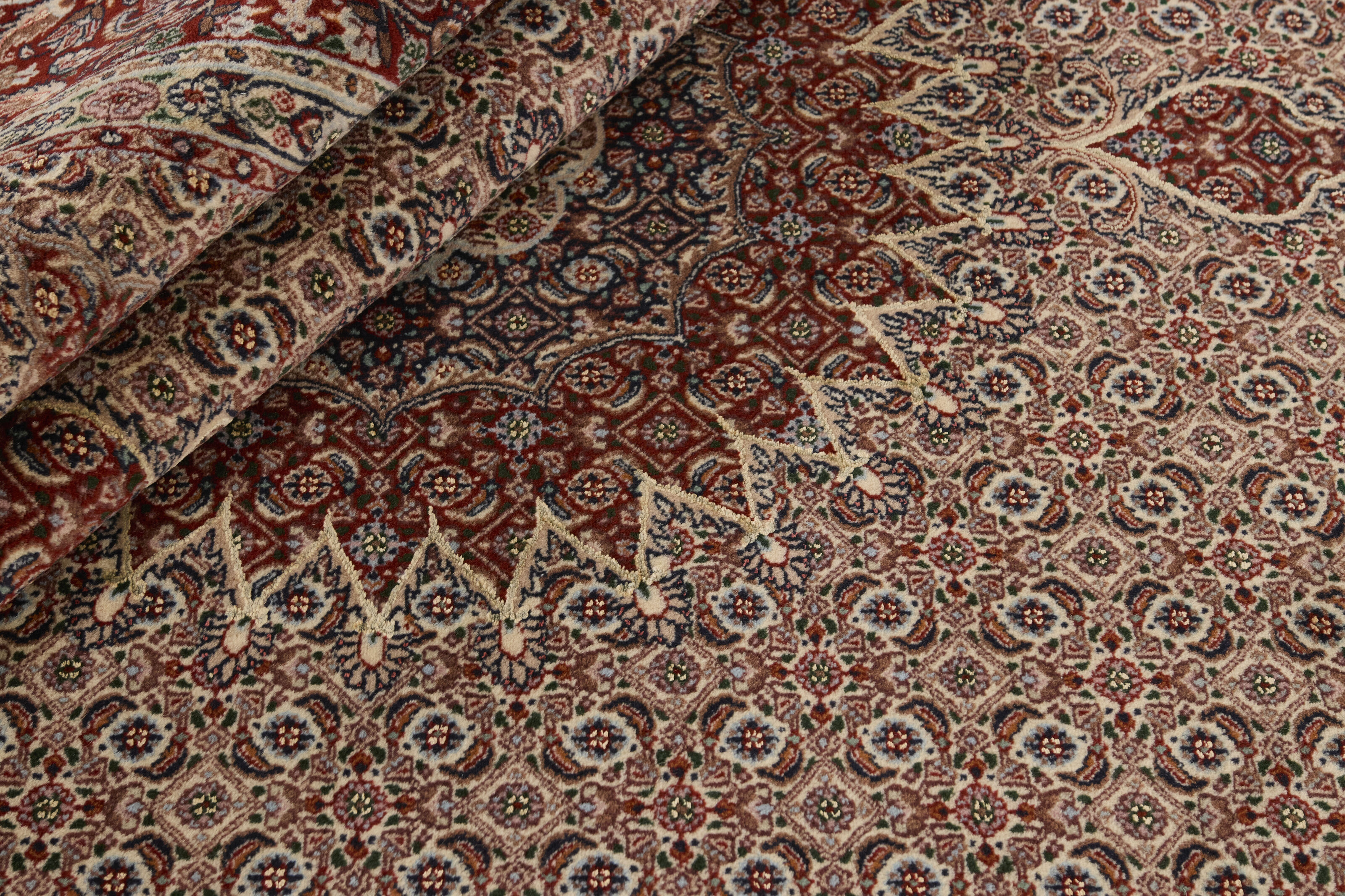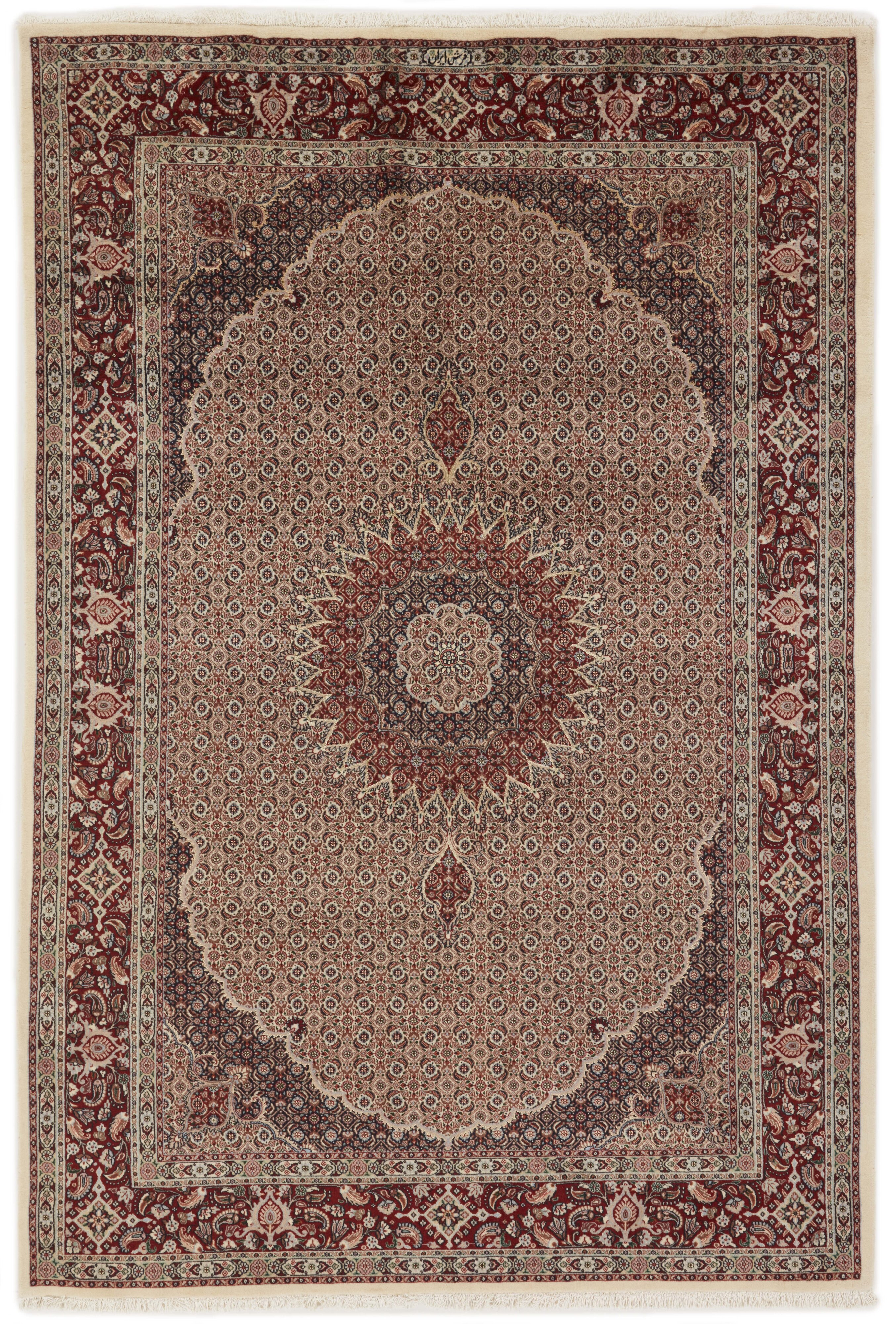 Moud Mahi SherkatItem no.: 1520421 Size: 200 cm x 300 cmMoud is a small town south of Mashad, in the Khorrasan Province. Rugs from this area are characterised by homogeneity in patterns and quality. Warp and weft are cotton and the pile is wool. The trimmings are a version of the traditional Persian turtle trimming. The rugs are produced in all sizes. Moud rugs are often copied in India, because of their remarkable homogeneity. The characteristic Moud designs are among the most uniform, evenly knotted, and easily recognisable designs of the Khorrasan Province. Moud Mahi are made in a beige, light red, or blue tone, with all-over Mahi patterns or with a star shaped medallion. Mahi means fish, and the Mahi pattern is the most commonly used pattern in genuine Persian rugs. When looking at it closely, you can see a pond encircled by four fish. Sherkat is the designation for a select series of rug types that are knotted in special workshops as part of a state-controlled project, the purpose of which is to support and thereby preserve the production of fine classical Persian rug patterns.