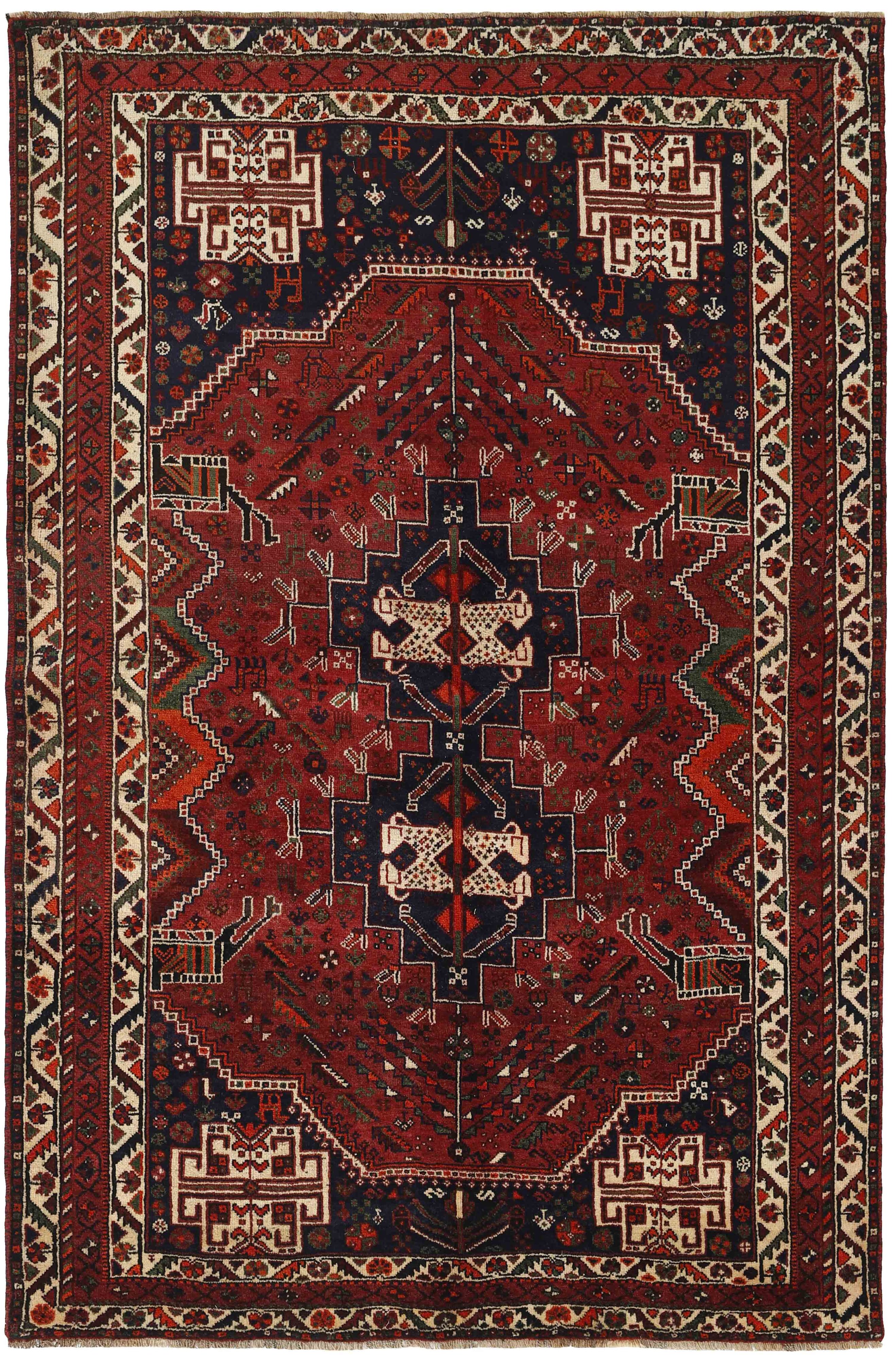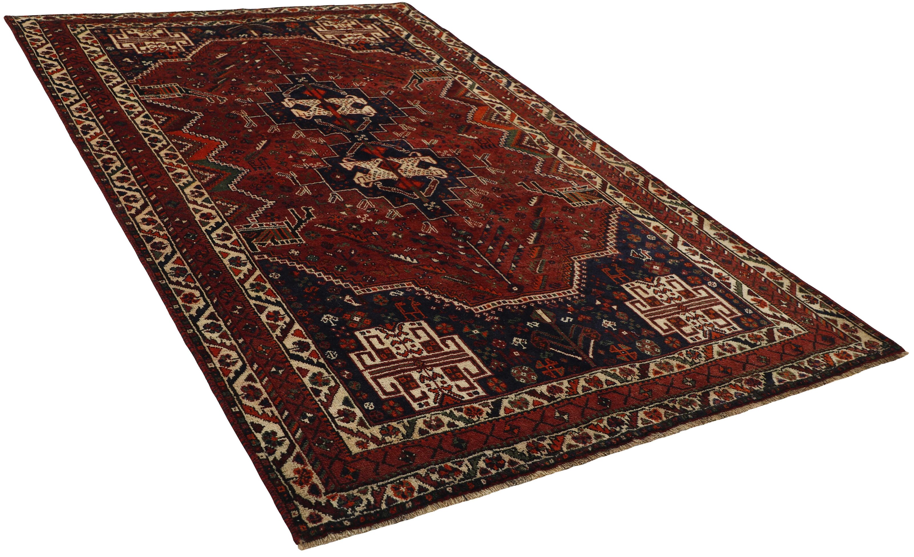 ShirazItem no.: 1461174 Size: 171 cm x 268 cmShiraz, with a population of about one million, is the capitol of the south-eastern province of Fars, and is situated in the Zargros Mountains. Shiraz is an age-old city, which has been the capitol of Iran several times, and it is known as the city of roses and nightingales. It has a reputation of being very relaxed, with a “ we will get around to that tomorrow”-attitude. Shiraz has laid name to rugs that are knotted in the small towns and villages surrounding it, from where they are brought to the city to be sold. The local tribes like the Kashghai, whose best works are even finer and more densely knotted than those knotted in Shiraz itself, also make them. Shiraz rugs are characterised by a deep claret colour, combined with dark blue and small areas of white and green. The wool is soft, and darker wool, sometimes mixed with goat’s hair, is used for both warp and weft. The patterns are coarse and geometrical, often identical to the Kashghai patterns. Often, small, geometrical birds and animals brighten them up. Shiraz rugs are made in all sizes, although big rugs are rare.