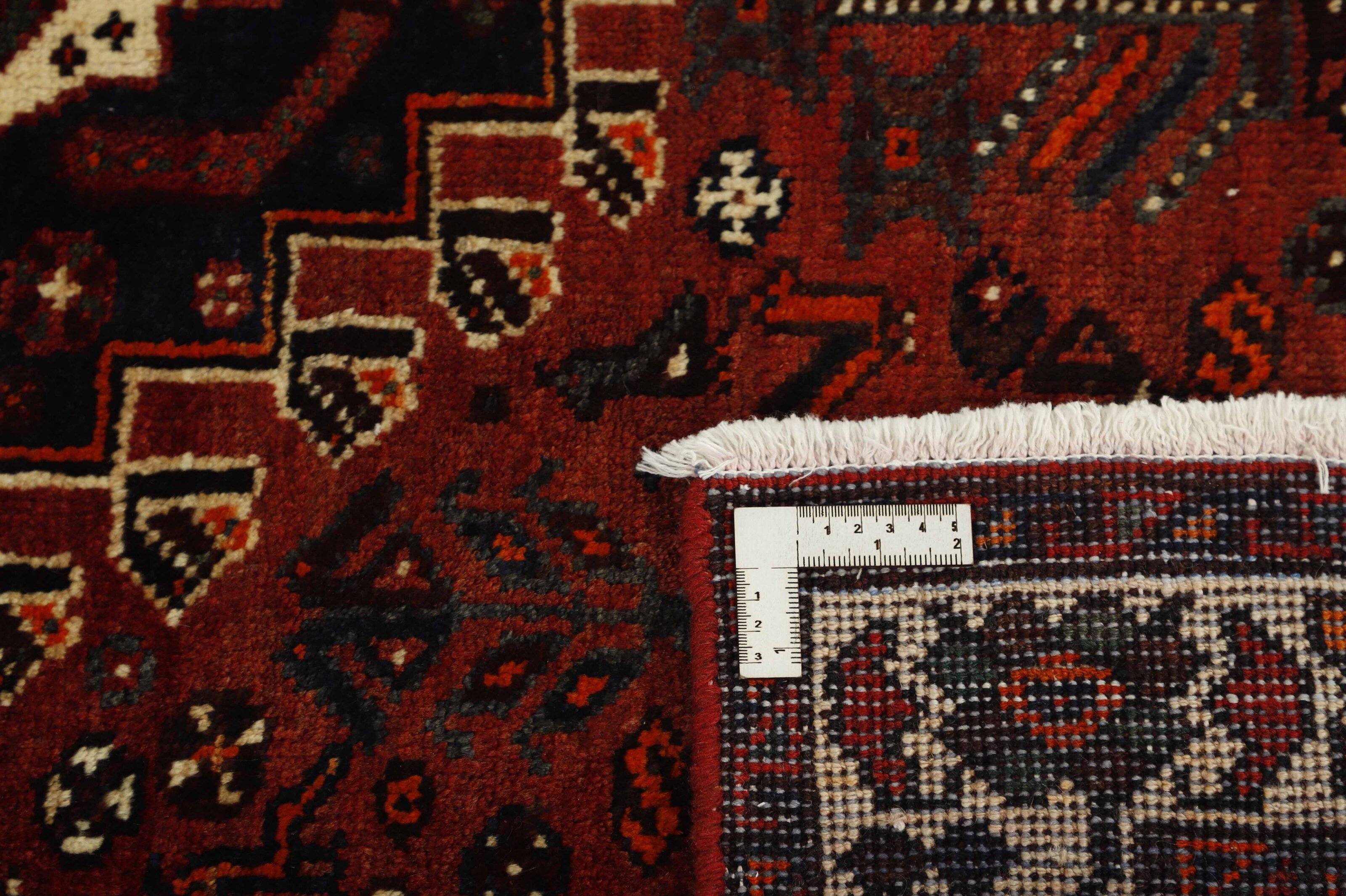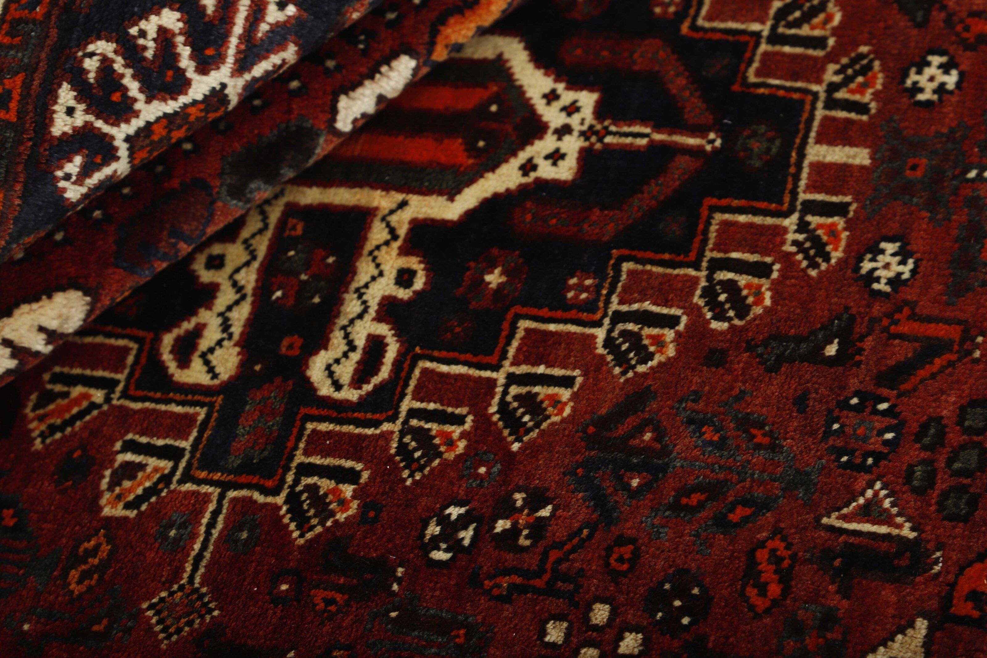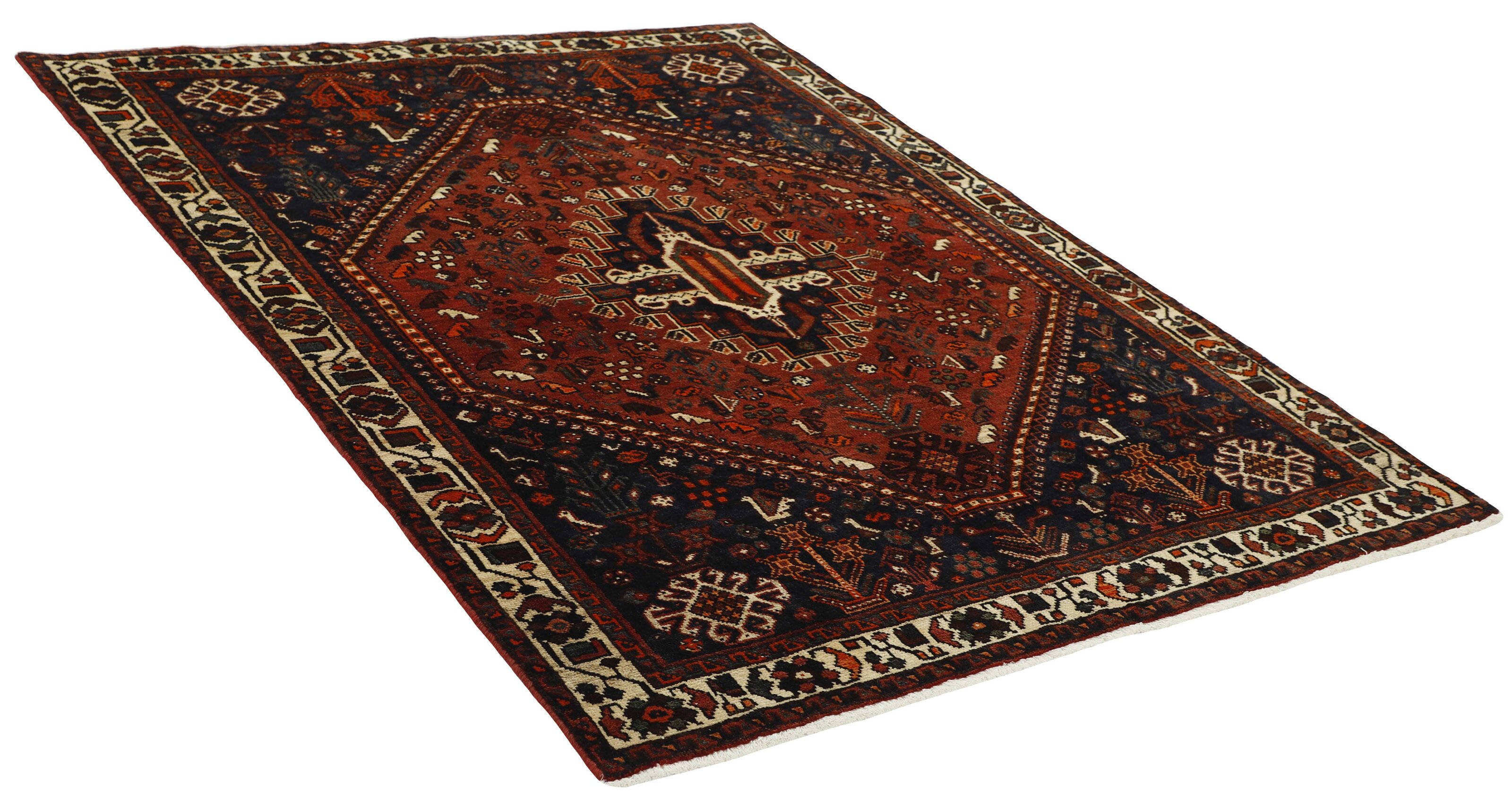 ShirazItem no.: 1489774 Size: 162 cm x 203 cmShiraz, with a population of about one million, is the capitol of the south-eastern province of Fars, and is situated in the Zargros Mountains. Shiraz is an age-old city, which has been the capitol of Iran several times, and it is known as the city of roses and nightingales. It has a reputation of being very relaxed, with a “ we will get around to that tomorrow”-attitude. Shiraz has laid name to rugs that are knotted in the small towns and villages surrounding it, from where they are brought to the city to be sold. The local tribes like the Kashghai, whose best works are even finer and more densely knotted than those knotted in Shiraz itself, also make them. Shiraz rugs are characterised by a deep claret colour, combined with dark blue and small areas of white and green. The wool is soft, and darker wool, sometimes mixed with goat’s hair, is used for both warp and weft. The patterns are coarse and geometrical, often identical to the Kashghai patterns. Often, small, geometrical birds and animals brighten them up. Shiraz rugs are made in all sizes, although big rugs are rare.