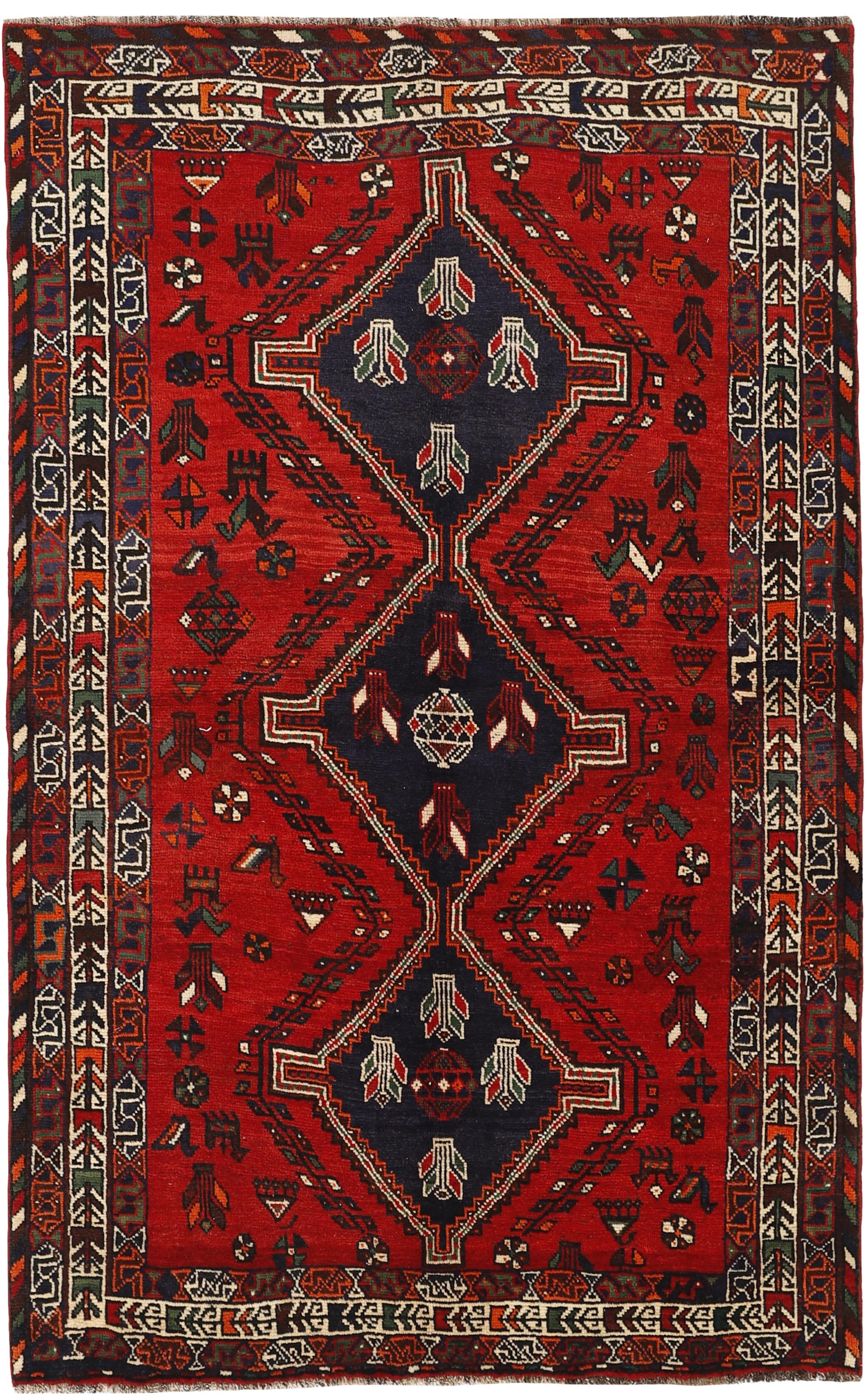 ShirazItem no.: 1489781 Size: 160 cm x 252 cmShiraz, with a population of about one million, is the capitol of the south-eastern province of Fars, and is situated in the Zargros Mountains. Shiraz is an age-old city, which has been the capitol of Iran several times, and it is known as the city of roses and nightingales. It has a reputation of being very relaxed, with a “ we will get around to that tomorrow”-attitude. Shiraz has laid name to rugs that are knotted in the small towns and villages surrounding it, from where they are brought to the city to be sold. The local tribes like the Kashghai, whose best works are even finer and more densely knotted than those knotted in Shiraz itself, also make them. Shiraz rugs are characterised by a deep claret colour, combined with dark blue and small areas of white and green. The wool is soft, and darker wool, sometimes mixed with goat’s hair, is used for both warp and weft. The patterns are coarse and geometrical, often identical to the Kashghai patterns. Often, small, geometrical birds and animals brighten them up. Shiraz rugs are made in all sizes, although big rugs are rare.