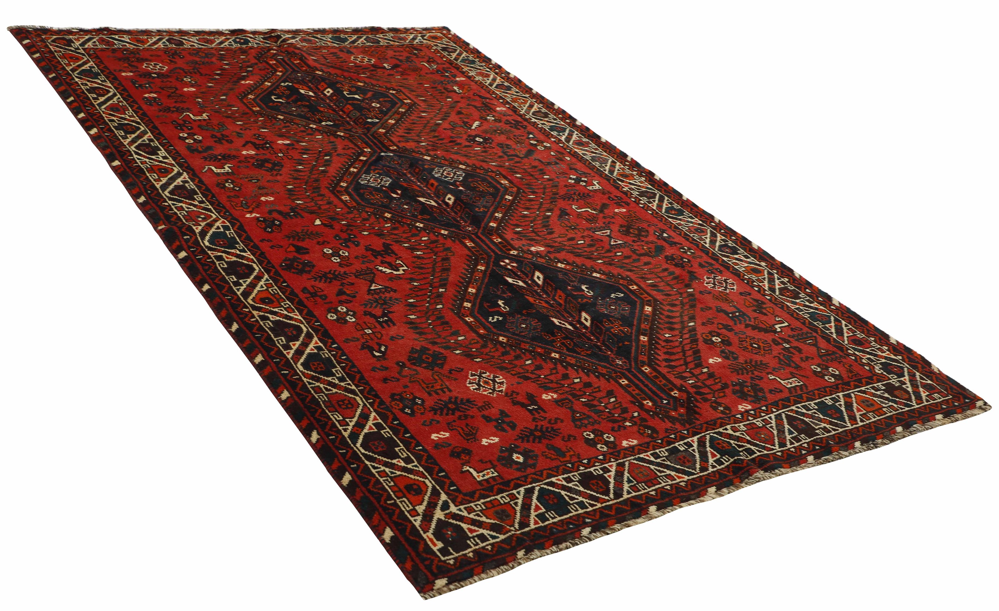 ShirazItem no.: 1489814 Size: 160 cm x 252 cmShiraz, with a population of about one million, is the capitol of the south-eastern province of Fars, and is situated in the Zargros Mountains. Shiraz is an age-old city, which has been the capitol of Iran several times, and it is known as the city of roses and nightingales. It has a reputation of being very relaxed, with a “ we will get around to that tomorrow”-attitude. Shiraz has laid name to rugs that are knotted in the small towns and villages surrounding it, from where they are brought to the city to be sold. The local tribes like the Kashghai, whose best works are even finer and more densely knotted than those knotted in Shiraz itself, also make them. Shiraz rugs are characterised by a deep claret colour, combined with dark blue and small areas of white and green. The wool is soft, and darker wool, sometimes mixed with goat’s hair, is used for both warp and weft. The patterns are coarse and geometrical, often identical to the Kashghai patterns. Often, small, geometrical birds and animals brighten them up. Shiraz rugs are made in all sizes, although big rugs are rare.