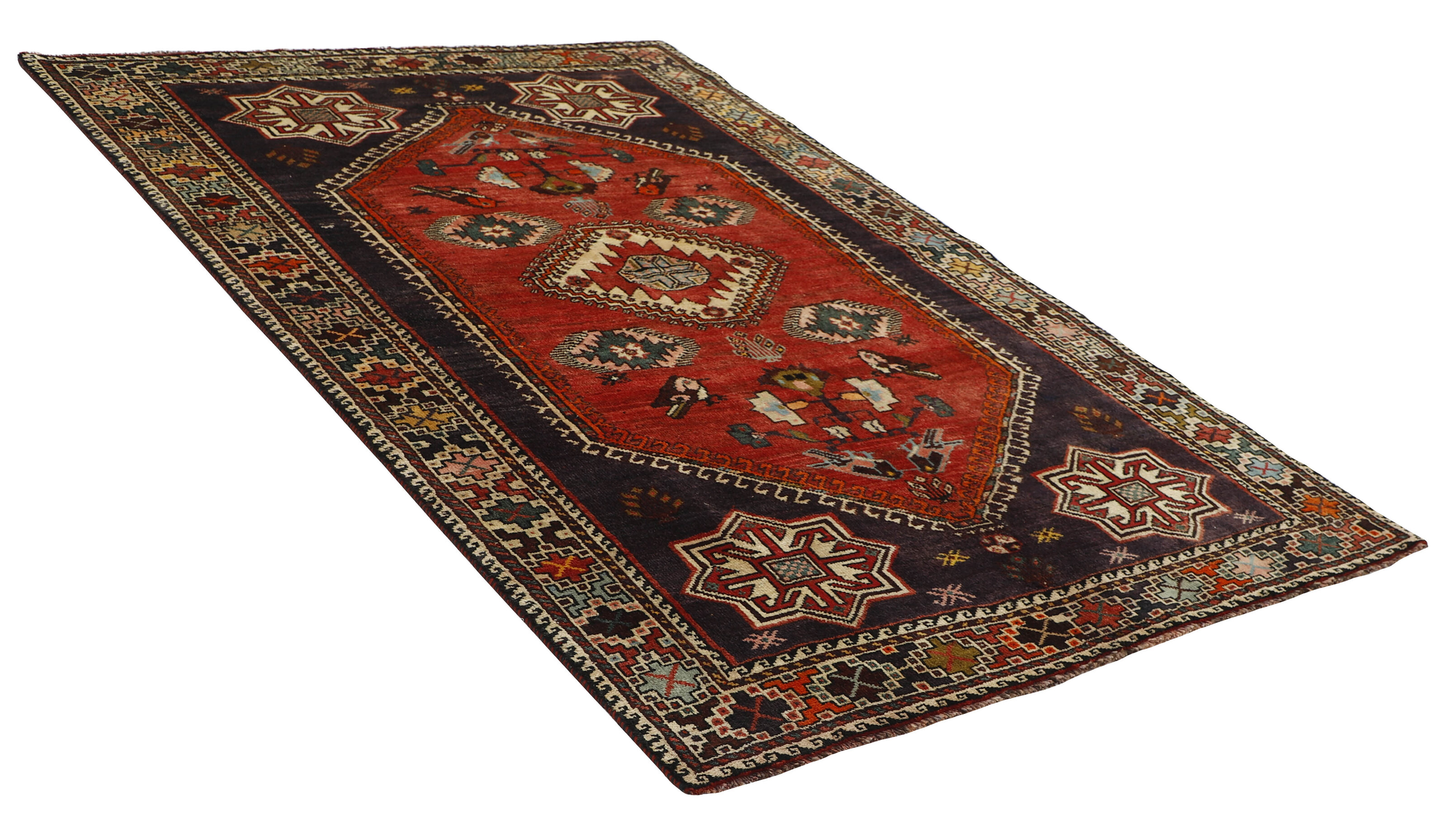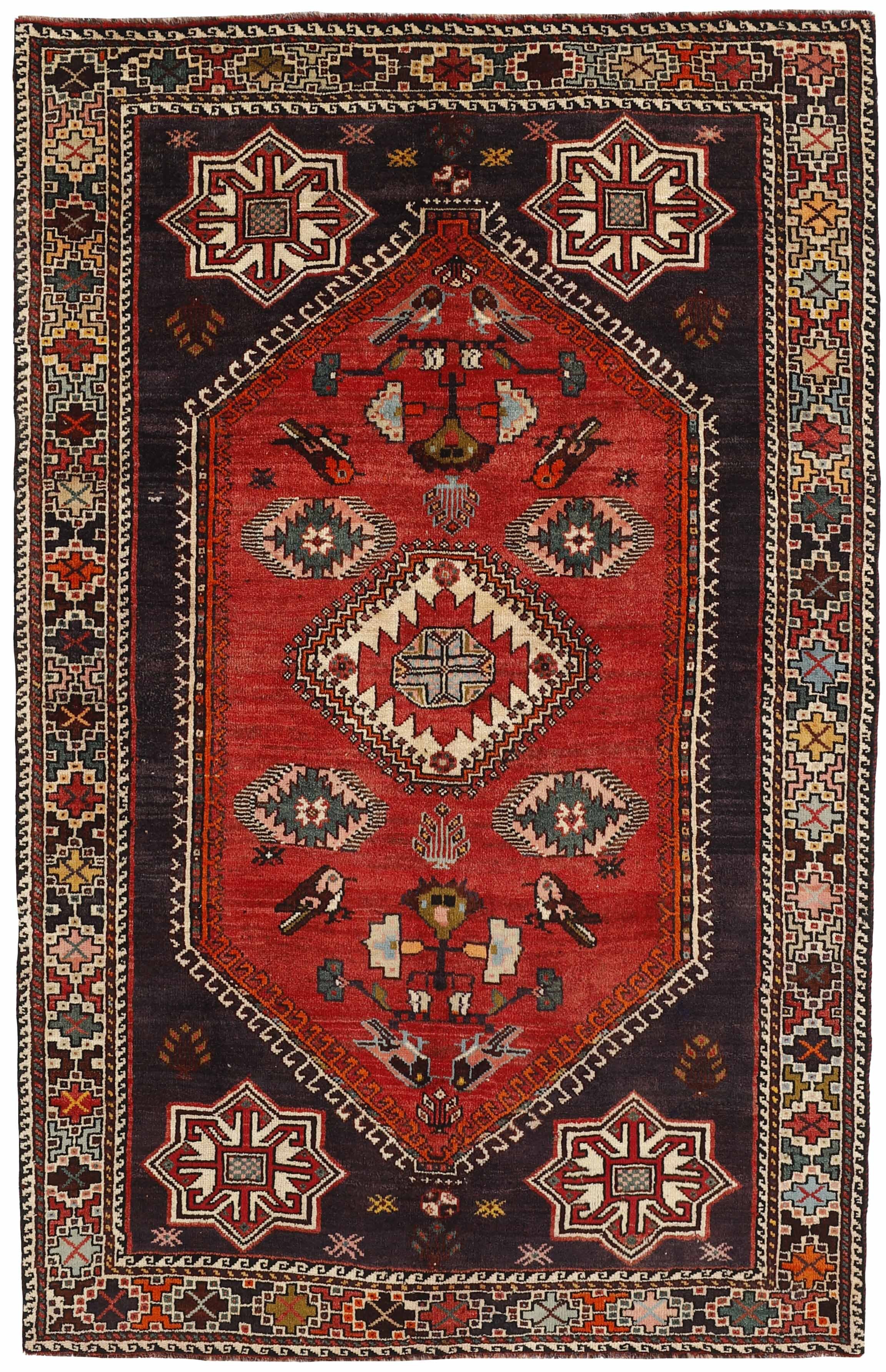 ShirazItem no.: 1489821 Size: 158 cm x 247 cmShiraz, with a population of about one million, is the capitol of the south-eastern province of Fars, and is situated in the Zargros Mountains. Shiraz is an age-old city, which has been the capitol of Iran several times, and it is known as the city of roses and nightingales. It has a reputation of being very relaxed, with a “ we will get around to that tomorrow”-attitude. Shiraz has laid name to rugs that are knotted in the small towns and villages surrounding it, from where they are brought to the city to be sold. The local tribes like the Kashghai, whose best works are even finer and more densely knotted than those knotted in Shiraz itself, also make them. Shiraz rugs are characterised by a deep claret colour, combined with dark blue and small areas of white and green. The wool is soft, and darker wool, sometimes mixed with goat’s hair, is used for both warp and weft. The patterns are coarse and geometrical, often identical to the Kashghai patterns. Often, small, geometrical birds and animals brighten them up. Shiraz rugs are made in all sizes, although big rugs are rare.