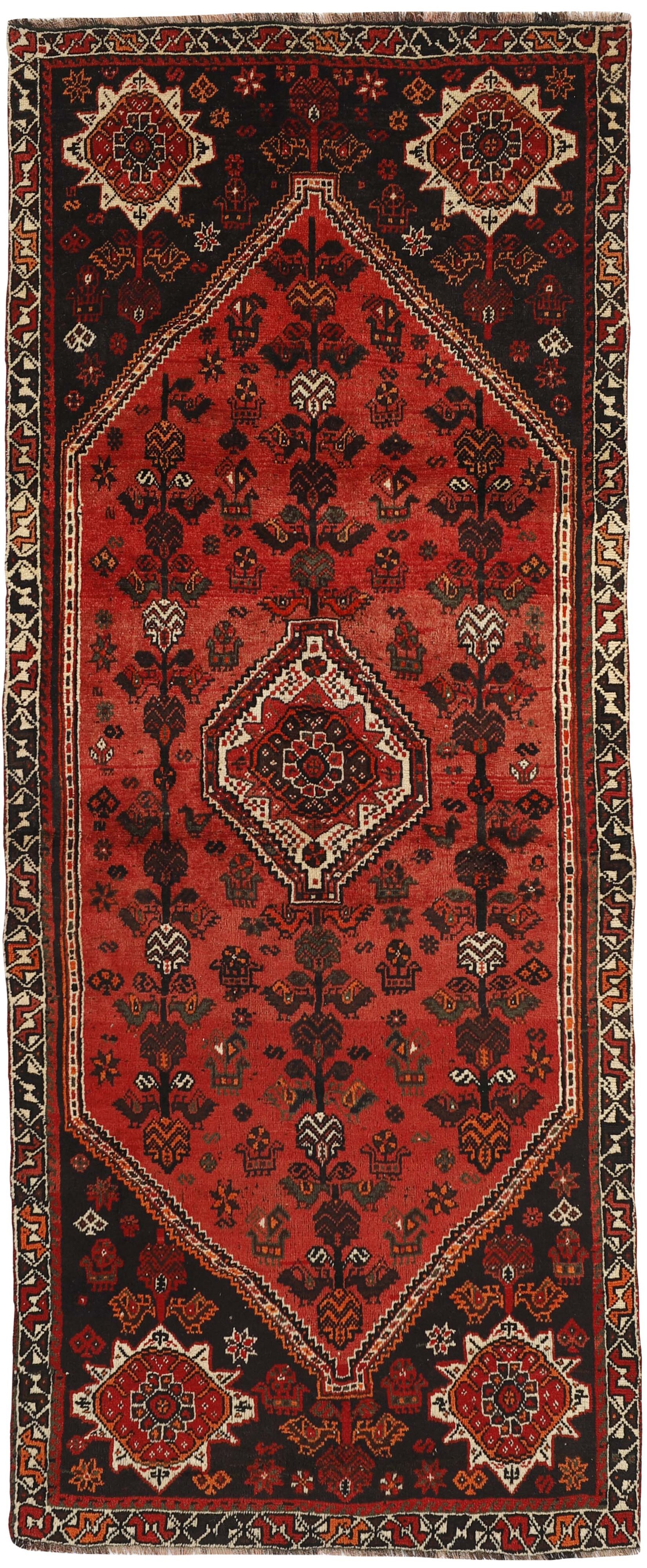 ShirazItem no.: 1489822 Size: 121 cm x 296 cmShiraz, with a population of about one million, is the capitol of the south-eastern province of Fars, and is situated in the Zargros Mountains. Shiraz is an age-old city, which has been the capitol of Iran several times, and it is known as the city of roses and nightingales. It has a reputation of being very relaxed, with a “ we will get around to that tomorrow”-attitude. Shiraz has laid name to rugs that are knotted in the small towns and villages surrounding it, from where they are brought to the city to be sold. The local tribes like the Kashghai, whose best works are even finer and more densely knotted than those knotted in Shiraz itself, also make them. Shiraz rugs are characterised by a deep claret colour, combined with dark blue and small areas of white and green. The wool is soft, and darker wool, sometimes mixed with goat’s hair, is used for both warp and weft. The patterns are coarse and geometrical, often identical to the Kashghai patterns. Often, small, geometrical birds and animals brighten them up. Shiraz rugs are made in all sizes, although big rugs are rare.
